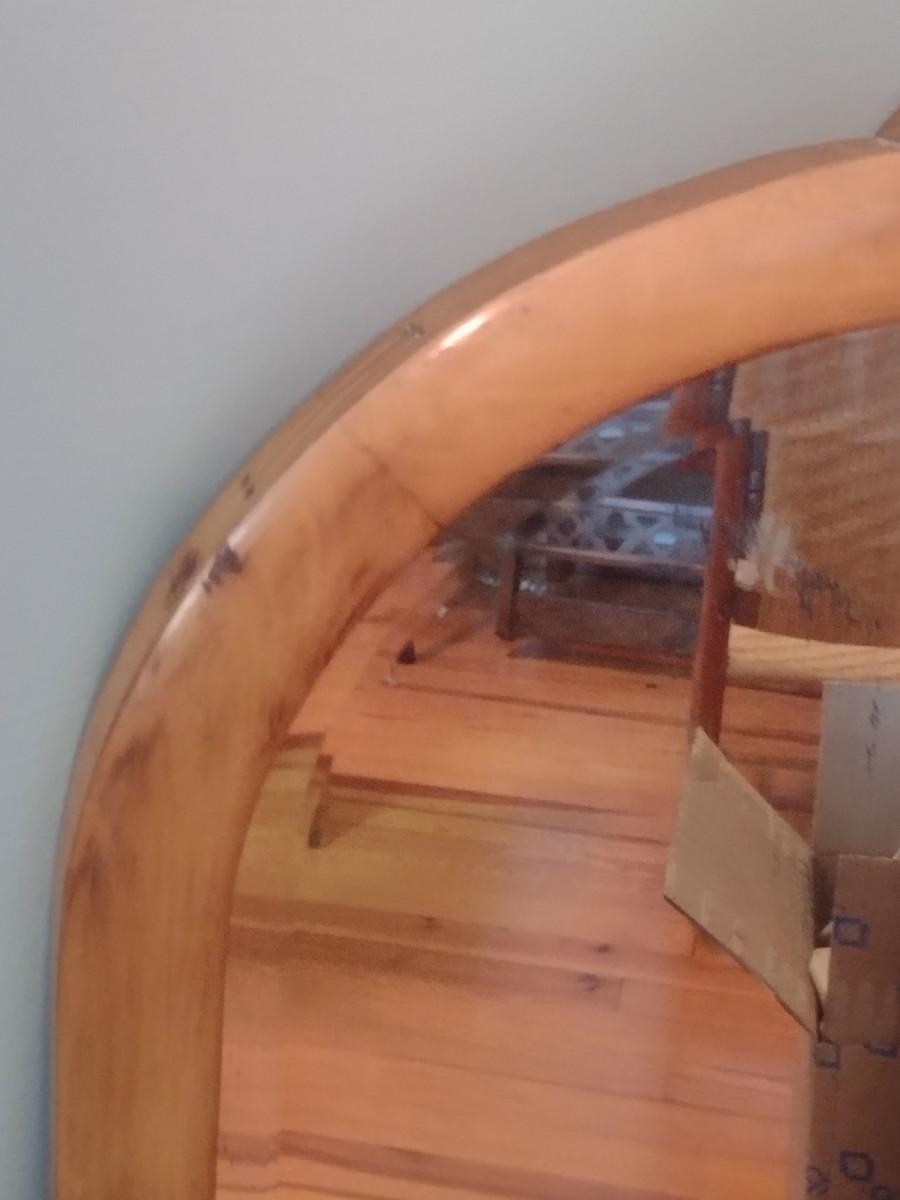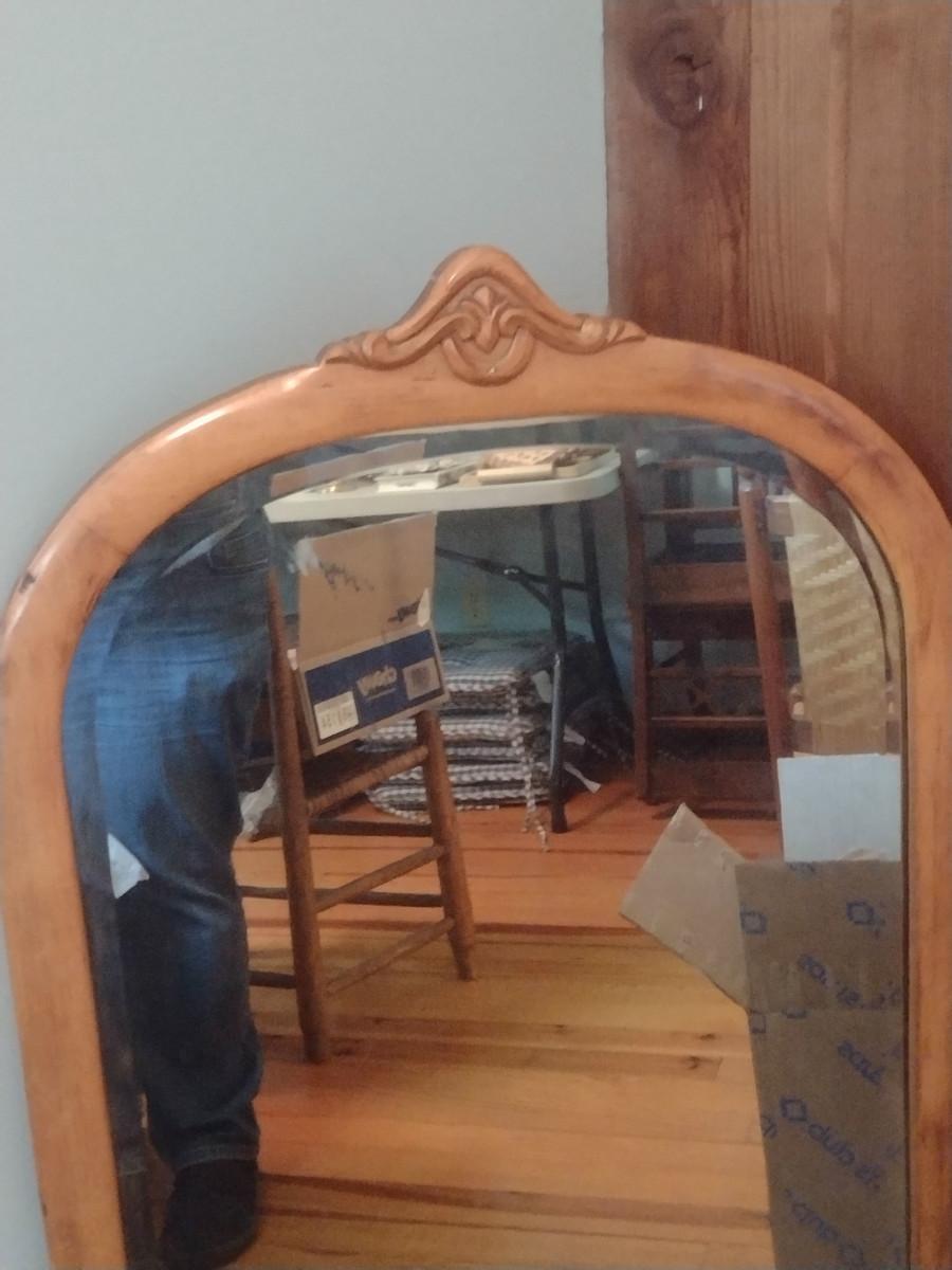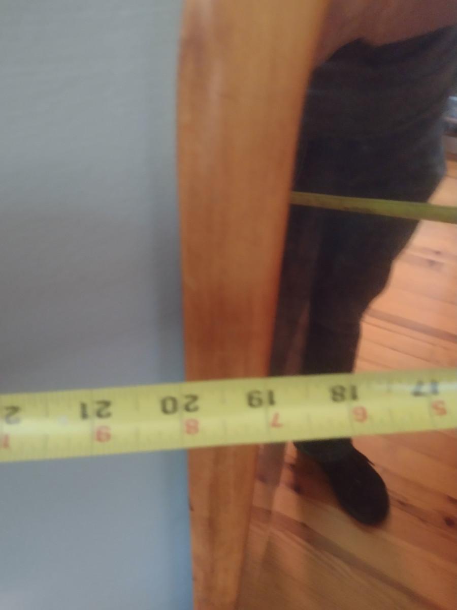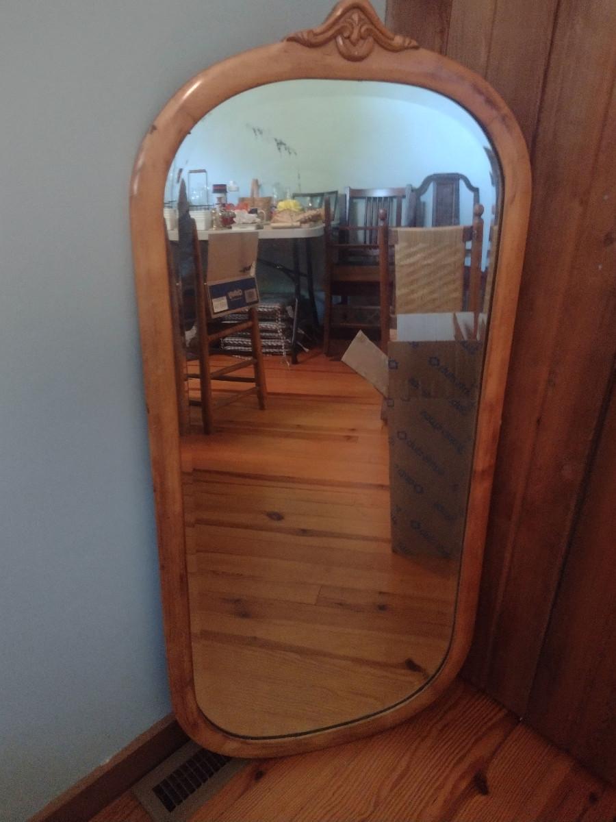 Wood Framed Mirror- Approx 44" x 20". Item may have been on a stand at one time- has holes for side supports. No wire or means of support on back. Item needs repair- top of frame is cracked- please see all pictures.