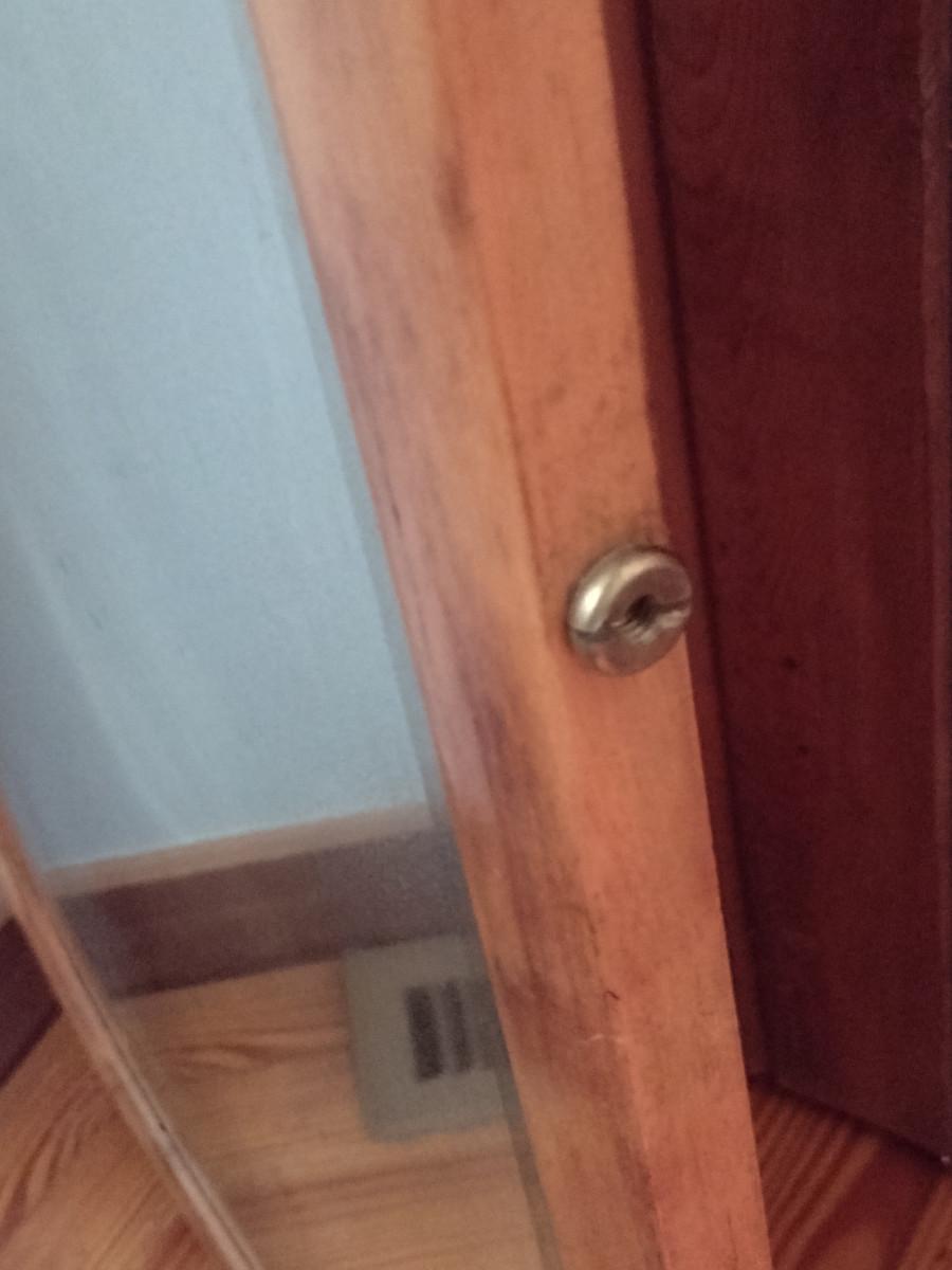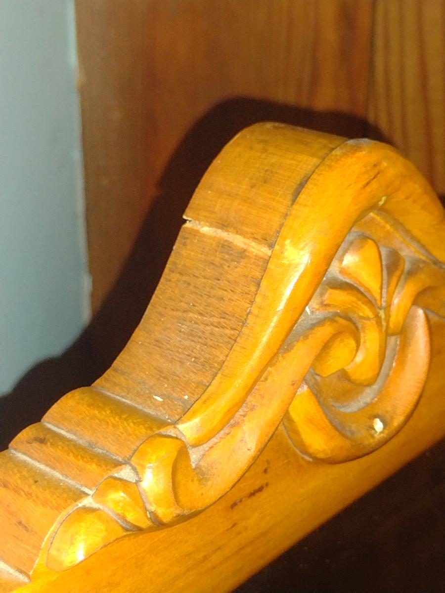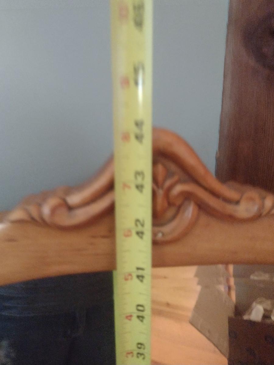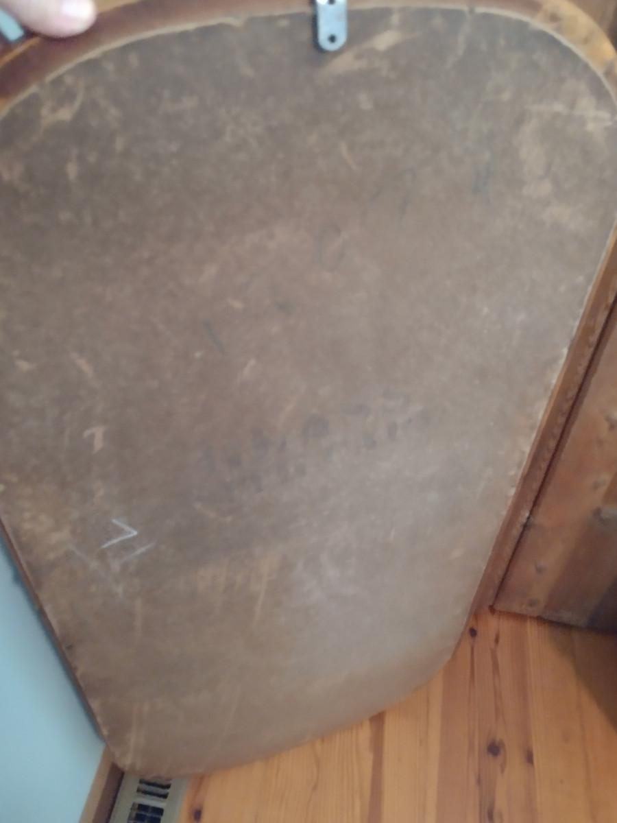 Wood Framed Mirror- Approx 44" x 20". Item may have been on a stand at one time- has holes for side supports. No wire or means of support on back. Item needs repair- top of frame is cracked- please see all pictures.