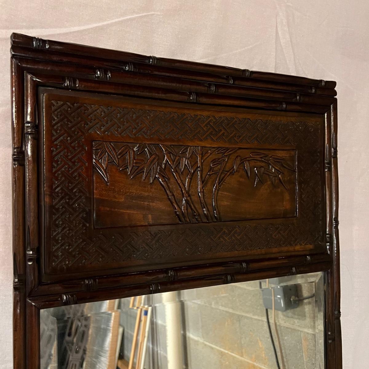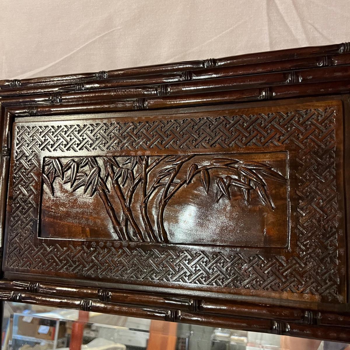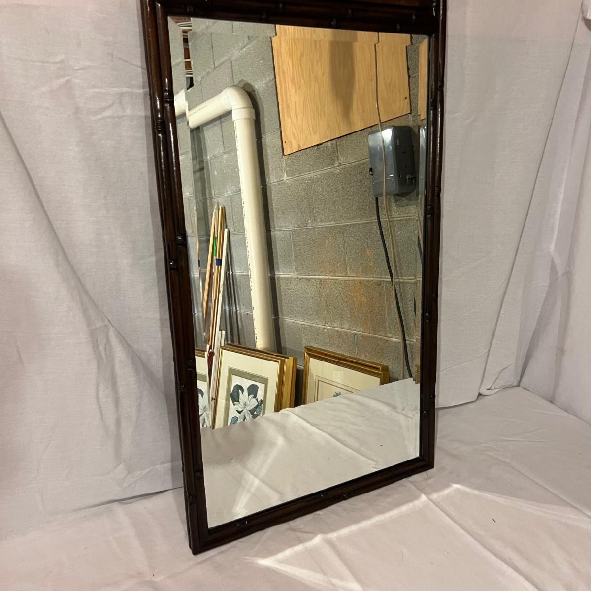 Dark stained “bamboo” decor wood mirror measures 19.75” x 1” x 44”H. The mirror’s style is in the top bamboo carved frame accented by a bamboo style all around.