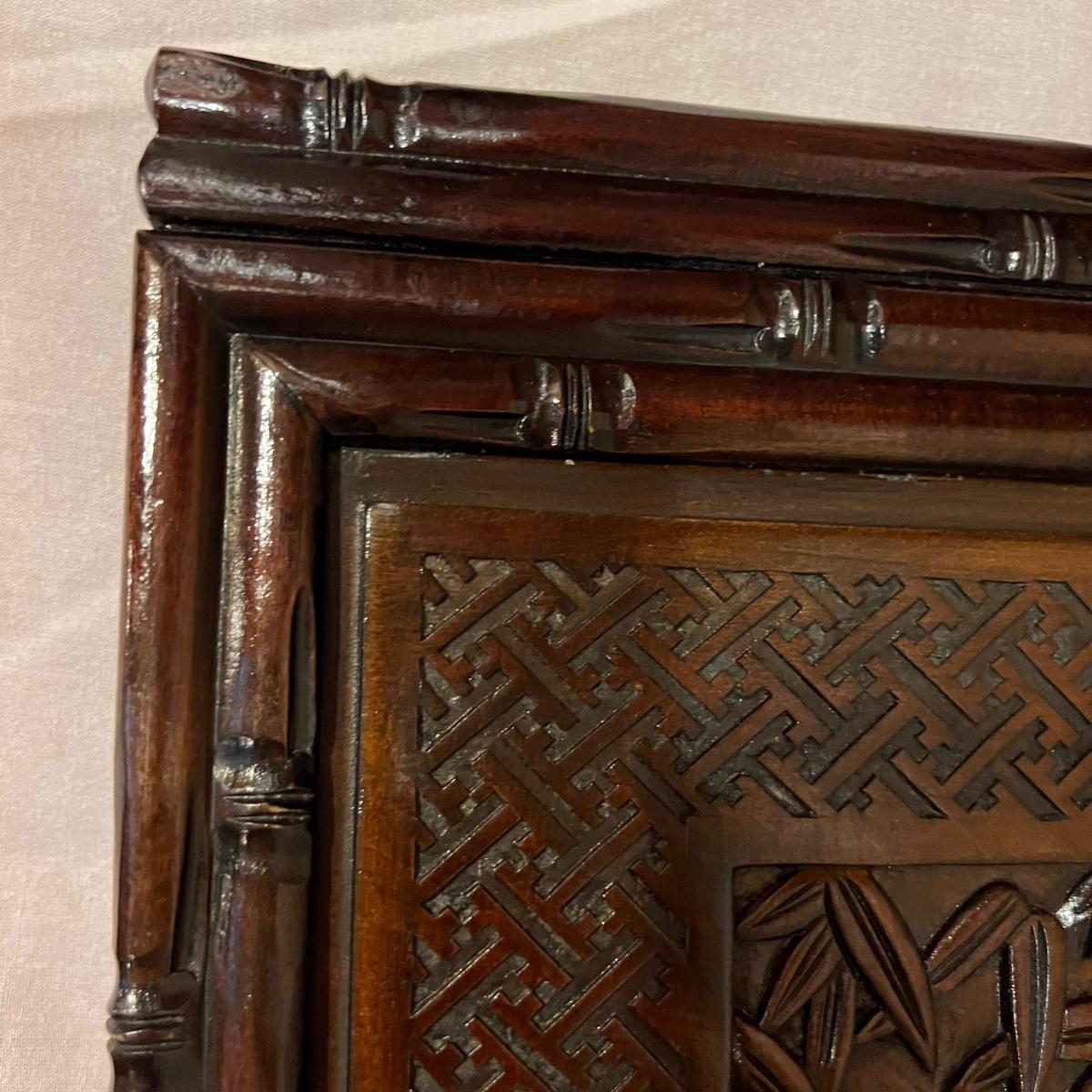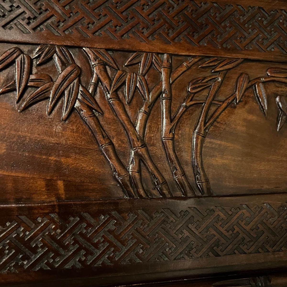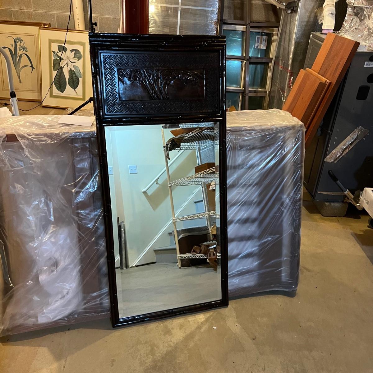 Dark stained “bamboo” decor wood mirror measures 19.75” x 1” x 44”H. The mirror’s style is in the top bamboo carved frame accented by a bamboo style all around.