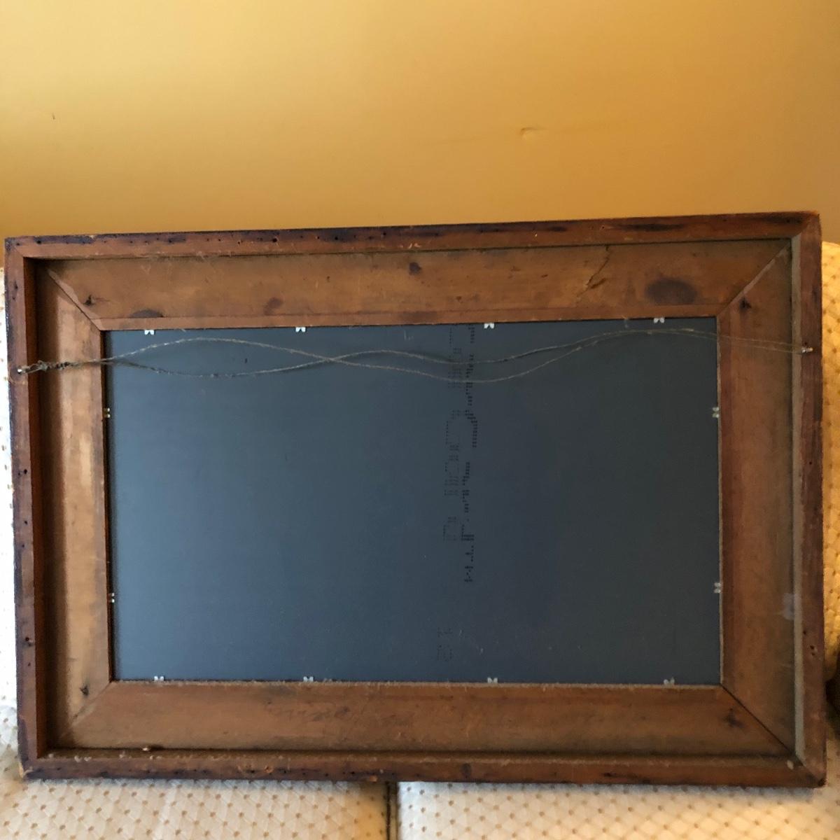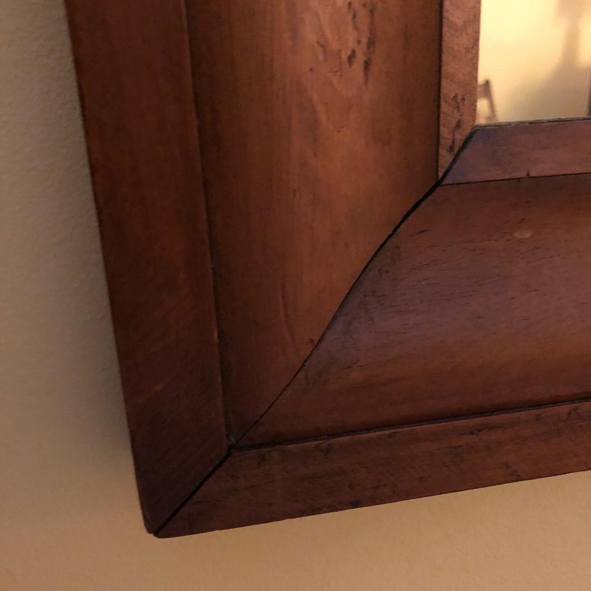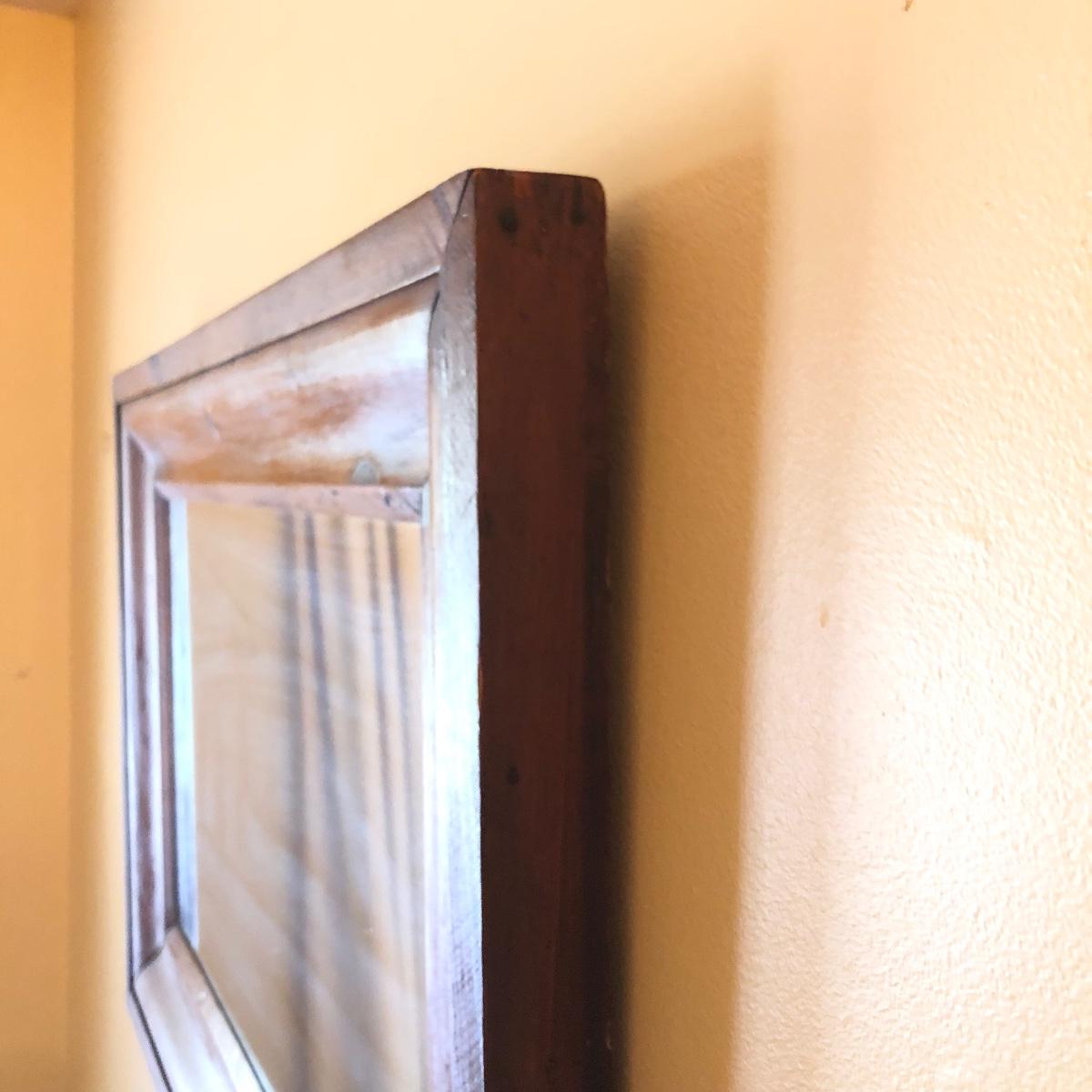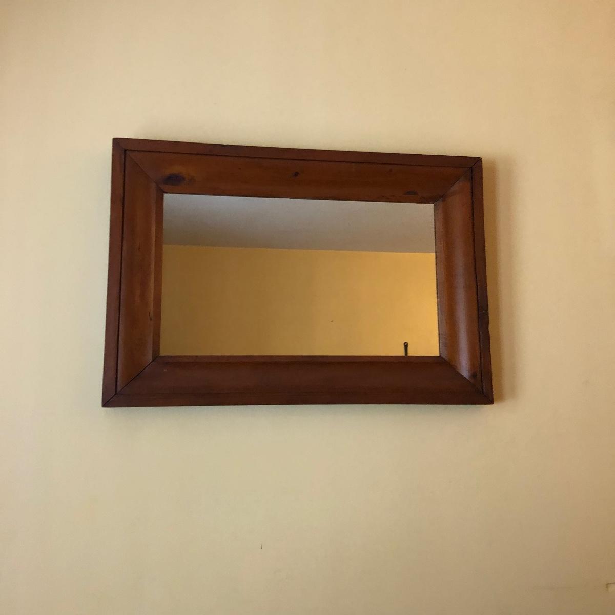 Lot includes a thick wooden framed mirror. Frame appears to be vintage with a newer mirror. Mirror measures 22” x 32” x 2”.