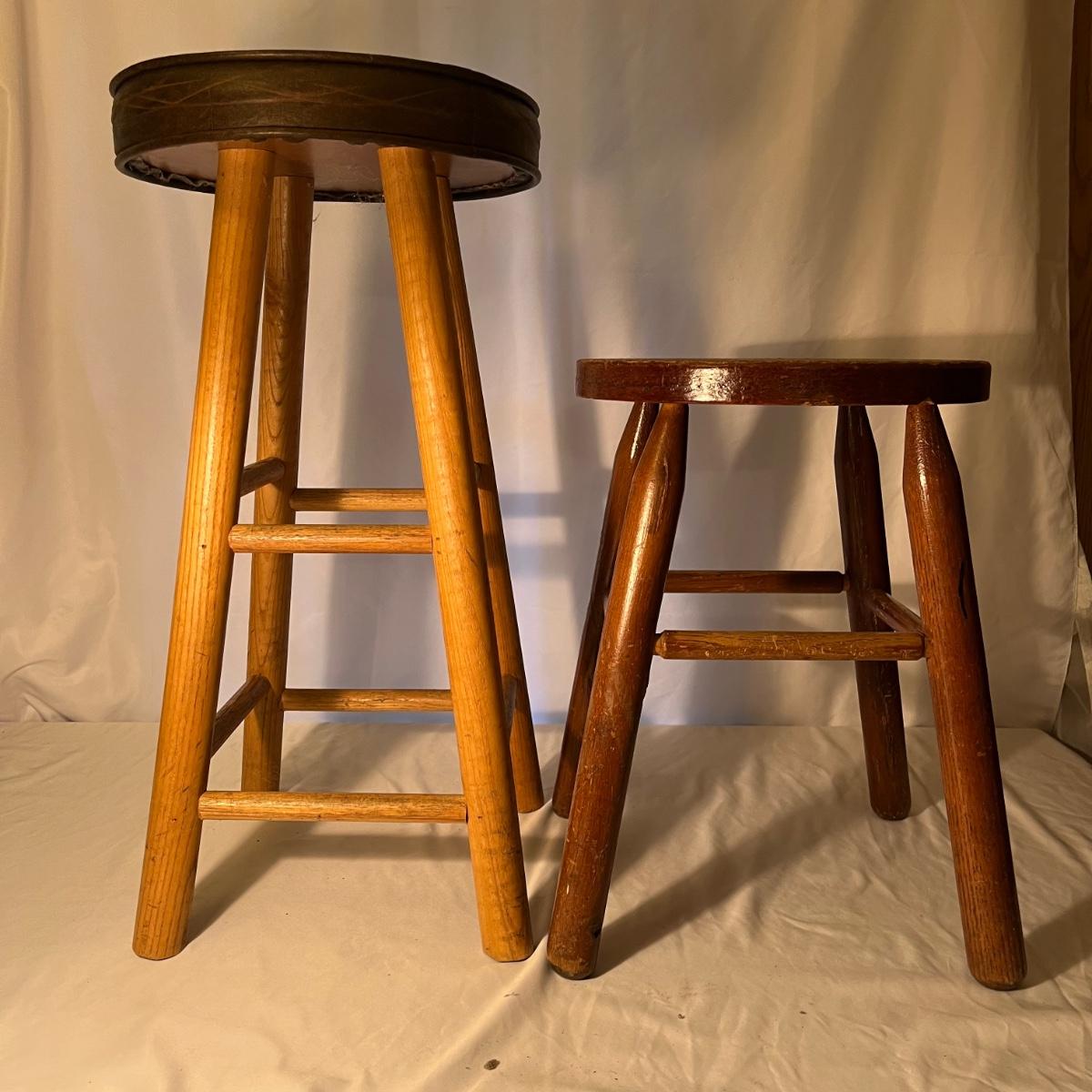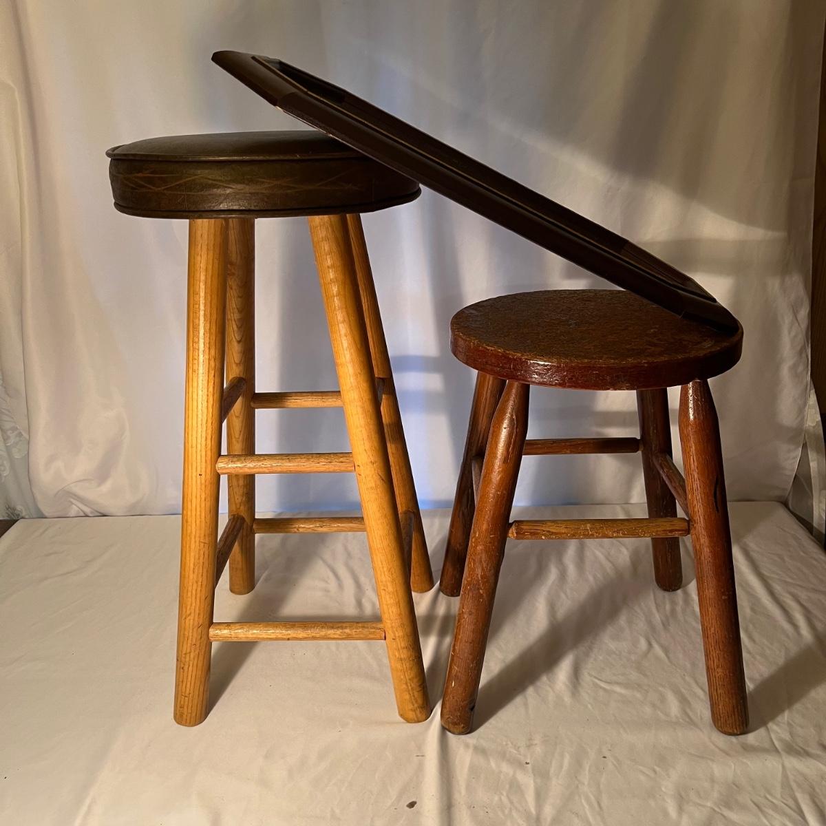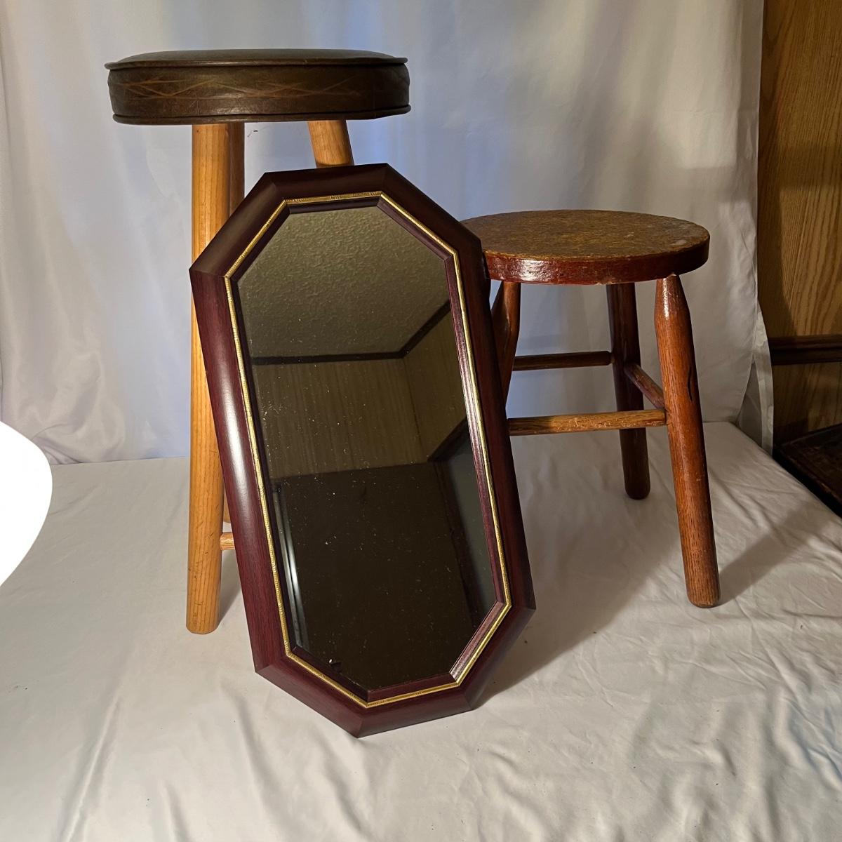 Lot includes a wooden framed mirror, one small stool and a 25” tall padded seat stool. Mirror measures 12” x 23”.
