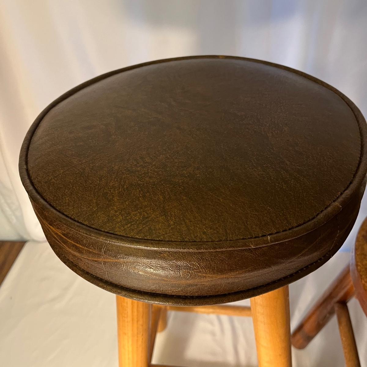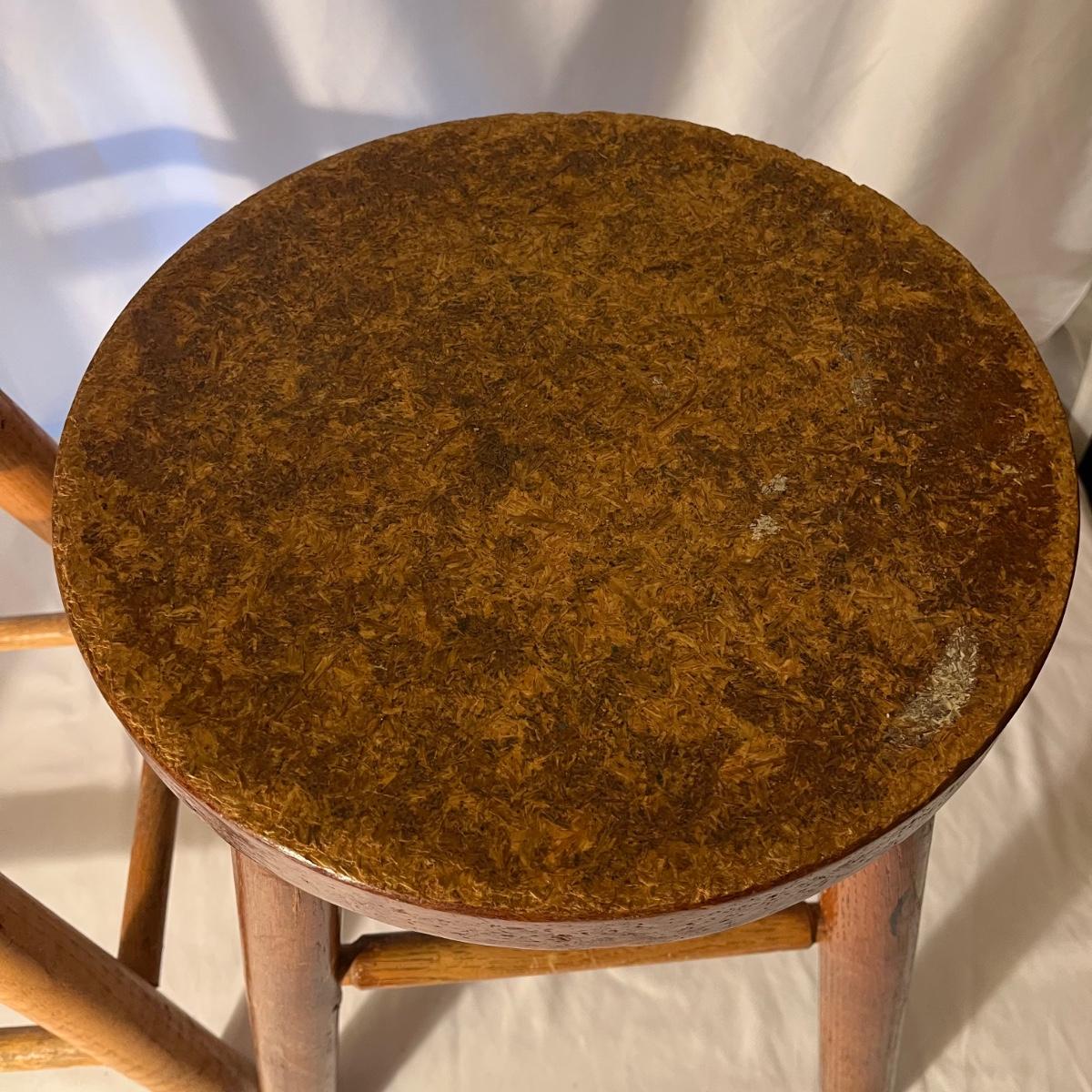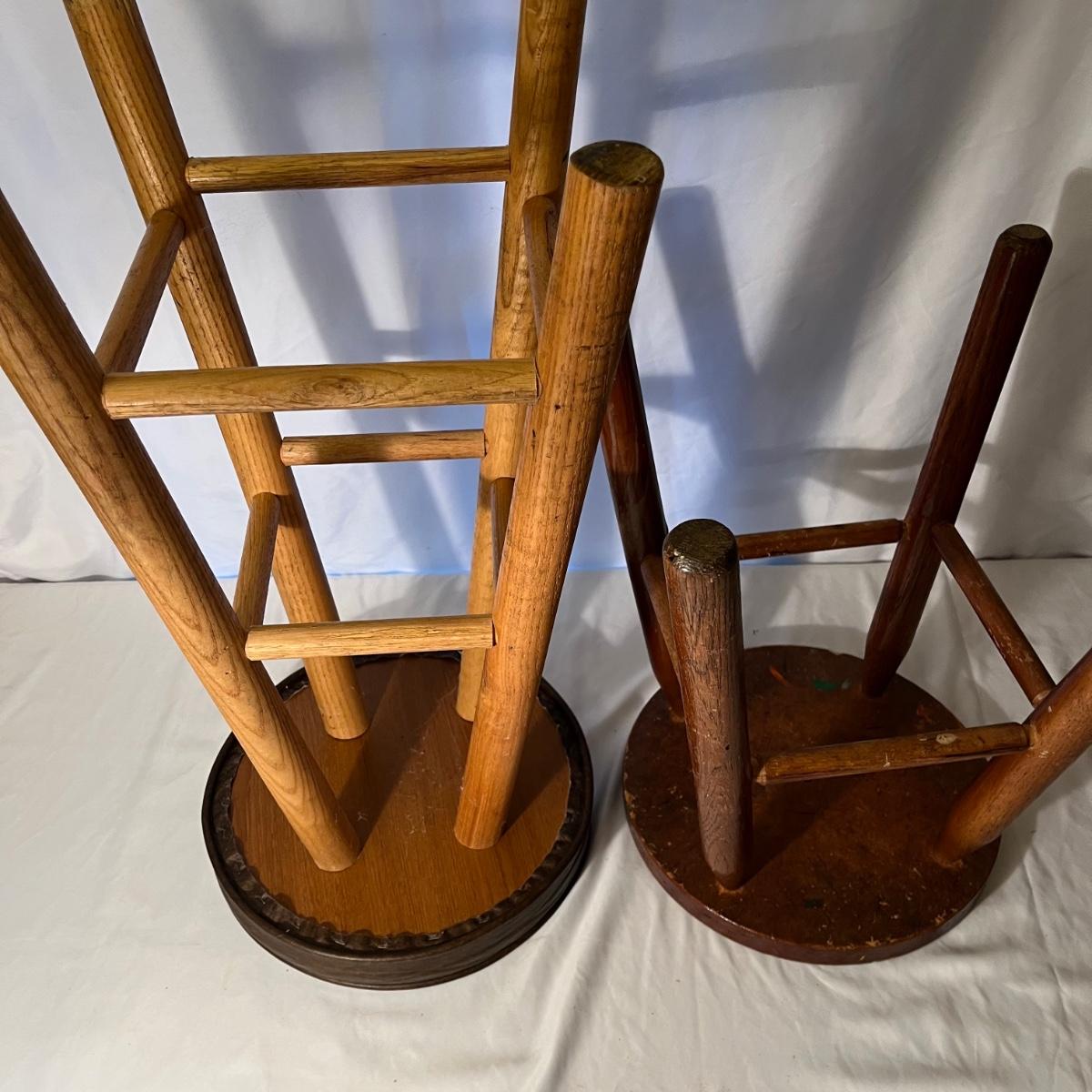 Lot includes a wooden framed mirror, one small stool and a 25” tall padded seat stool. Mirror measures 12” x 23”.