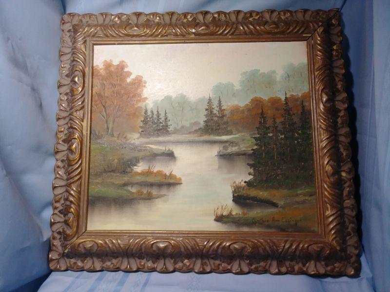 Wood Framed Painting of A River and Trees 20"W x 18"H