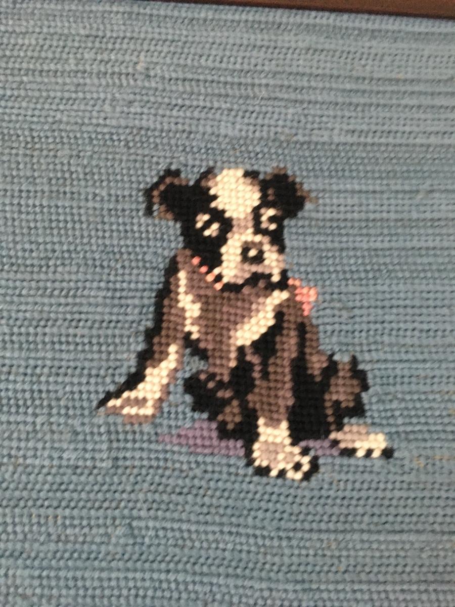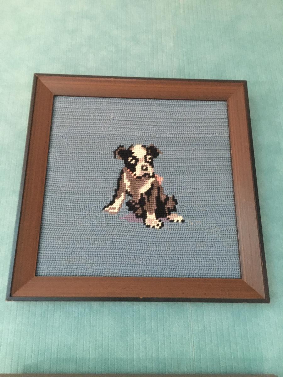 Wood framed needlepoint of sitting dog. Excellent condition.