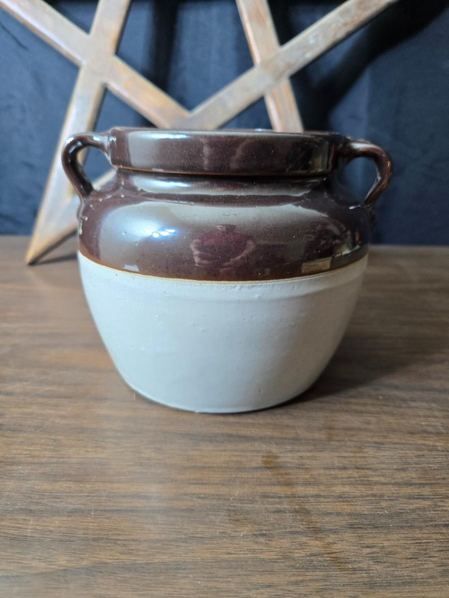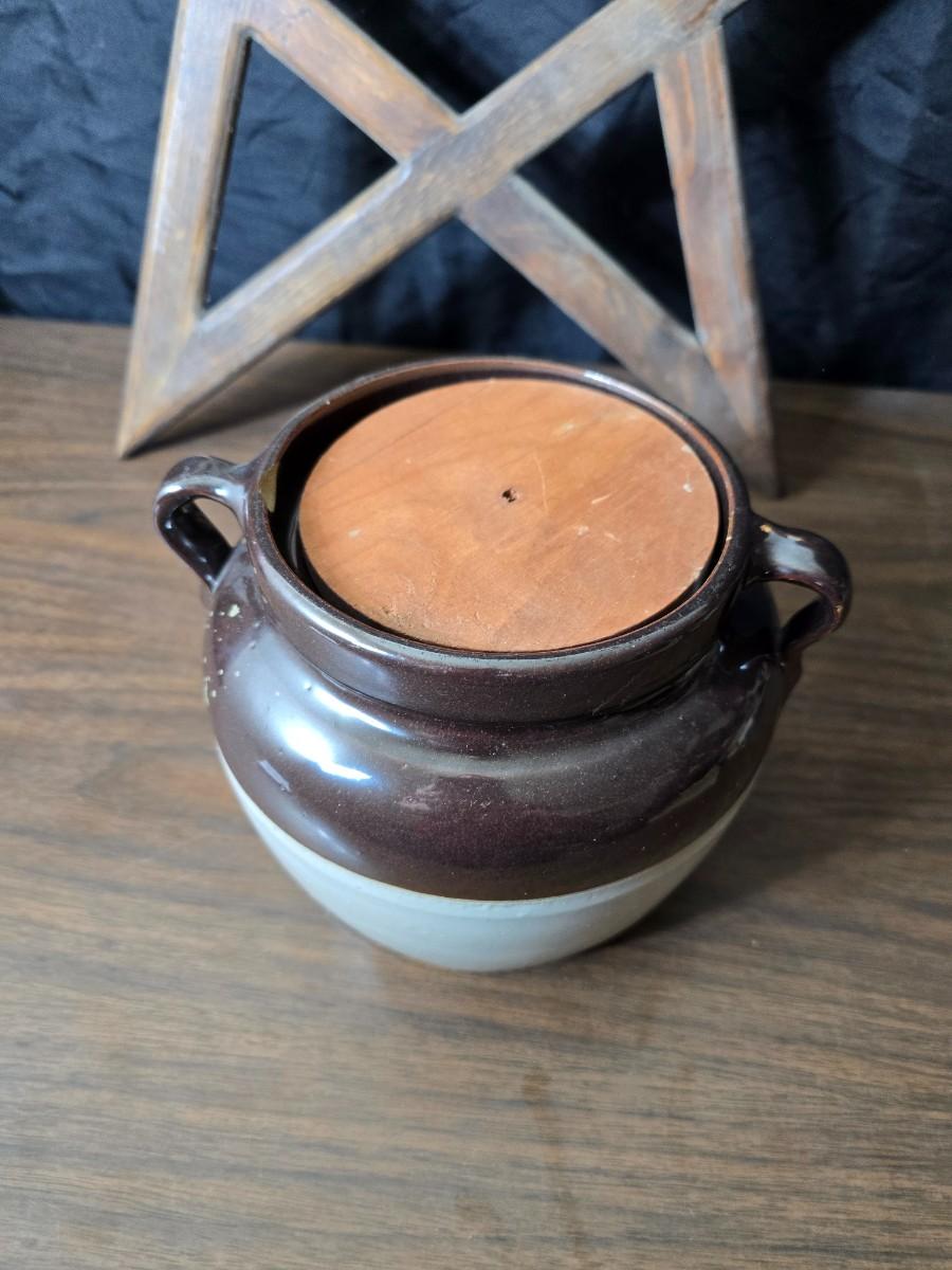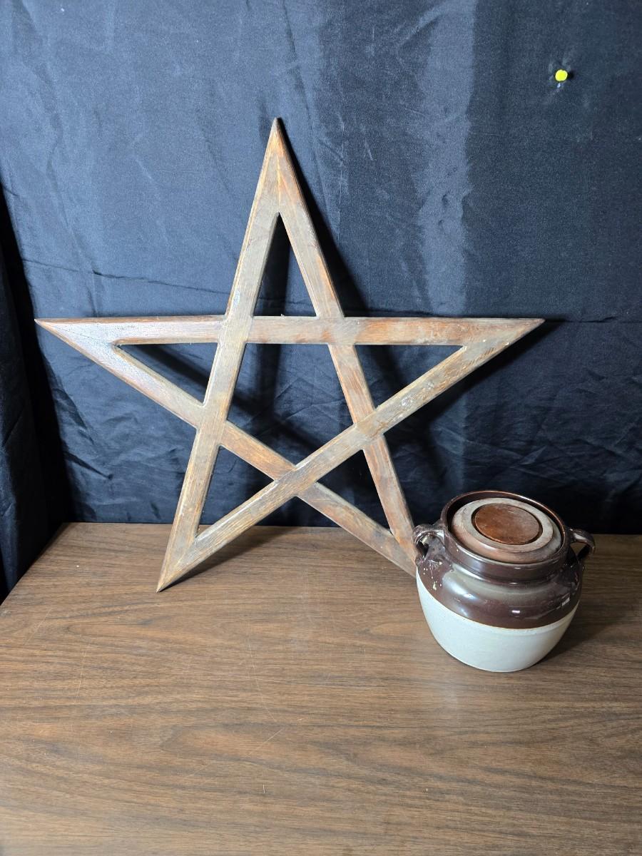 Wood framed star and a small 201 marked crock bean pot with double handles