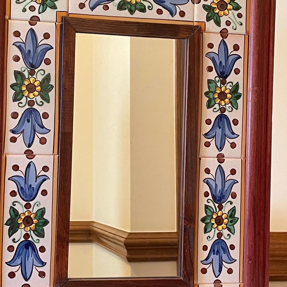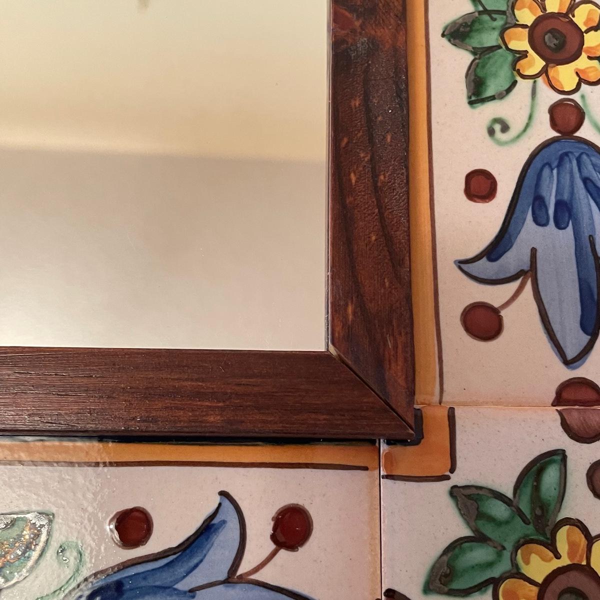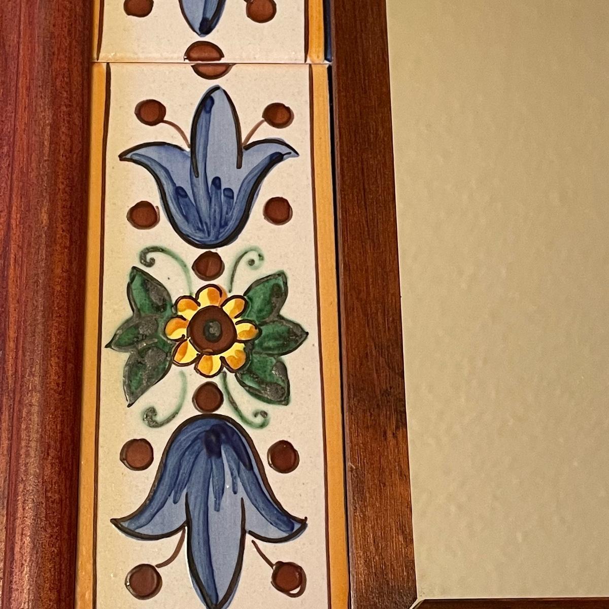 This attractive mirror is housed in a sturdy wood frame that has a pretty tiled surround.
