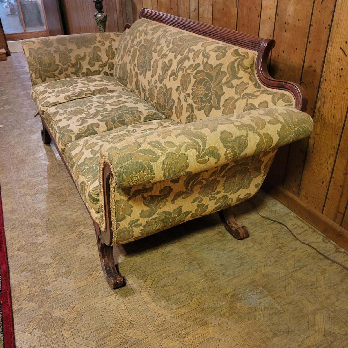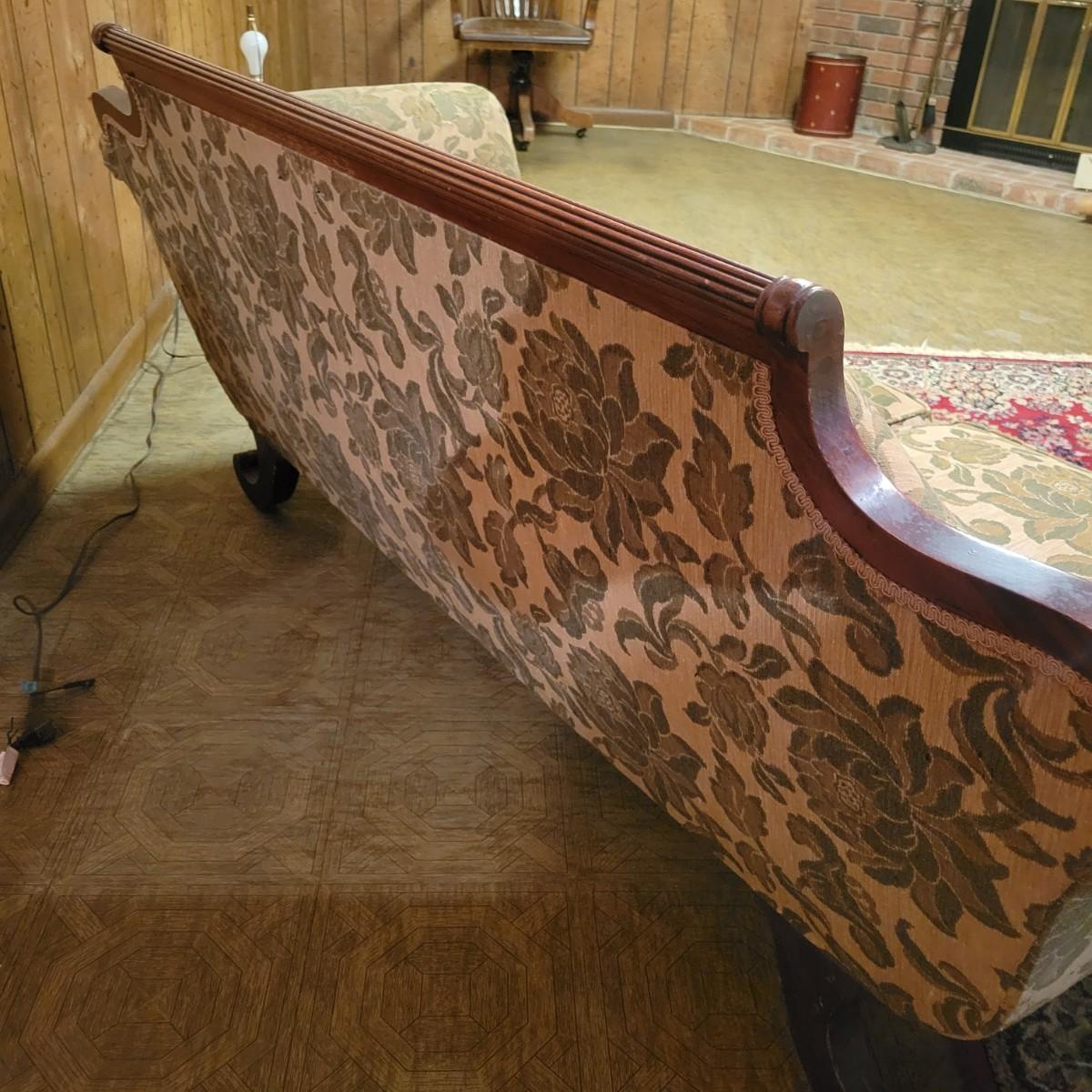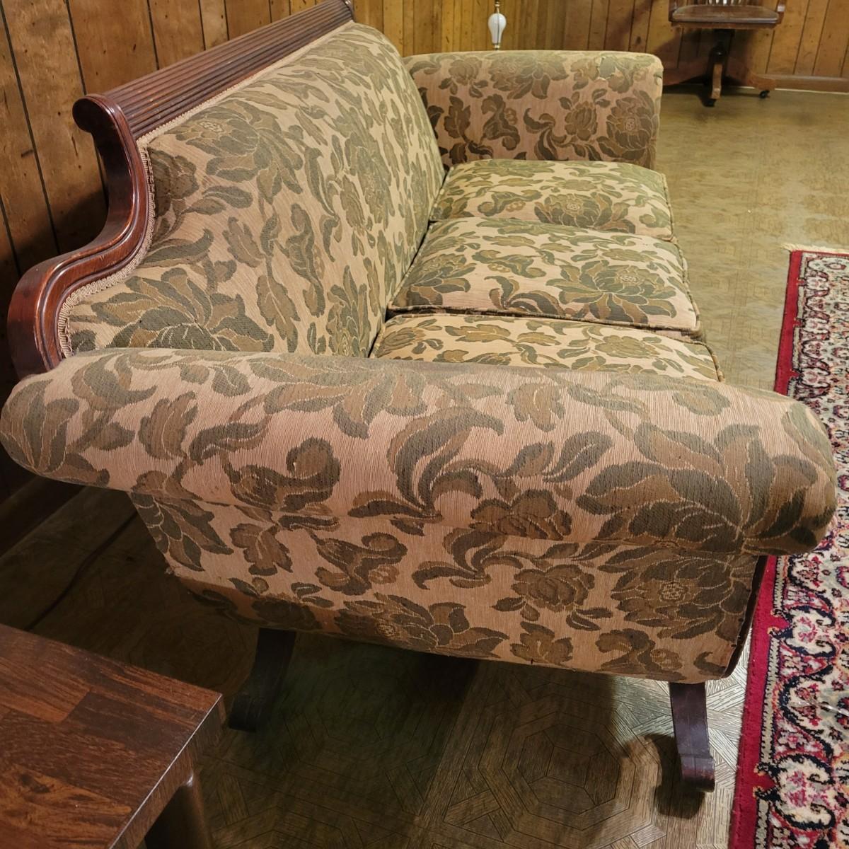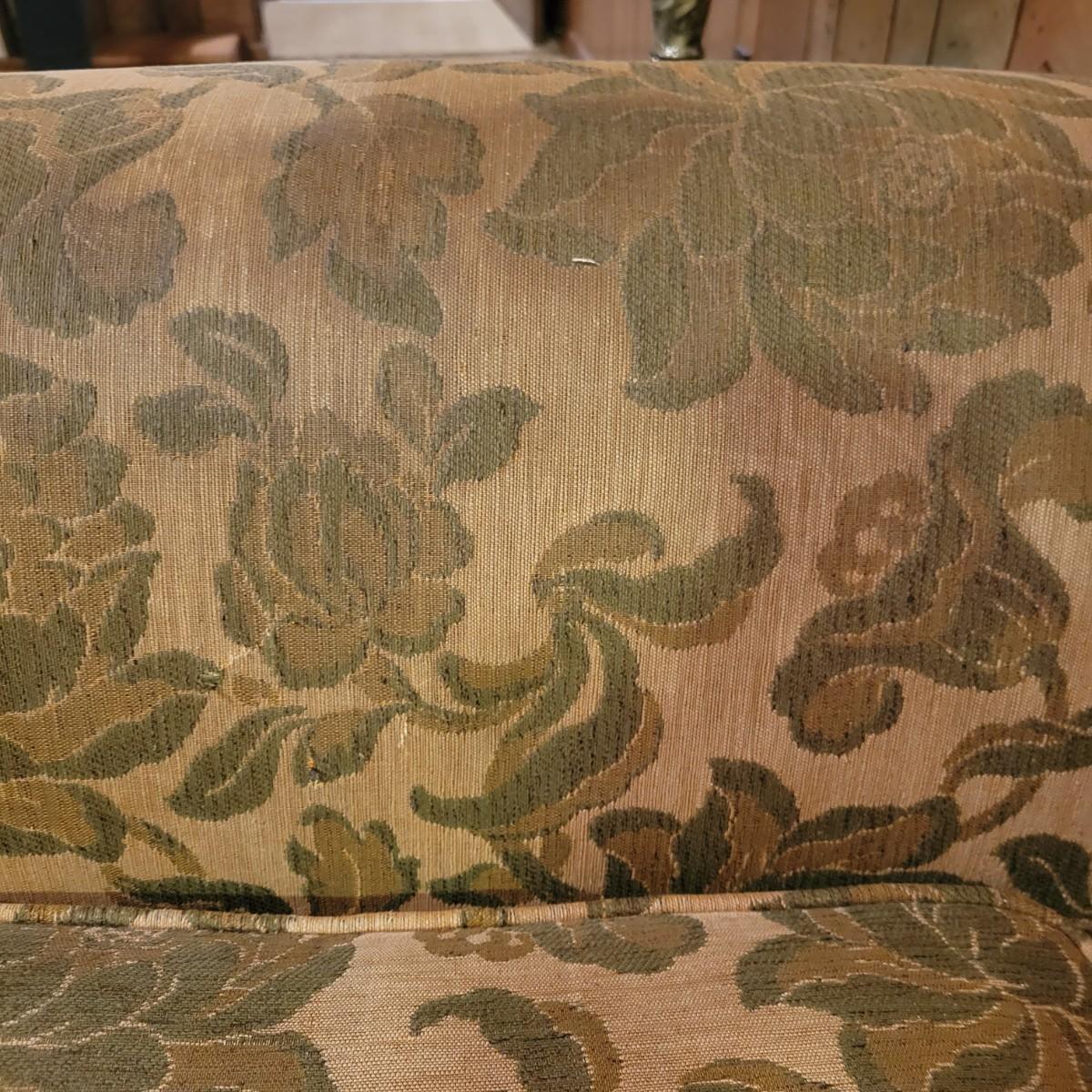A vintage upholstered couch with a wooden frame. This couch has a cream colored upholstery with green and olive colored floral pattern. There are some areas that are showing use and are threadbare. Measures approximately 76" x 30" x 32.5"H with a seat height of 17.5". Local pickup only. Winning bidder must bring assistance to help move and load this item due to its weight and/or size.