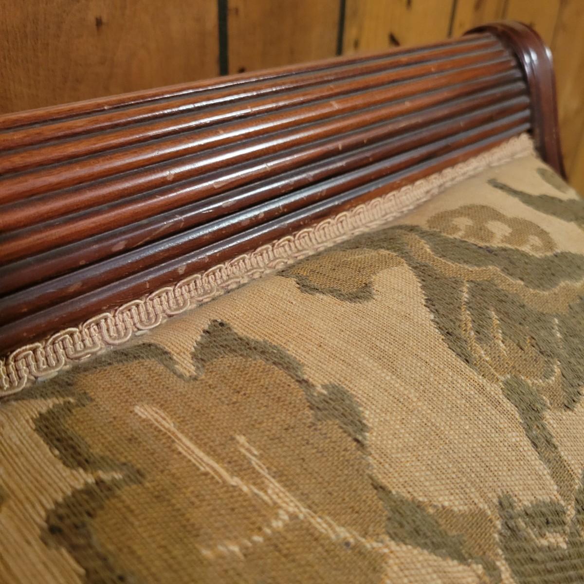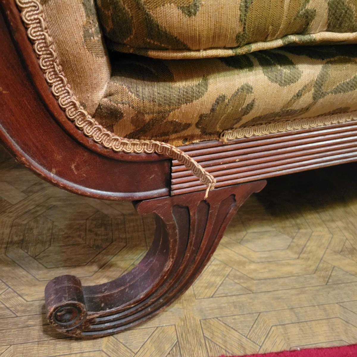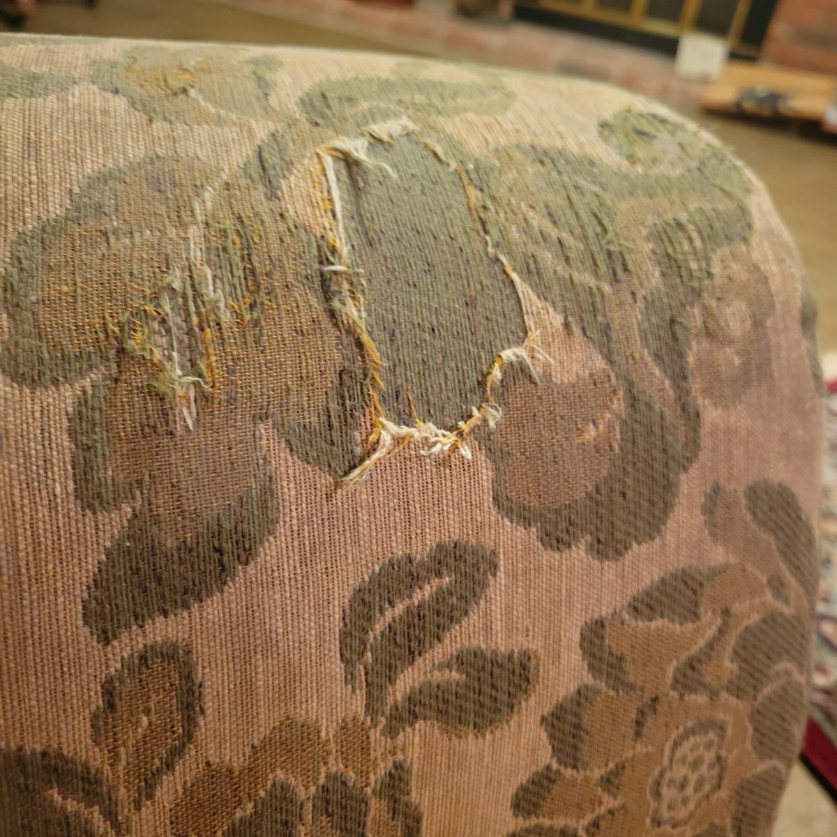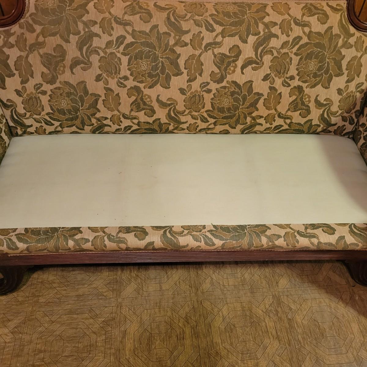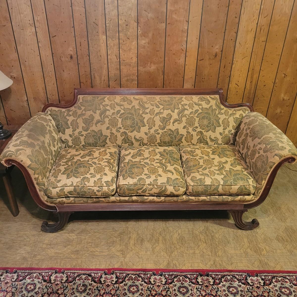 A vintage upholstered couch with a wooden frame. This couch has a cream colored upholstery with green and olive colored floral pattern. There are some areas that are showing use and are threadbare. Measures approximately 76" x 30" x 32.5"H with a seat height of 17.5". Local pickup only. Winning bidder must bring assistance to help move and load this item due to its weight and/or size.