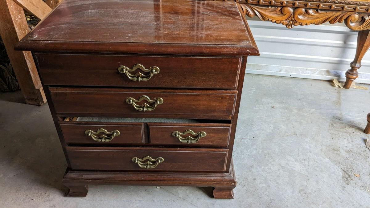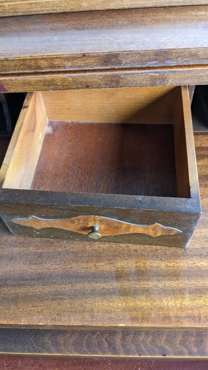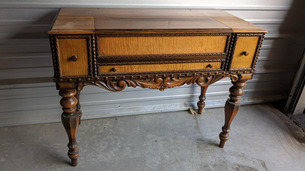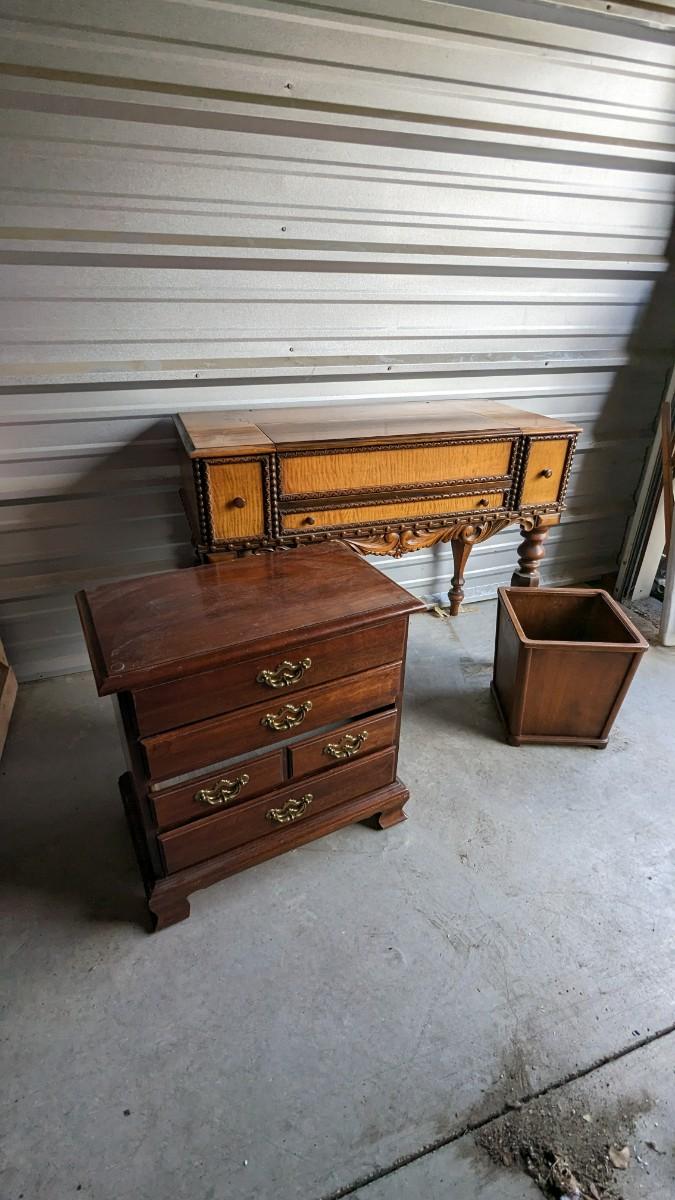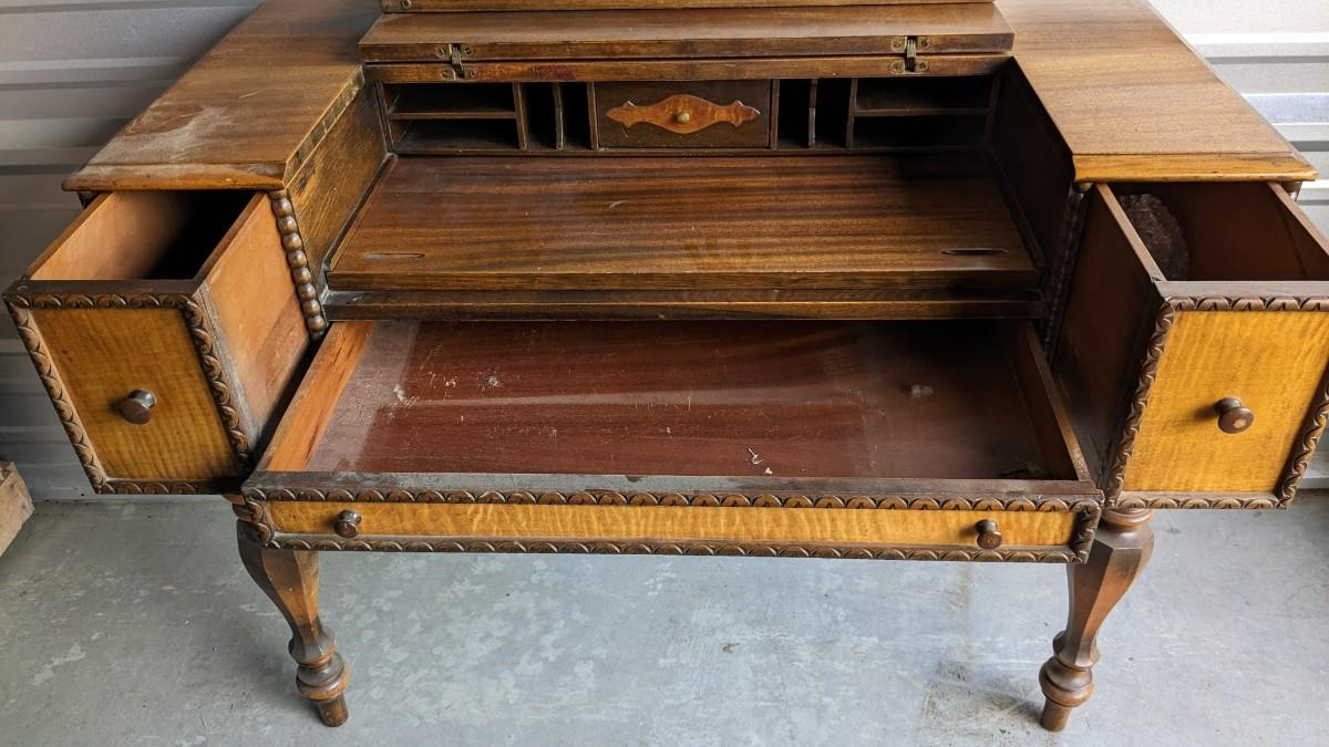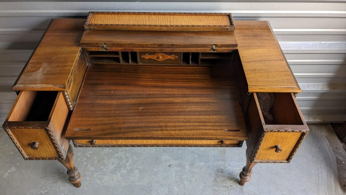includes beautiful 41.75"x 19.75" x 33" desk, small waste basket and side table, please note top drawer is jammed on this piece. No shipping. 2604