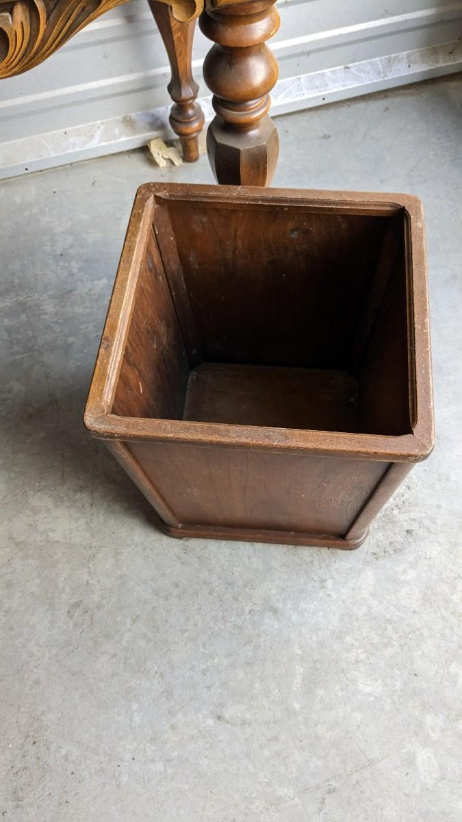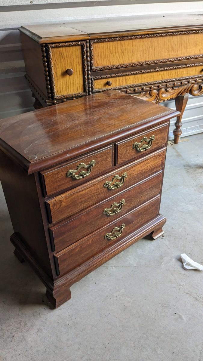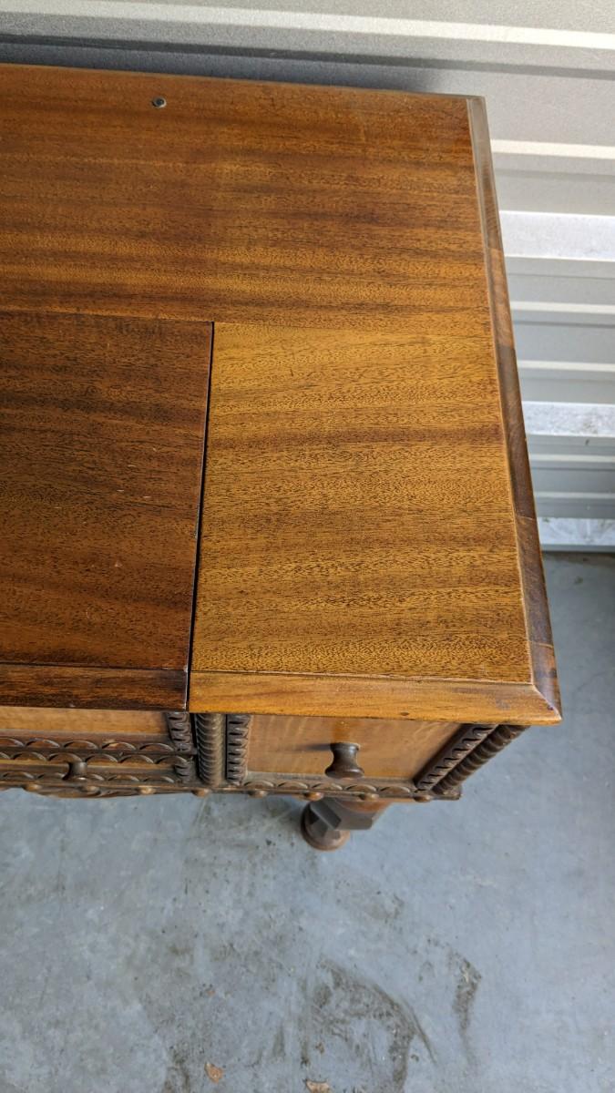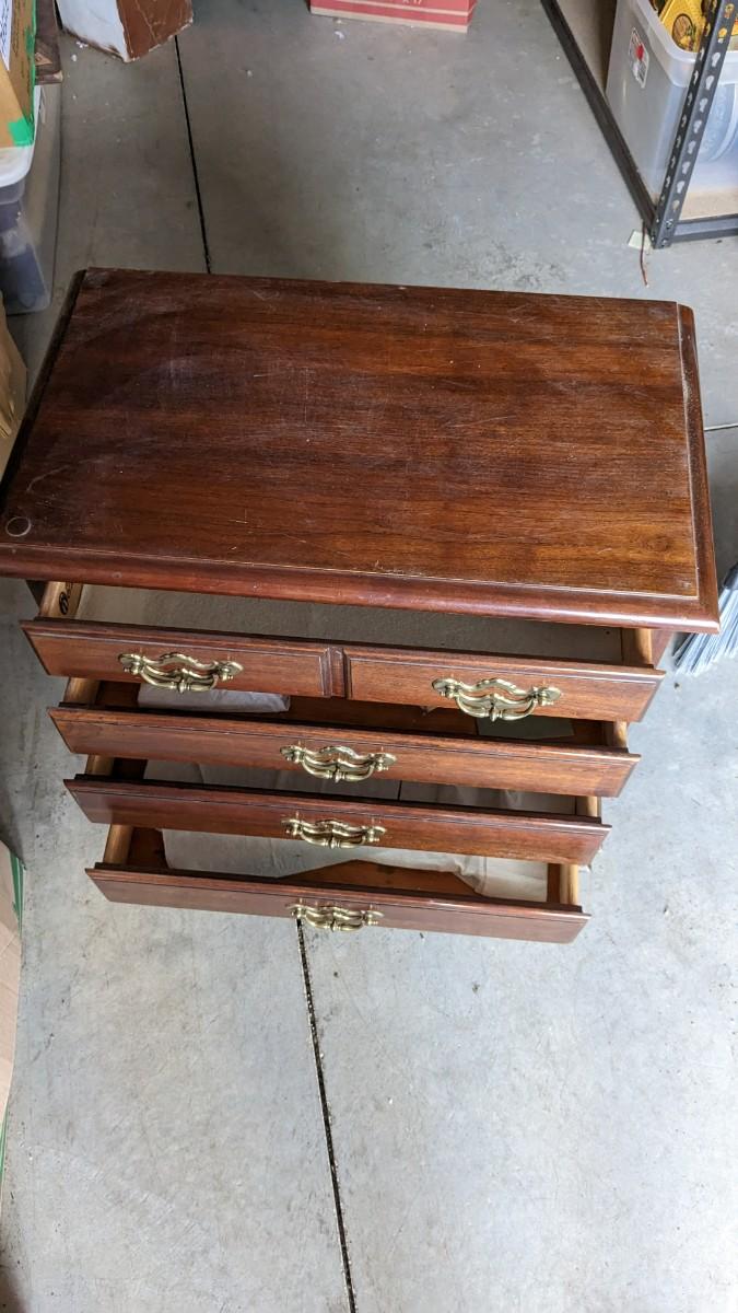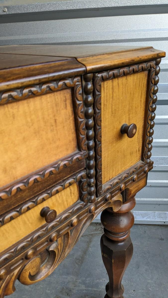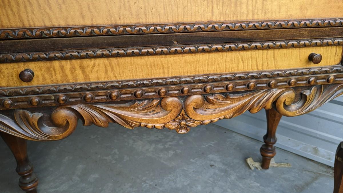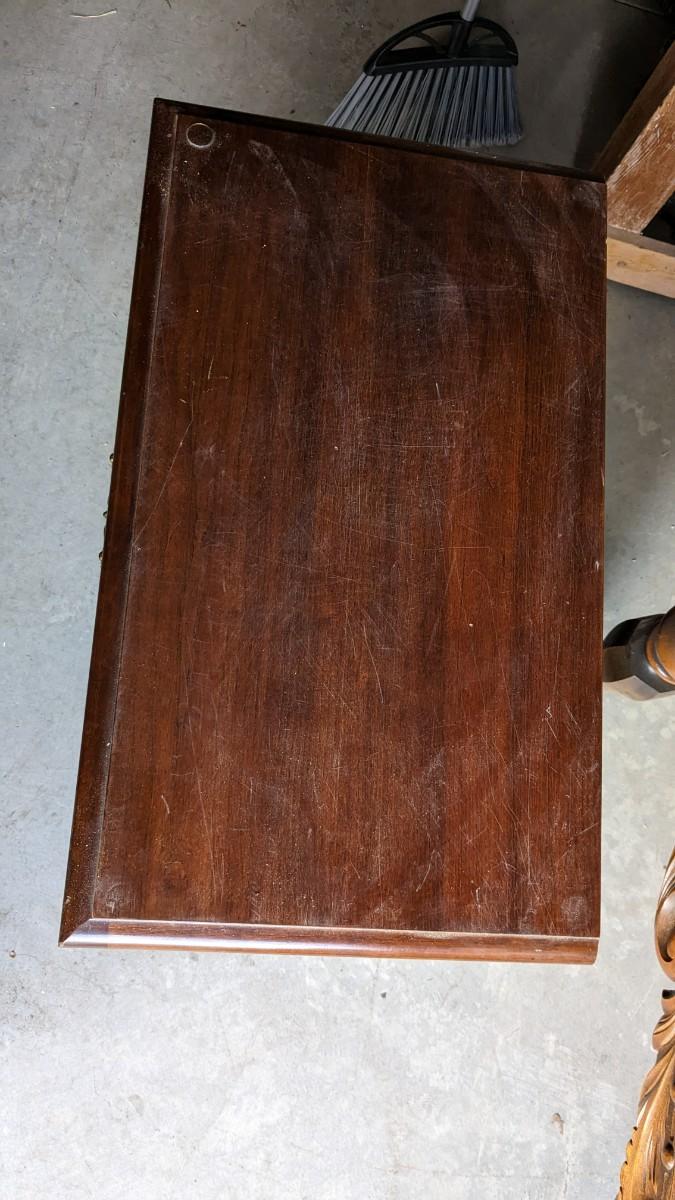 includes beautiful 41.75"x 19.75" x 33" desk, small waste basket and side table, please note top drawer is jammed on this piece. No shipping. 2604