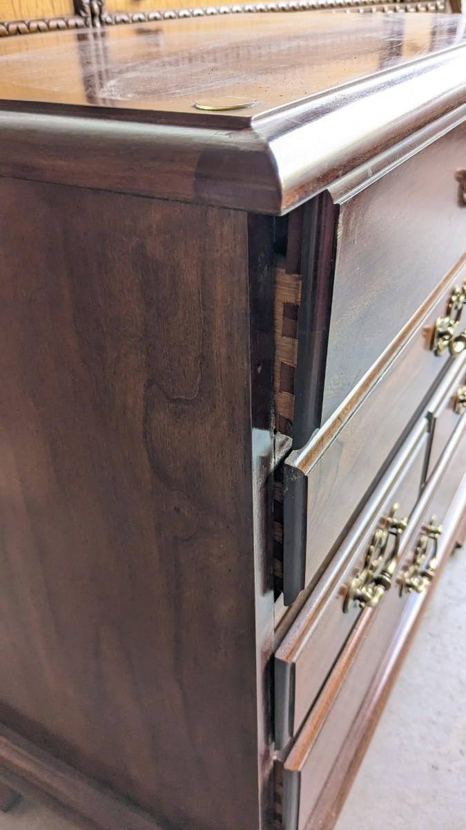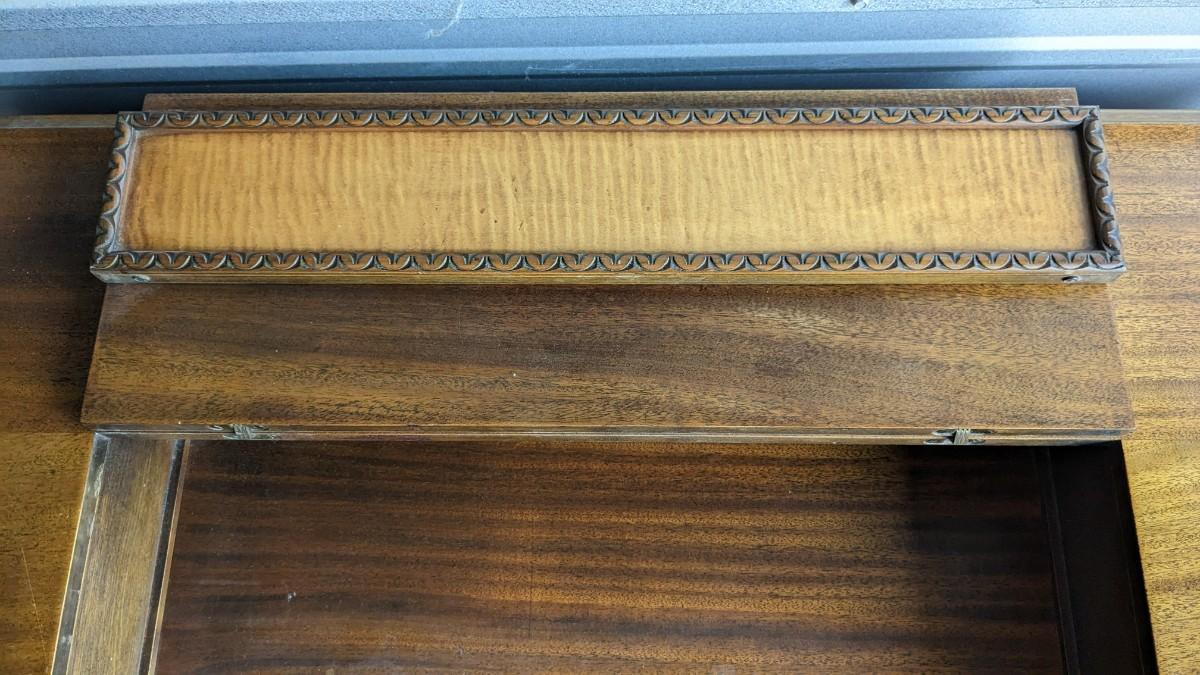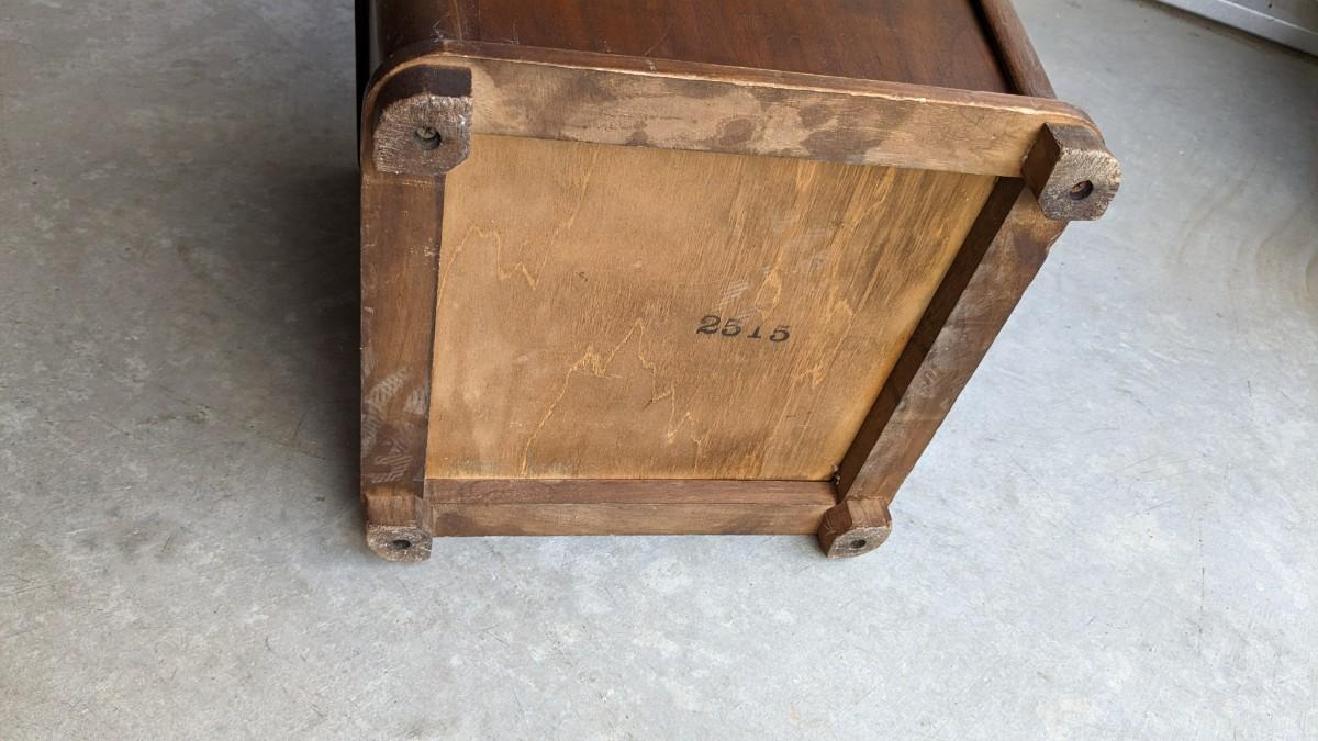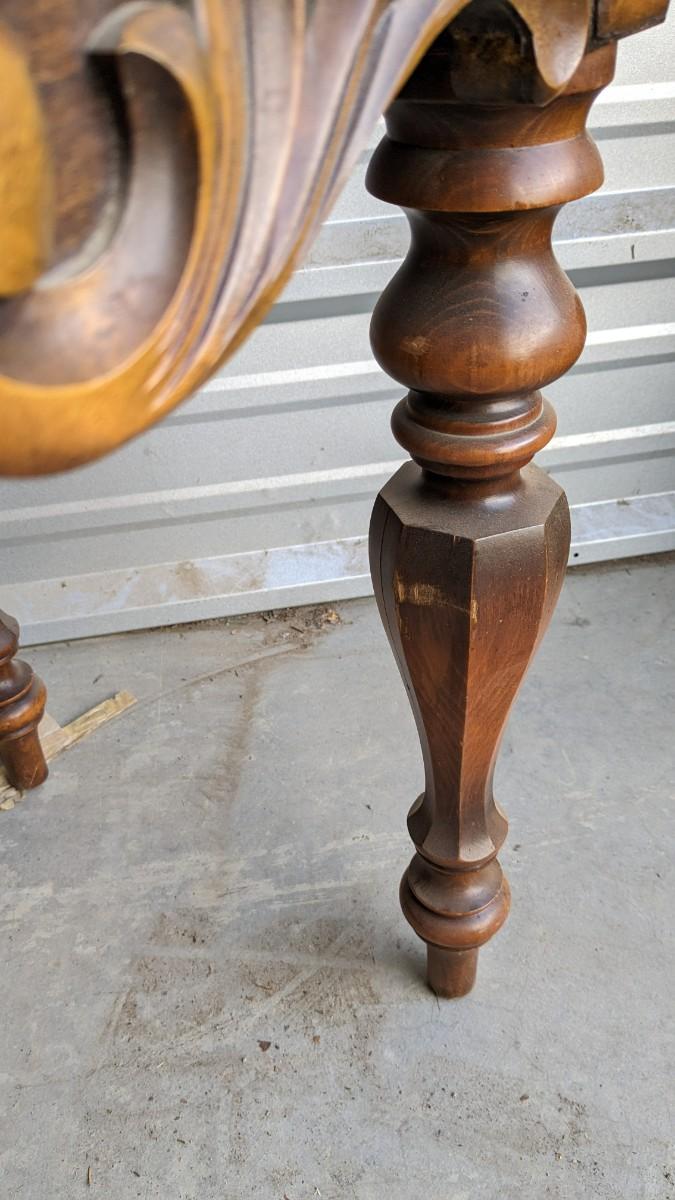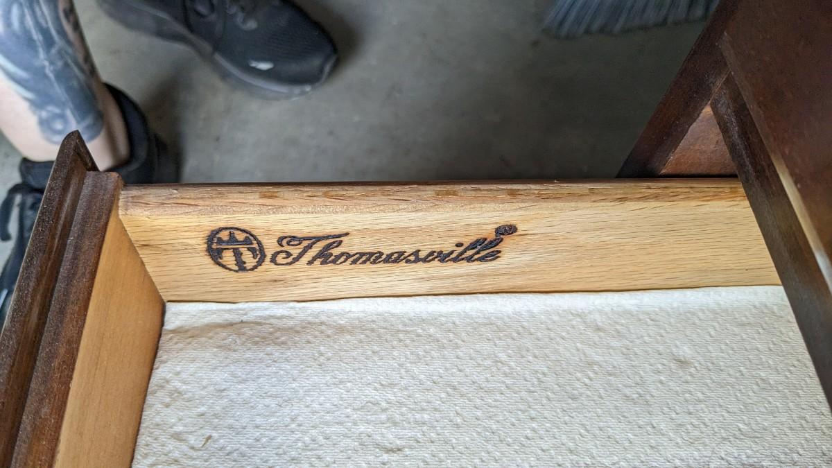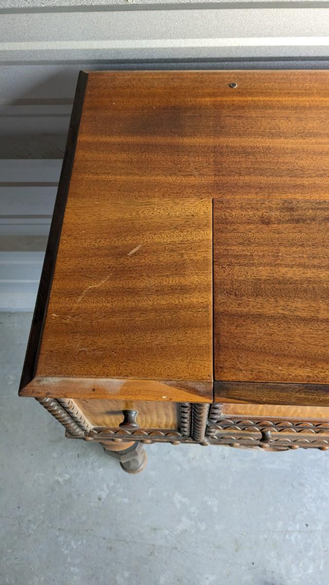 includes beautiful 41.75"x 19.75" x 33" desk, small waste basket and side table, please note top drawer is jammed on this piece. No shipping. 2604