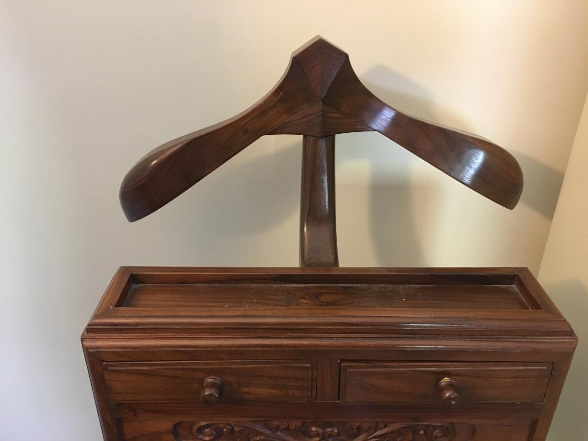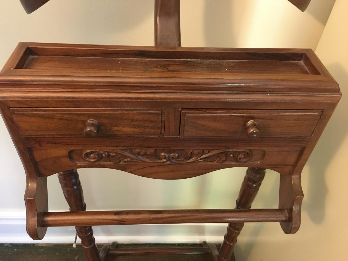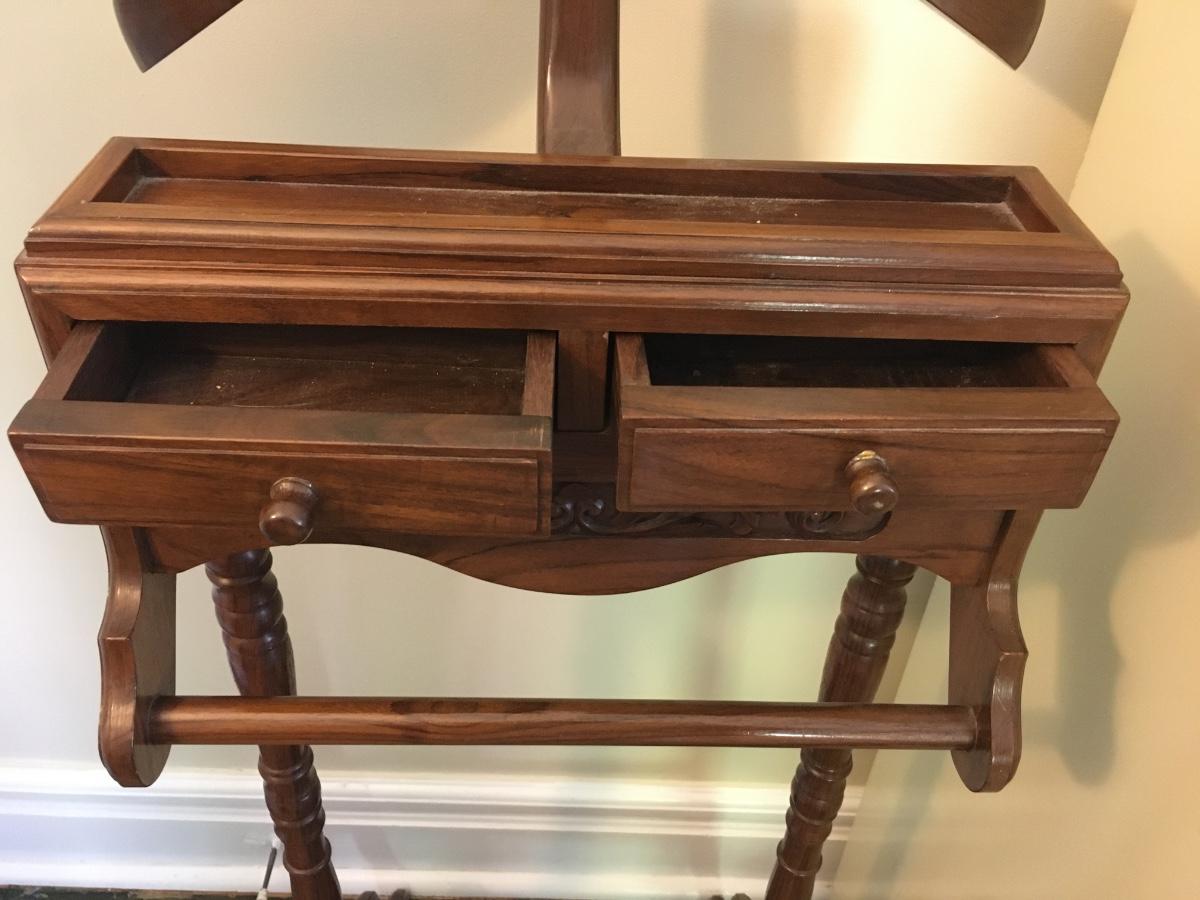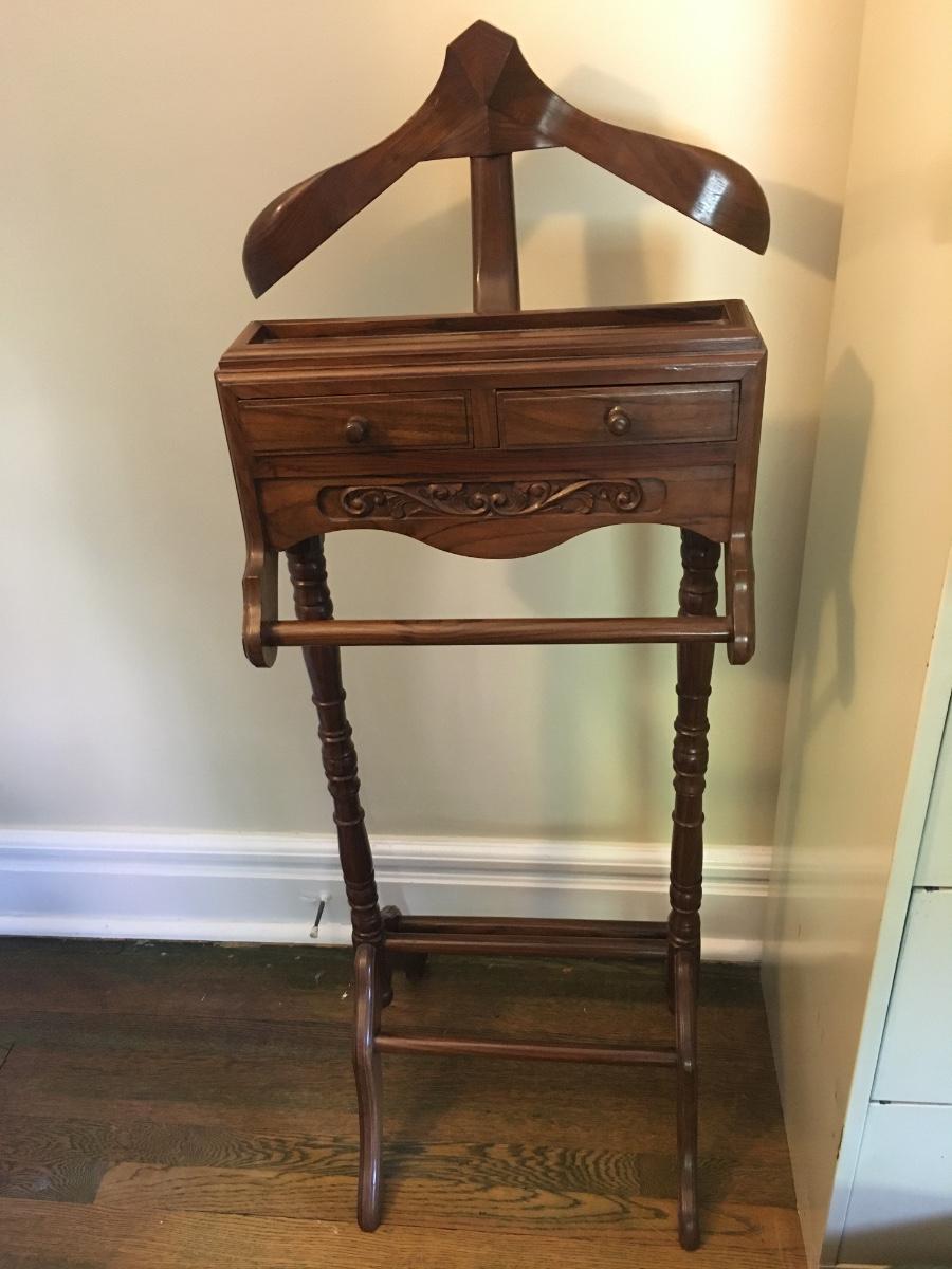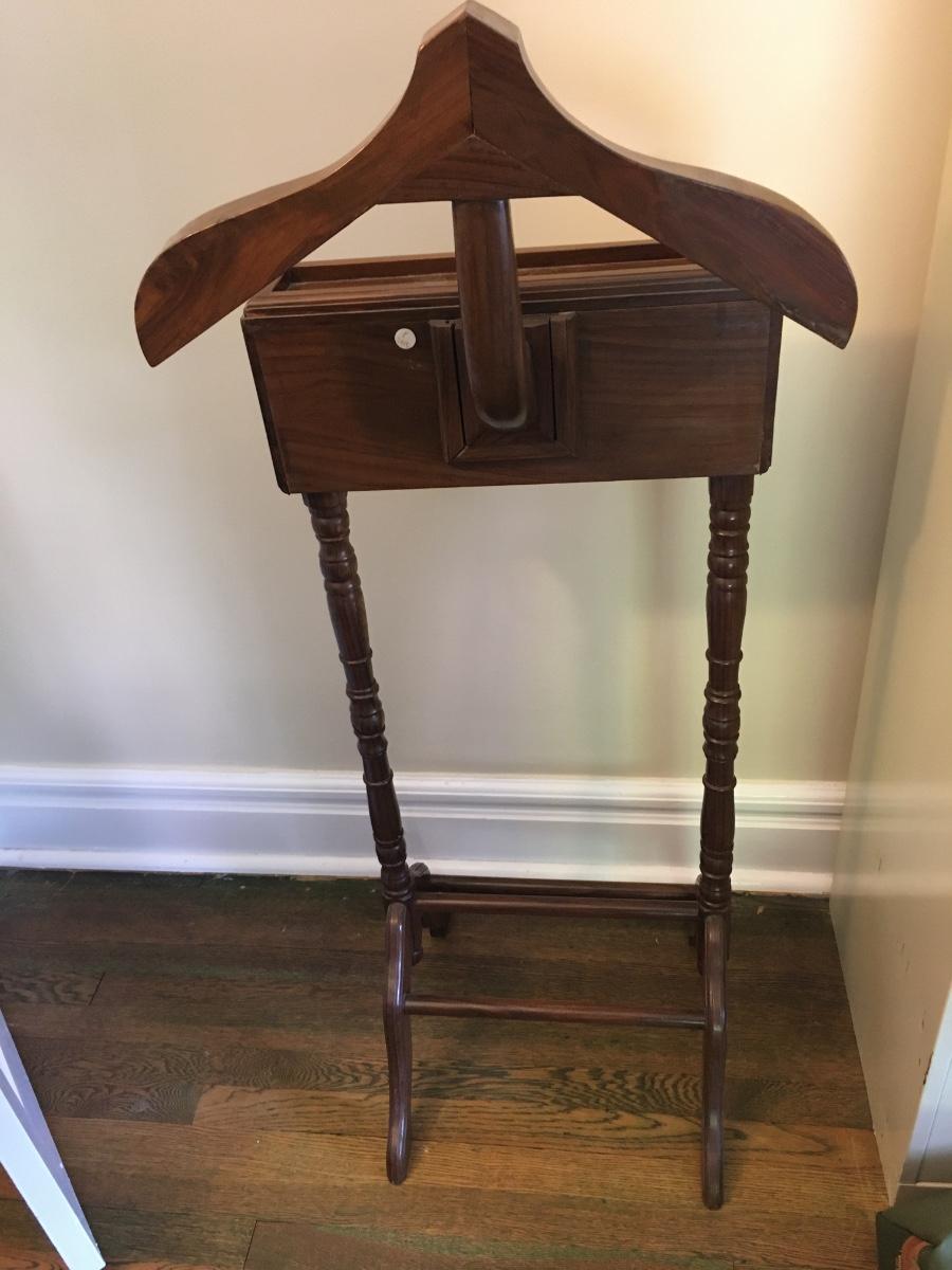 All you need to keep things neat and tidy. Hanger for jacket, rail for pants and 2 trinket drawers along with top tray for keys and change.