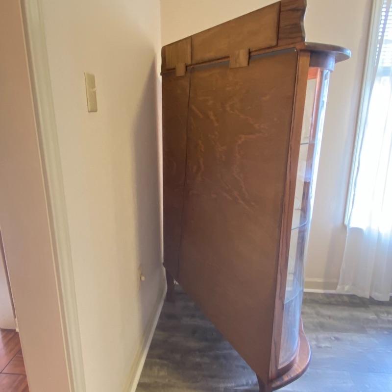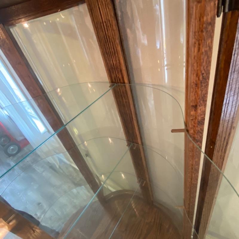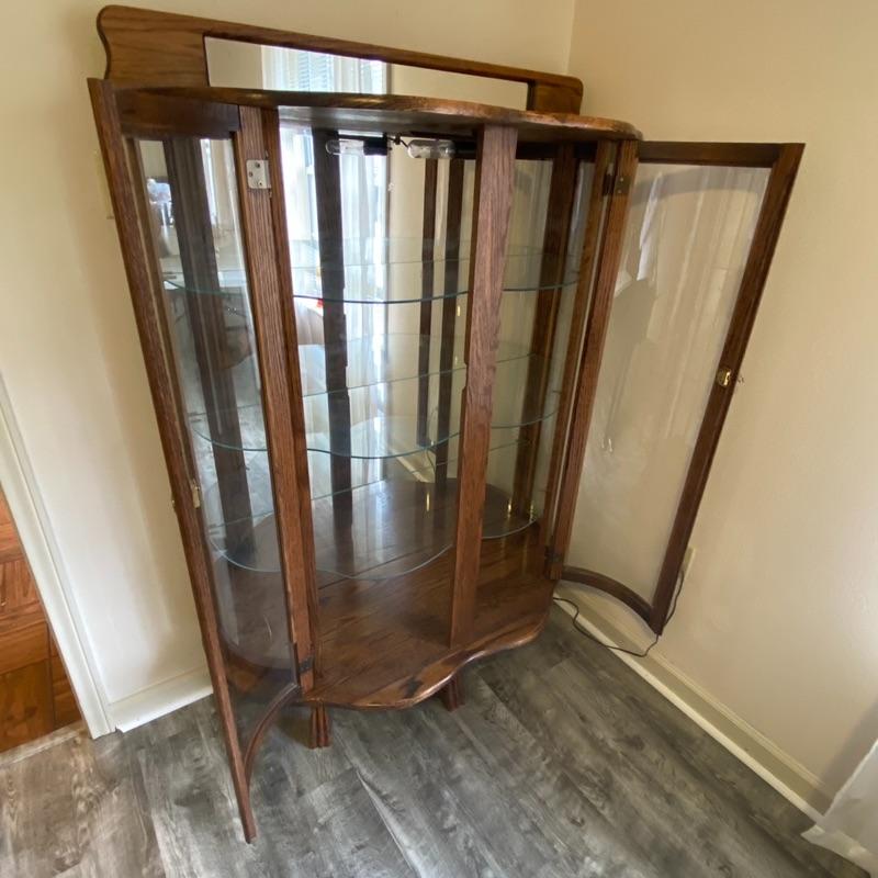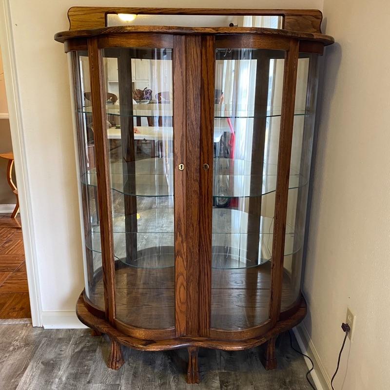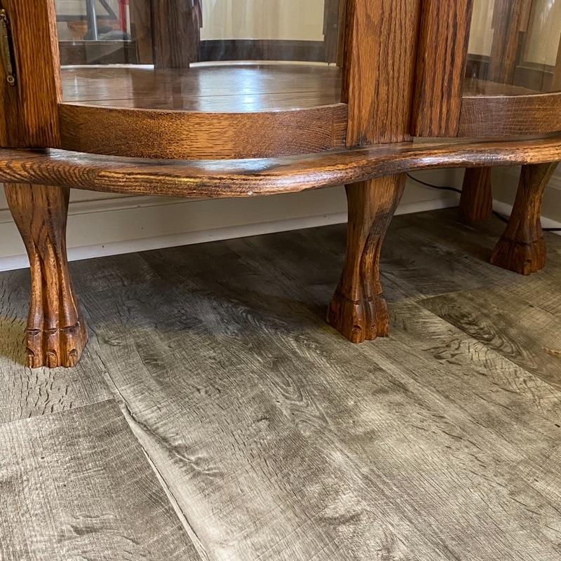 Oak & Curved Glass Claw Foot Lighted Curio Cabinet