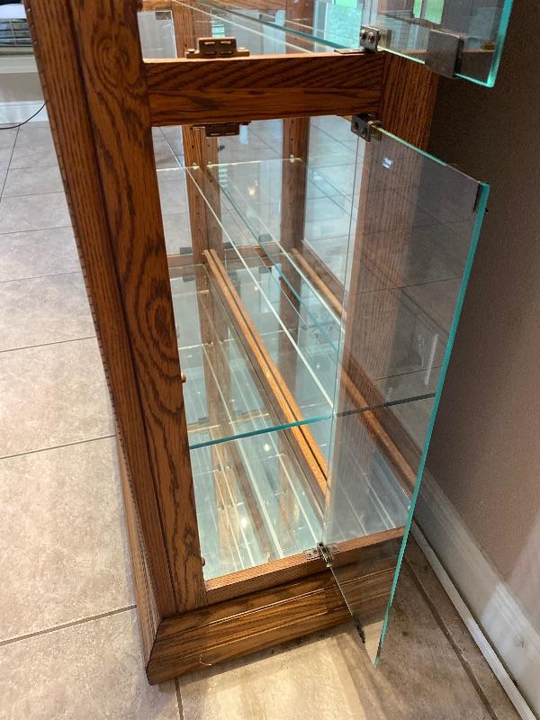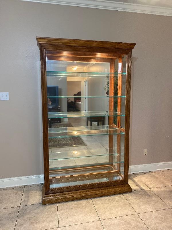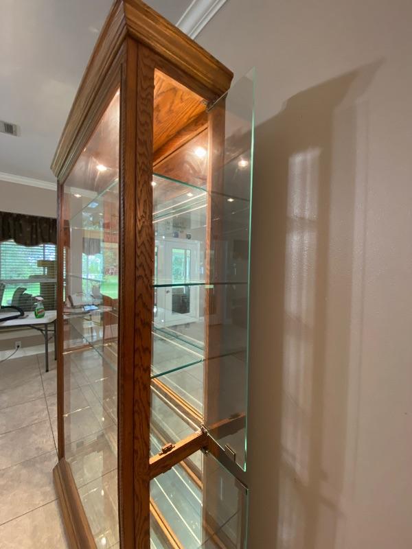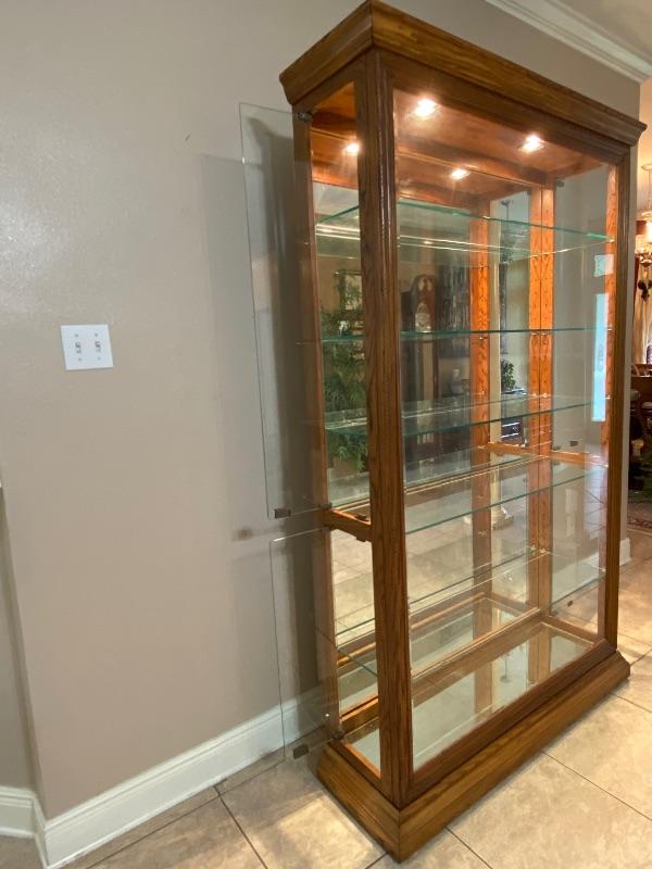 4 Side Glass Opening Doors / 5 Adjustable Glass Shelves / Removable Mirror on Bottom / 2 Lights in Top / 14.5 “ D x 48.5” L x 80” H
