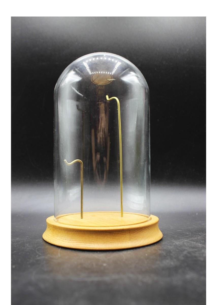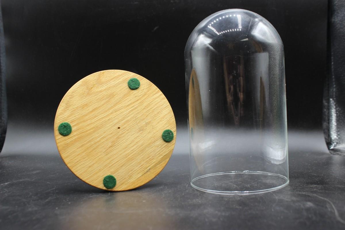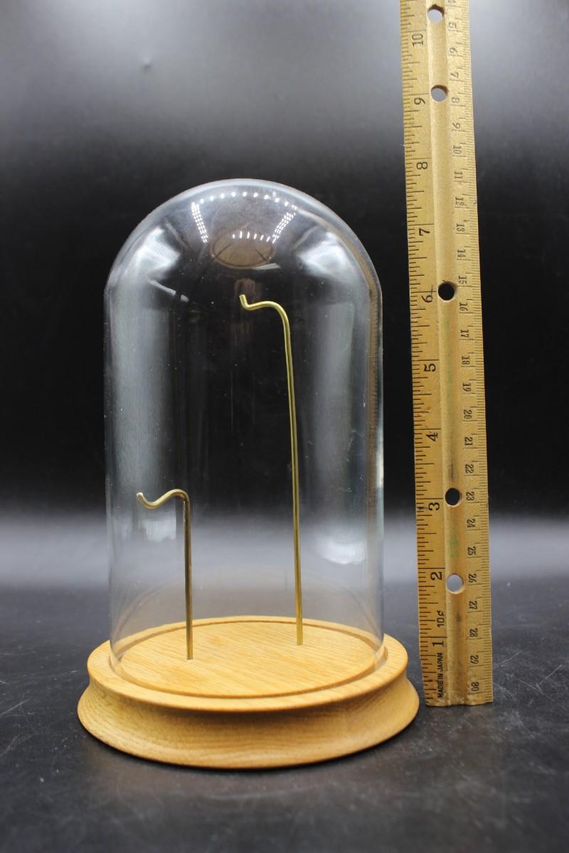 Wood & Glass Dome Display Stand, there is no significant cracks or chips to the glass or wood and is in good useable condition, check pictures for more details and for sizing.
