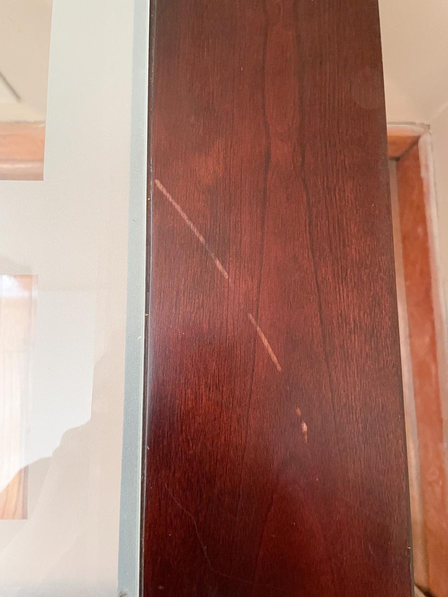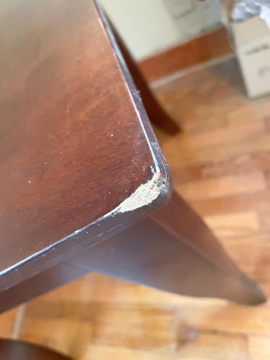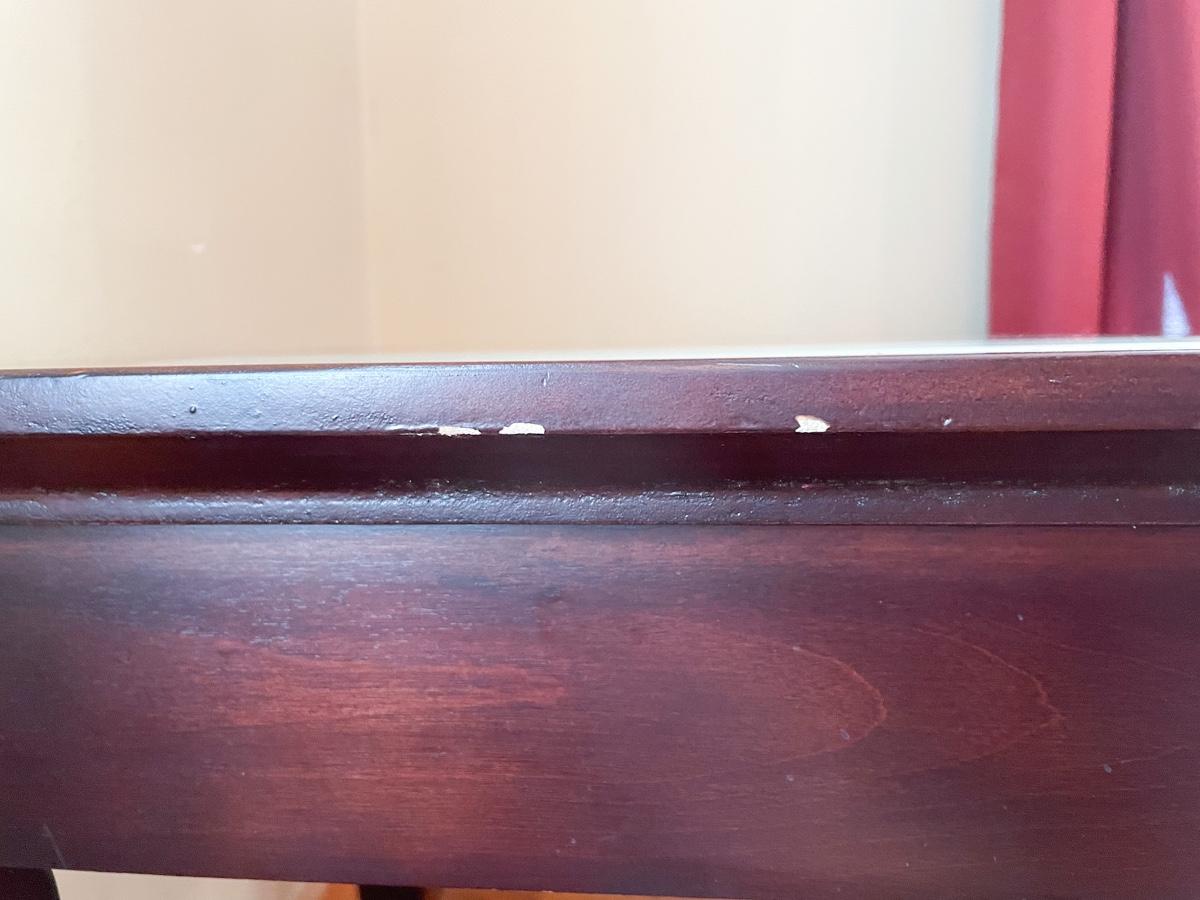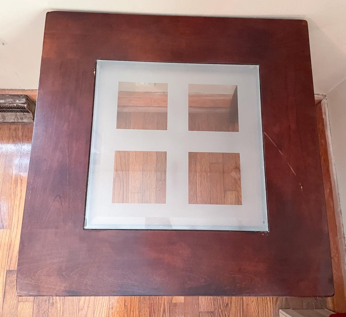 In solid condition. Some cosmetic flaws on the edges and a scratch on the top (just the finish, not deep into the wood). Glass is removable. Measures approx 2’ square x 2’ tall.