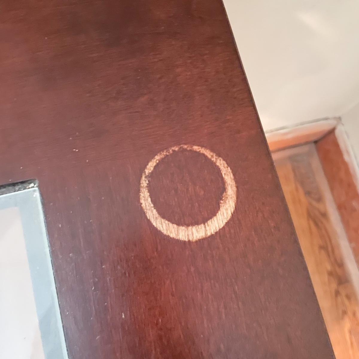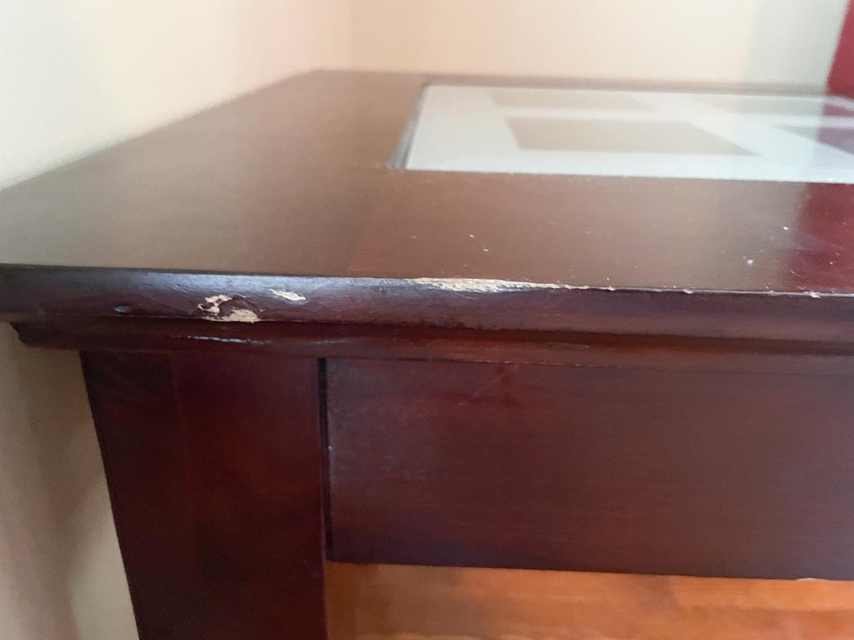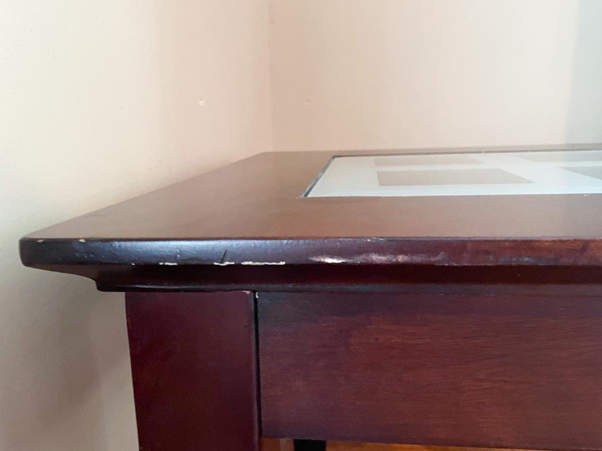 In solid condition, some cosmetic flaws to the finish on the edges and a ring mark on the top, as shown. Measures approx 2’ tall and 2’ square.
