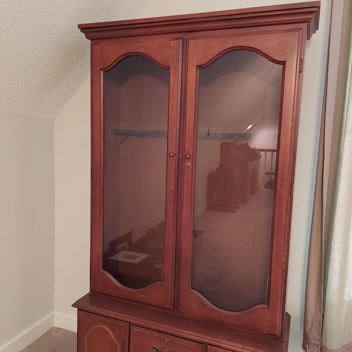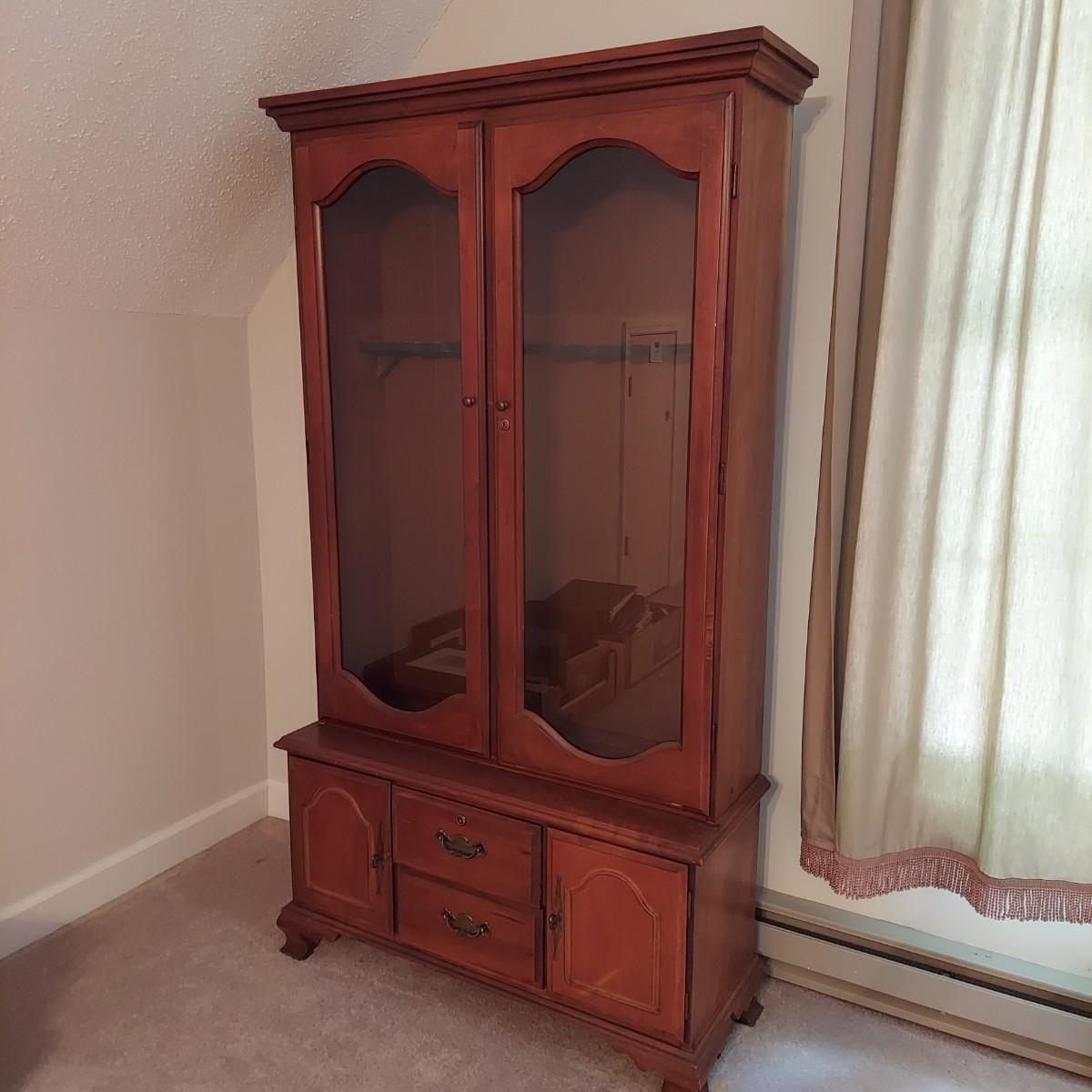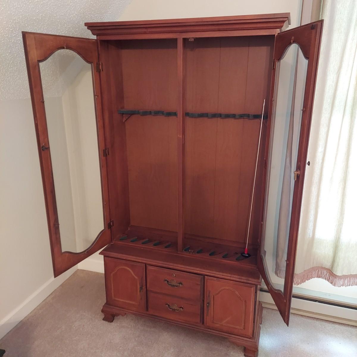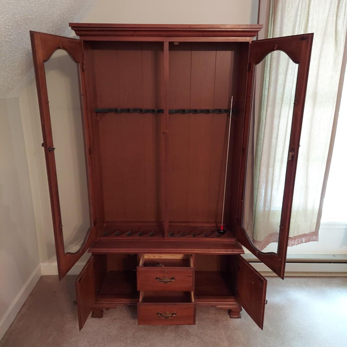 Wood storage cabinet for firearms with glass front doors. Storage for 10 guns behind the glass with two drawers and two lower cabinets. Solid wood with plywood back. Measures 40" x 14" x 71"H. No key included. Local Pickup Only. Winning bidder must bring assistance to help move and load this item due to its weight and/or size. Cabinet is located on the second floor of the house and will need to be moved down a flight of stairs.