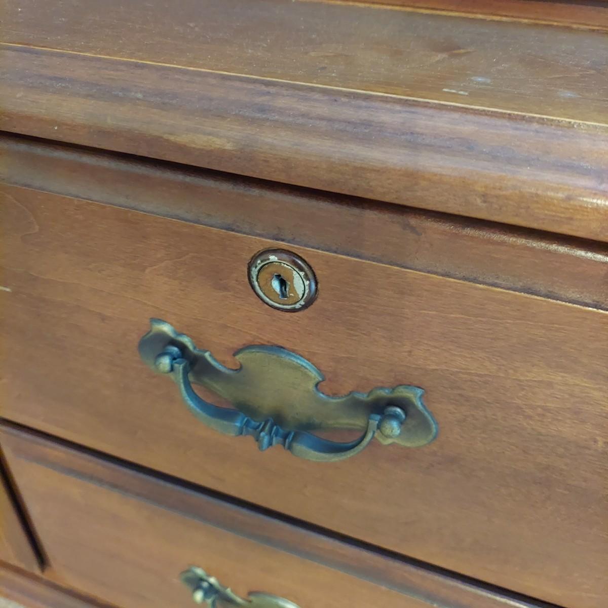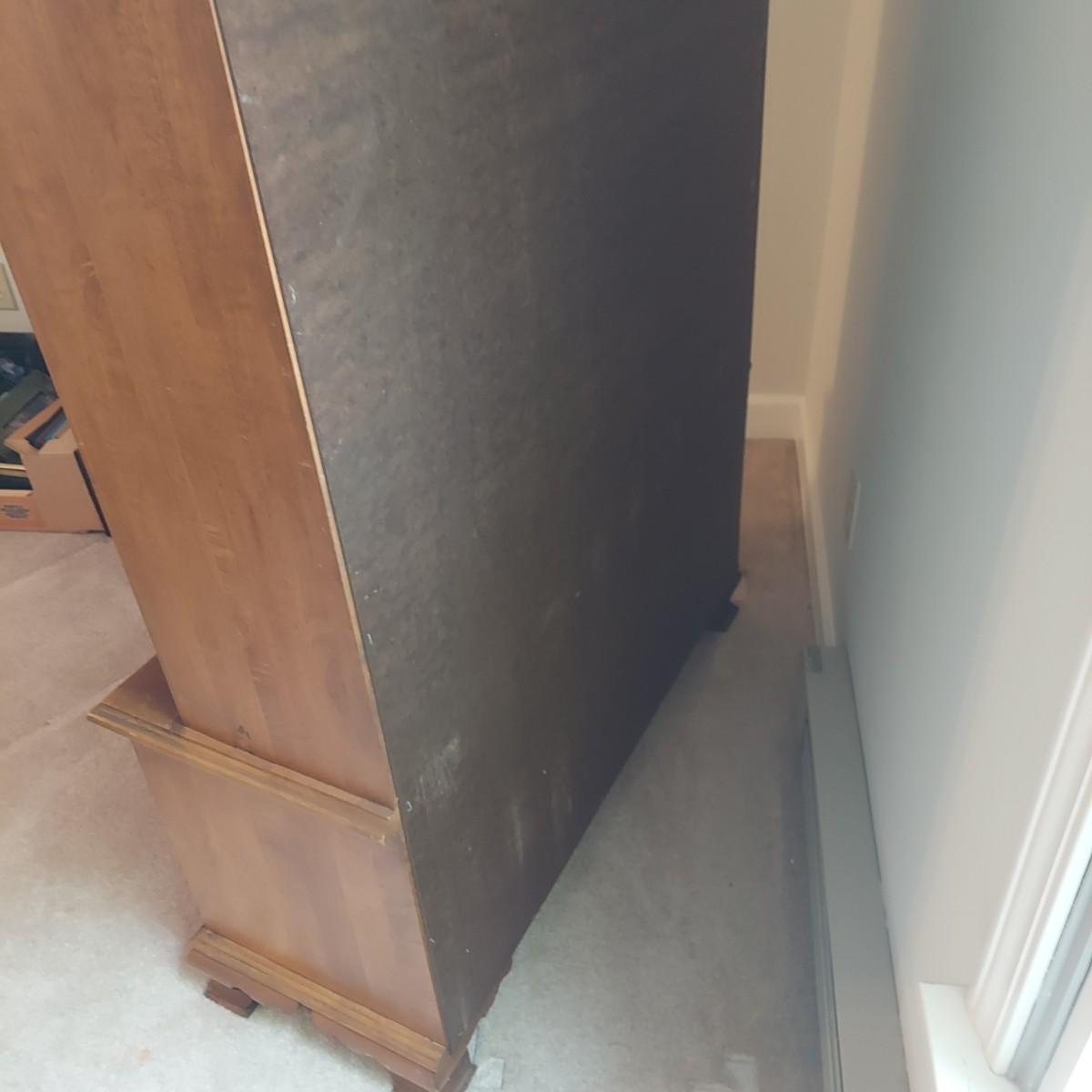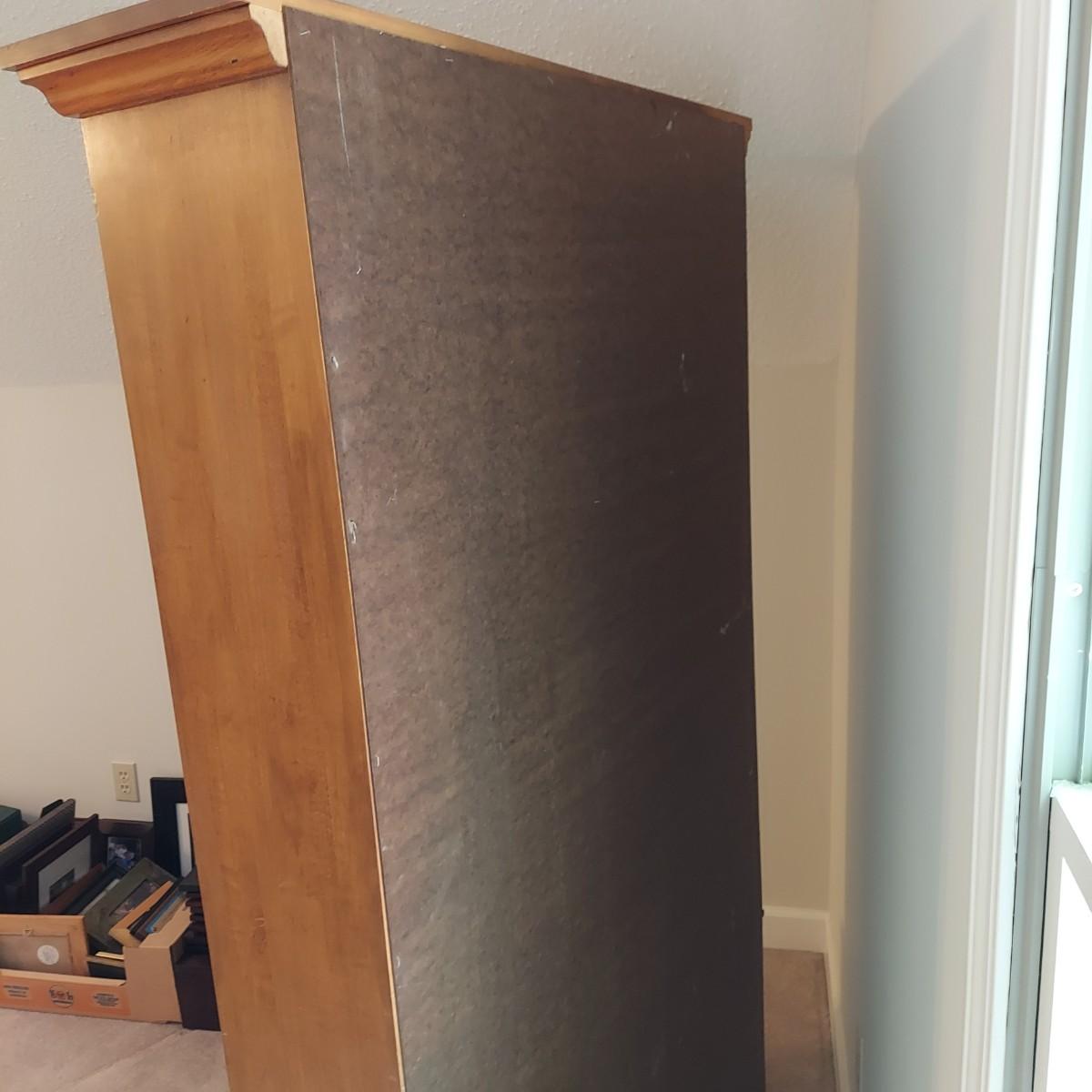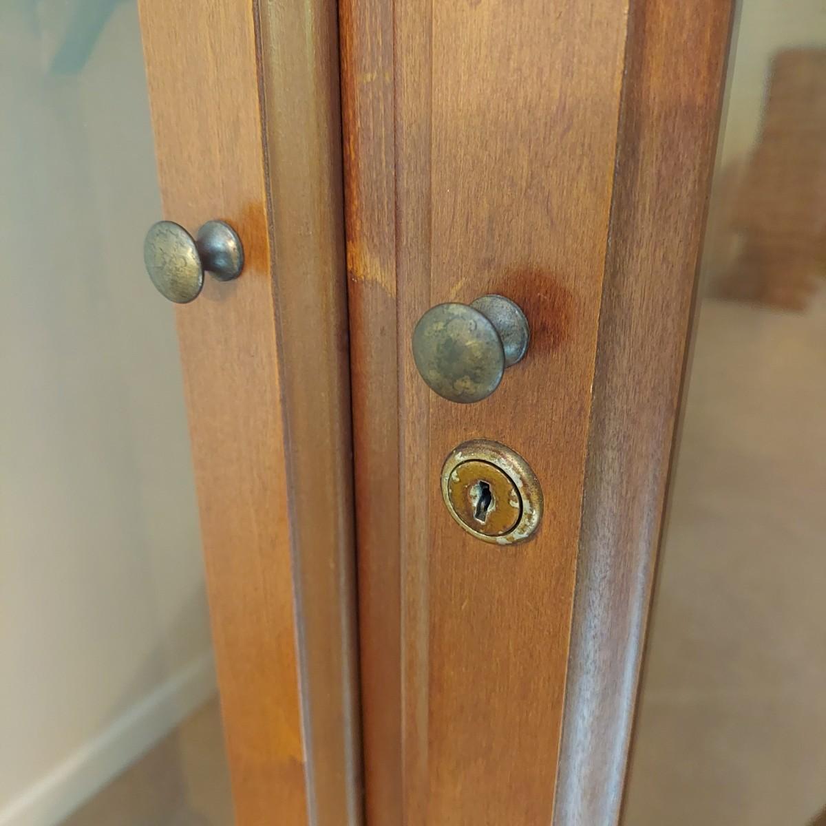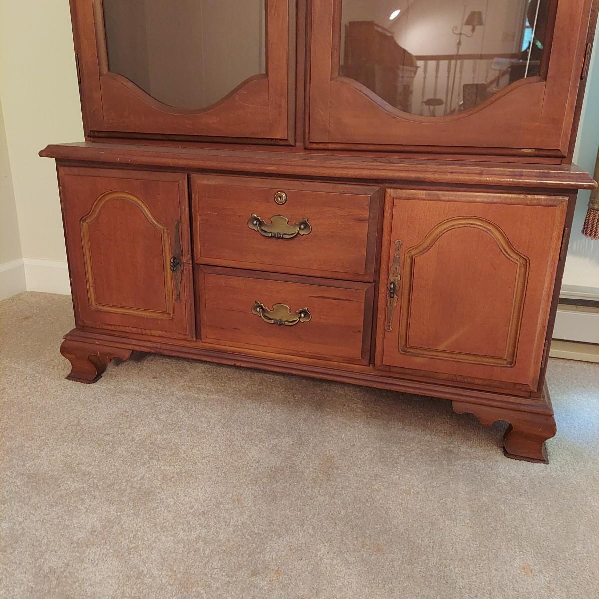 Wood storage cabinet for firearms with glass front doors. Storage for 10 guns behind the glass with two drawers and two lower cabinets. Solid wood with plywood back. Measures 40" x 14" x 71"H. No key included. Local Pickup Only. Winning bidder must bring assistance to help move and load this item due to its weight and/or size. Cabinet is located on the second floor of the house and will need to be moved down a flight of stairs.