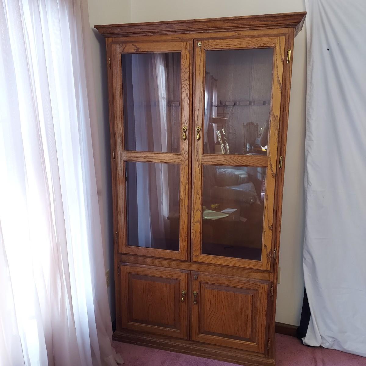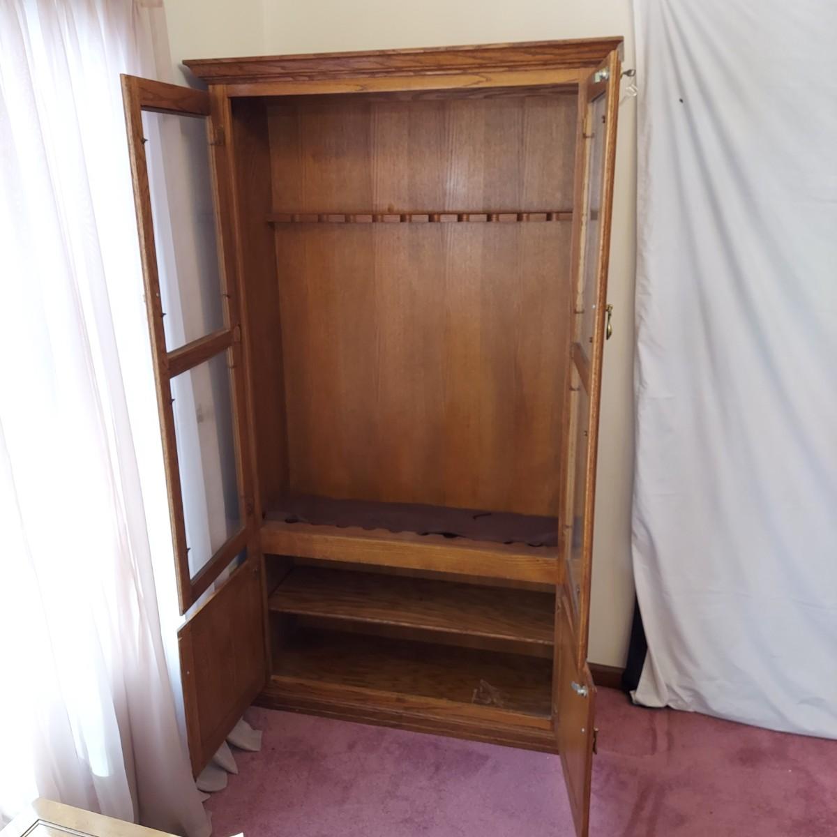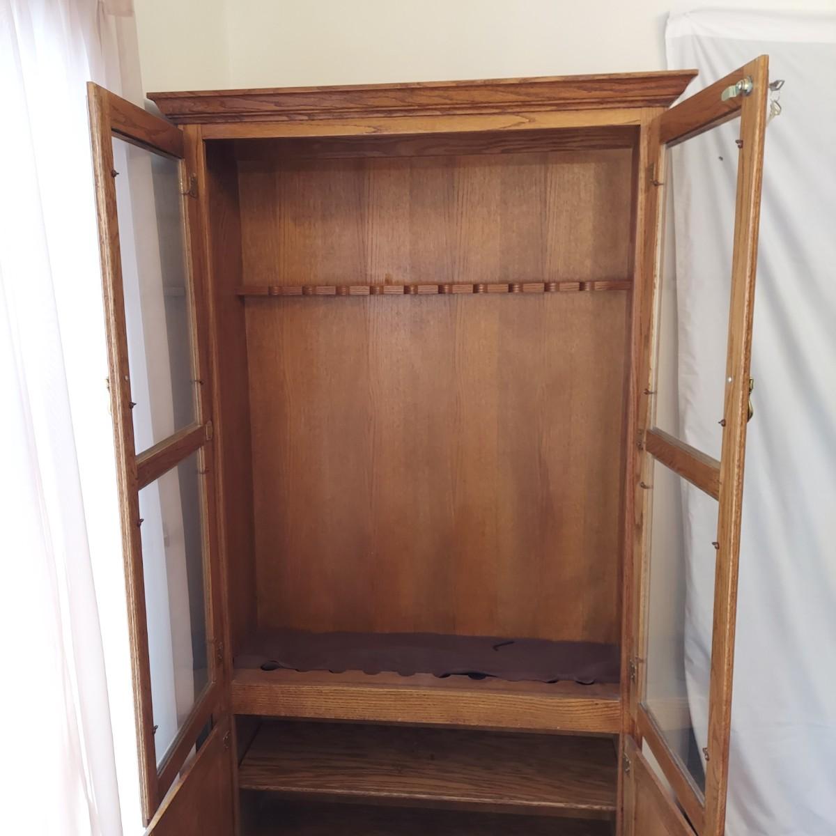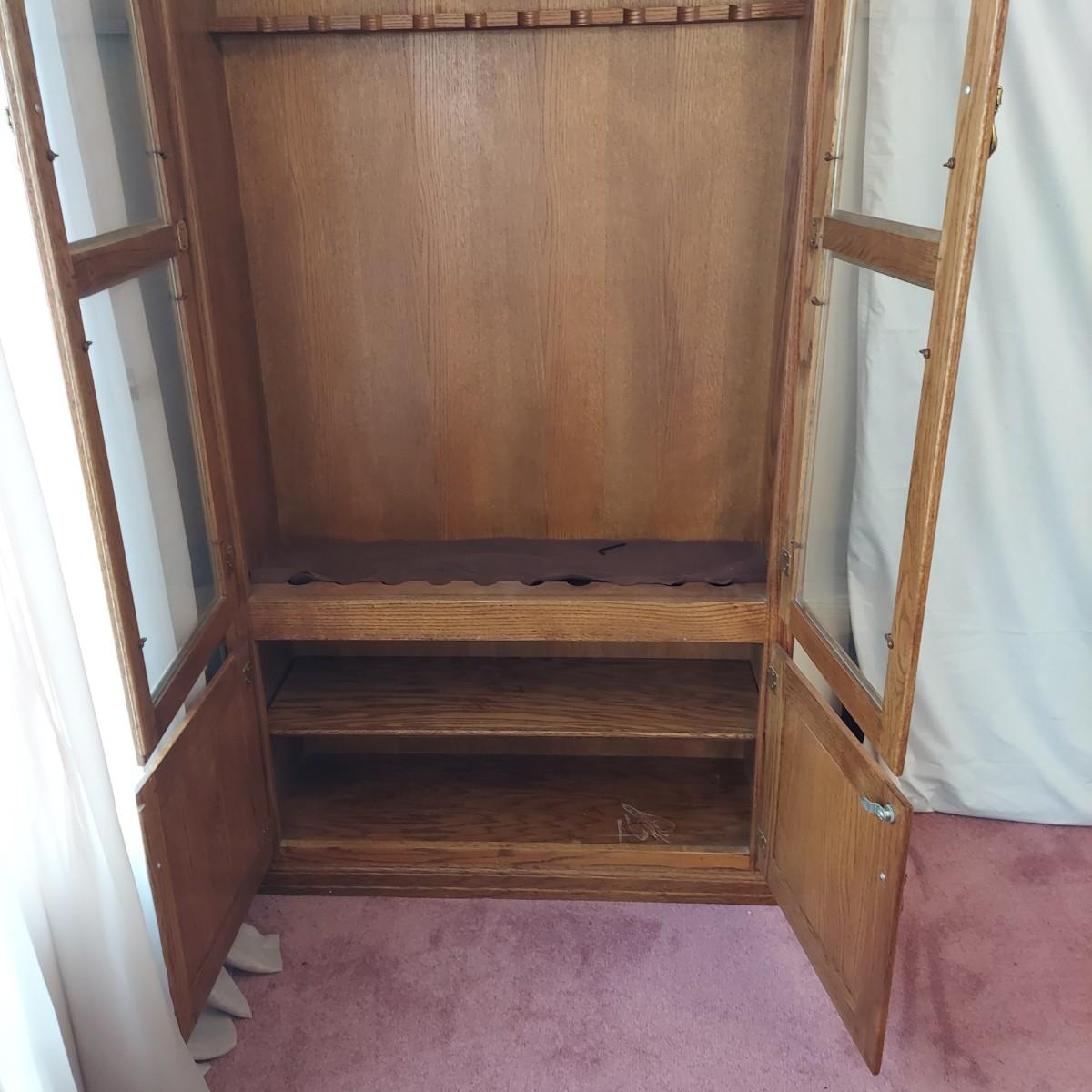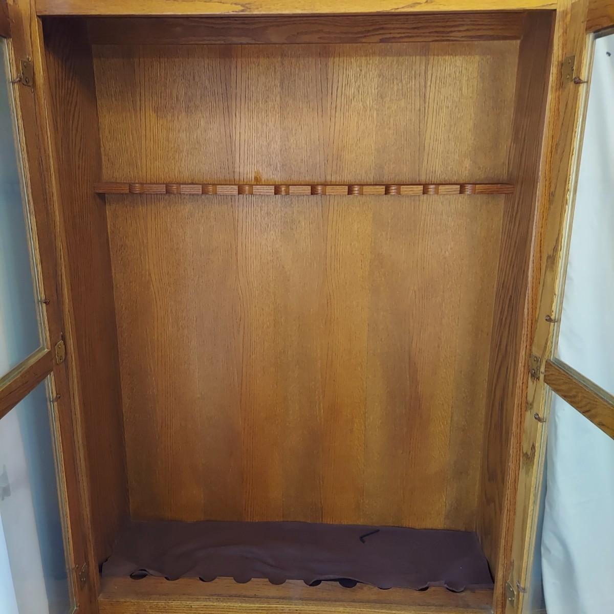 Solid wood Gun display cabinet with glass front doors. It appears to be oak and has a plywood back. There are two top door and two bottom doors, each with a lock. A few blemishes on shelves, see images. The keys are included. The piece measures 40.5" x 13.5" x 76"H. Local Pickup Only. Winning bidder must bring assistance to help move and load this item due to its weight and/or size.
