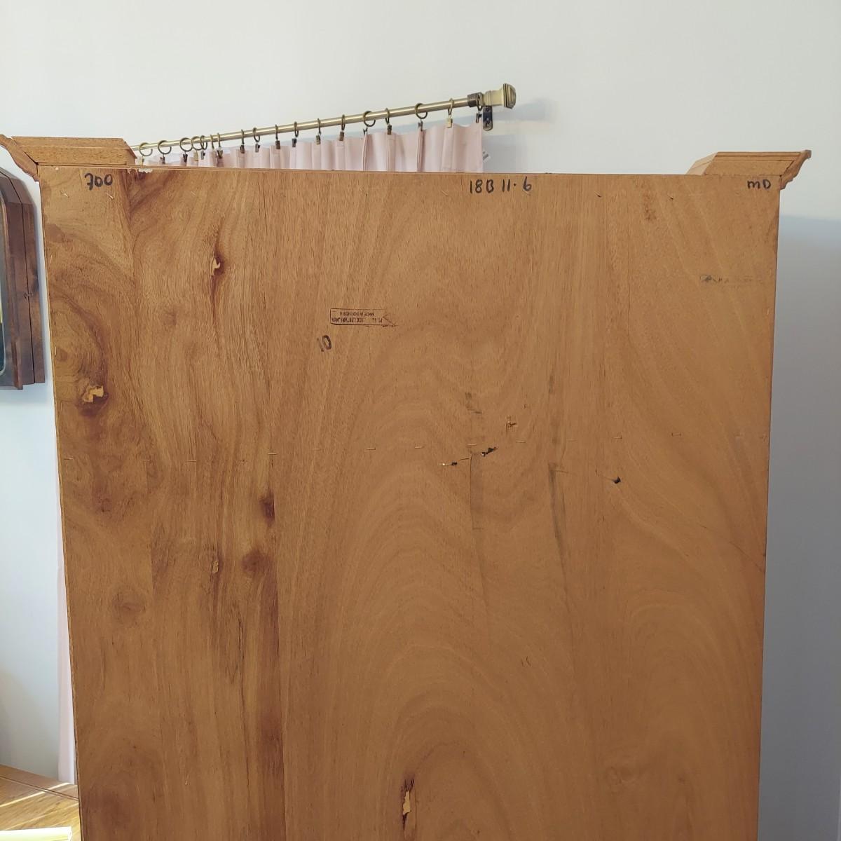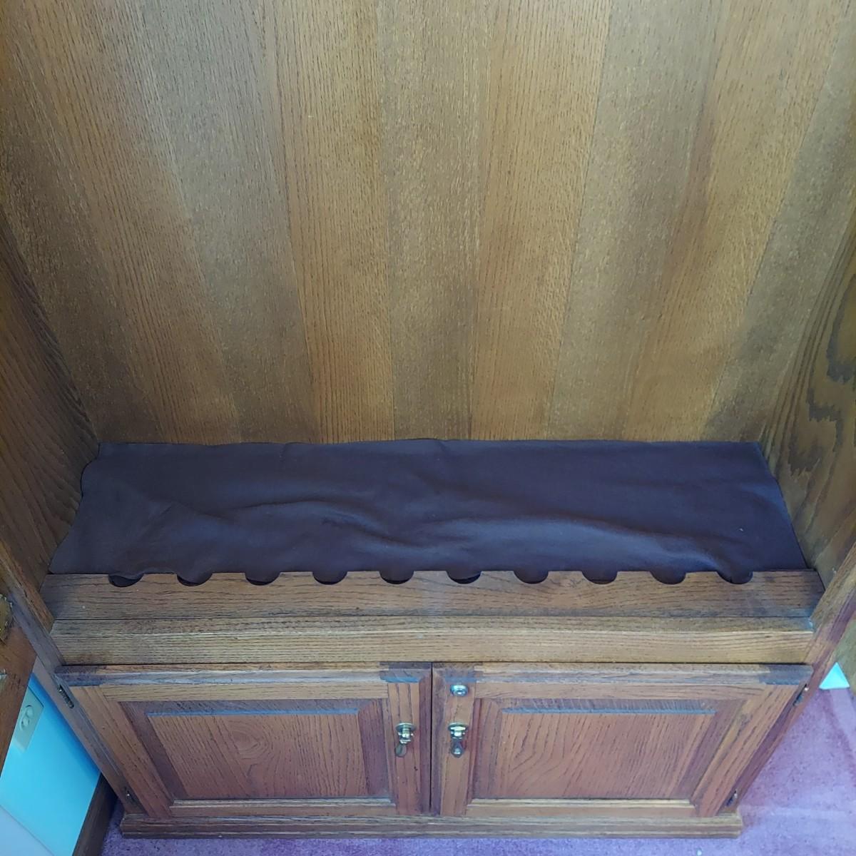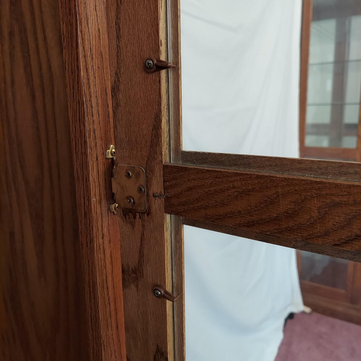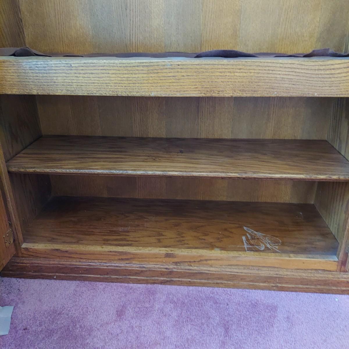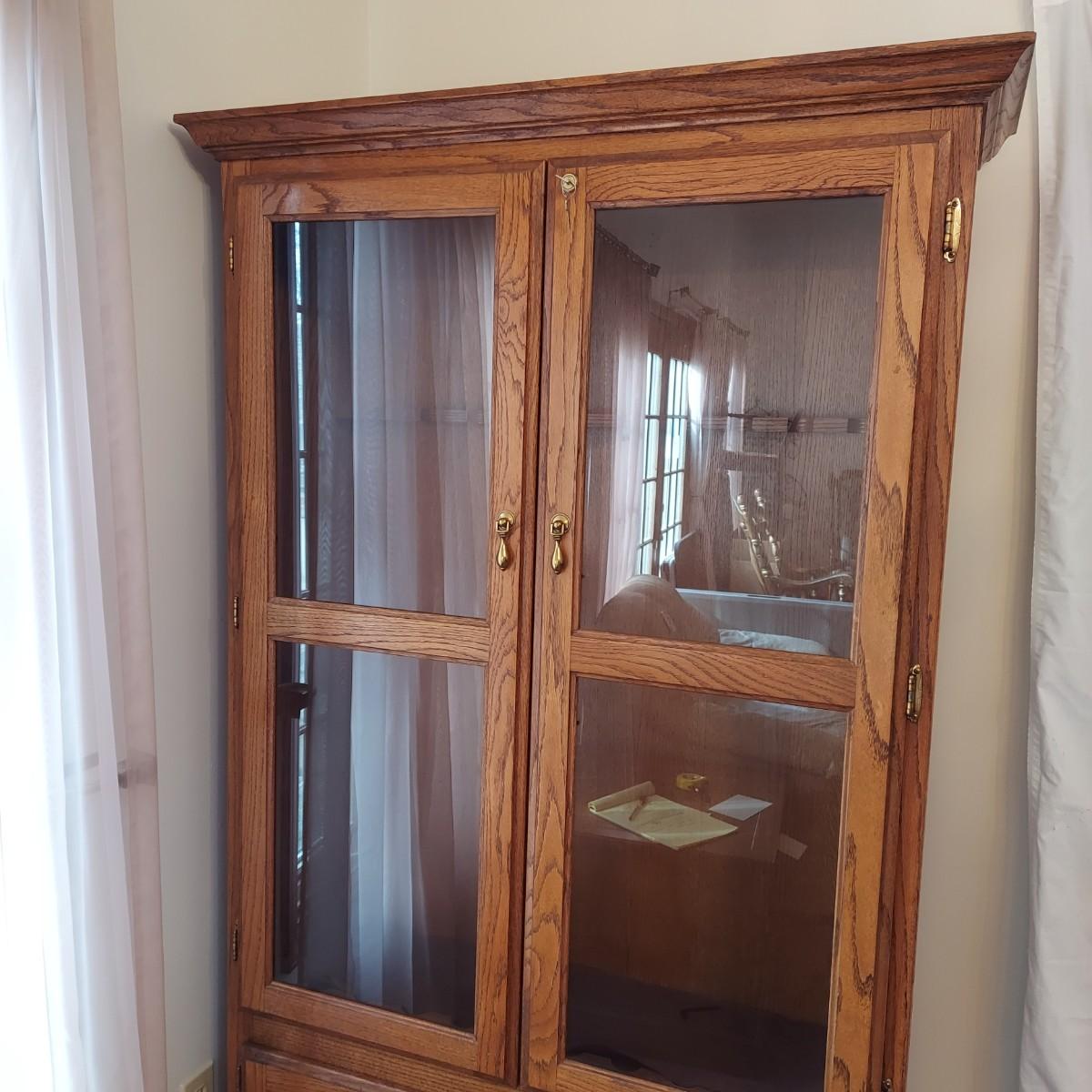 Solid wood Gun display cabinet with glass front doors. It appears to be oak and has a plywood back. There are two top door and two bottom doors, each with a lock. A few blemishes on shelves, see images. The keys are included. The piece measures 40.5" x 13.5" x 76"H. Local Pickup Only. Winning bidder must bring assistance to help move and load this item due to its weight and/or size.