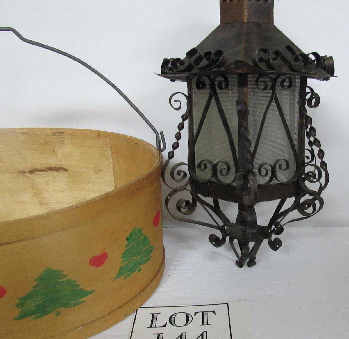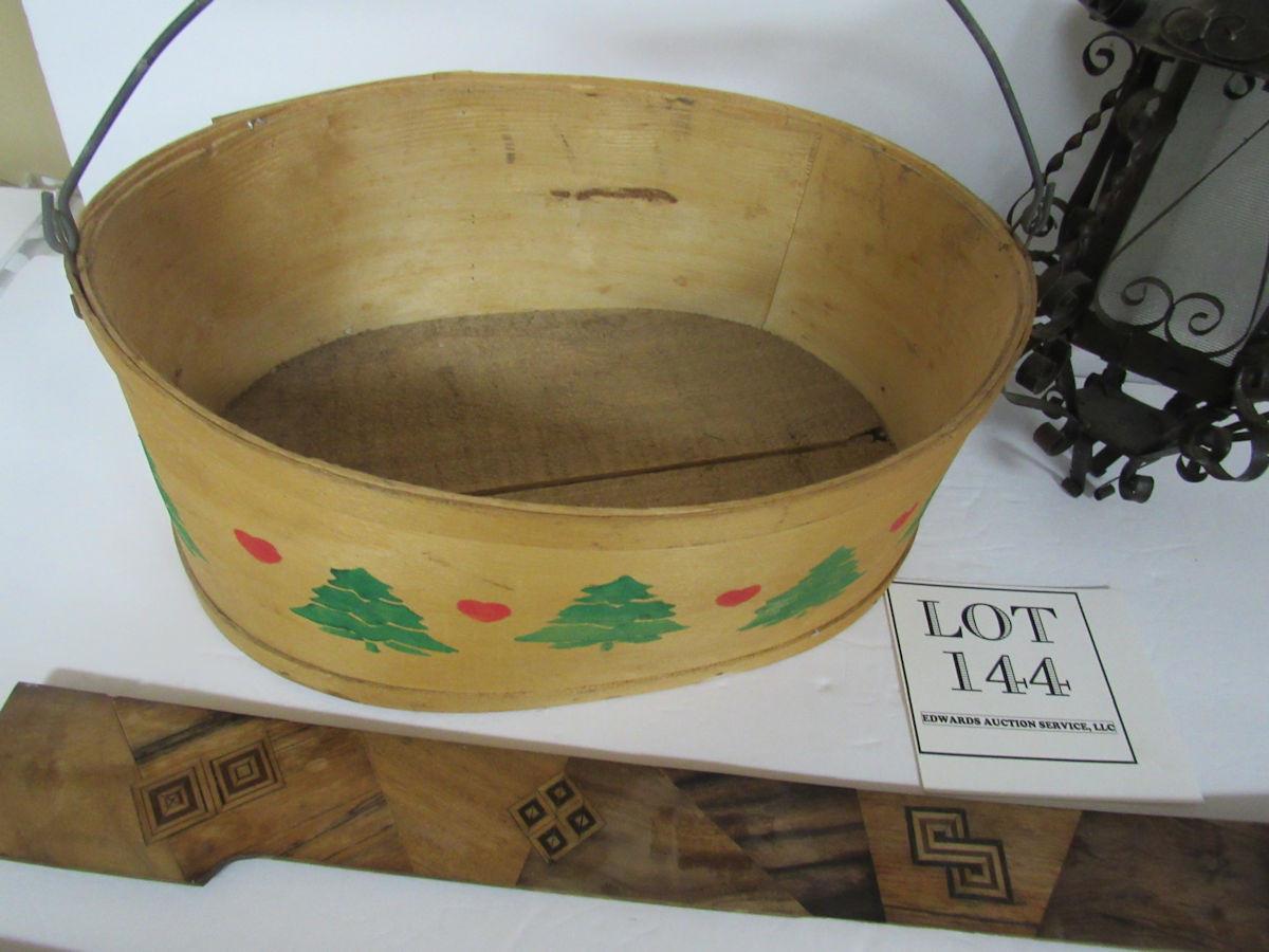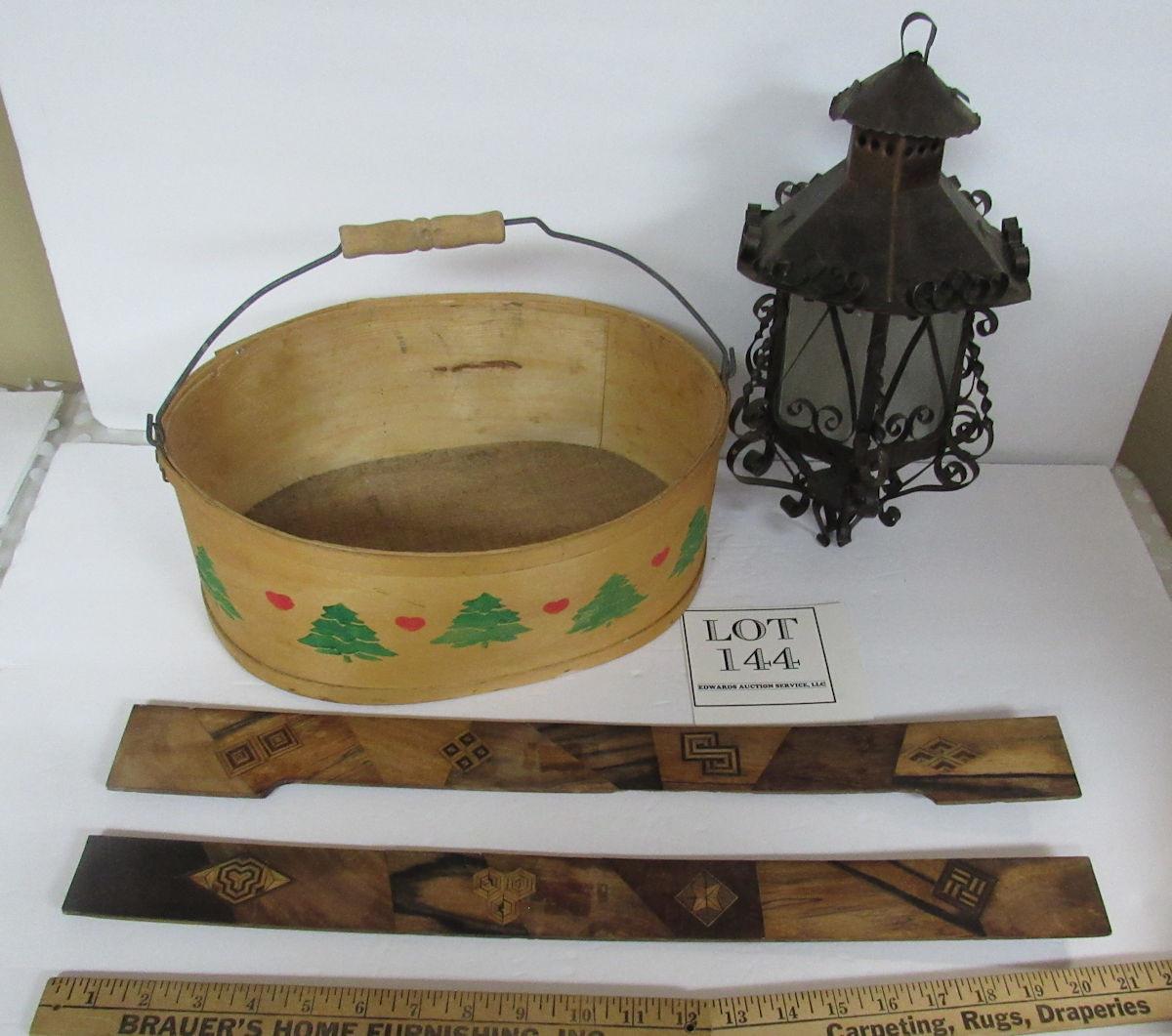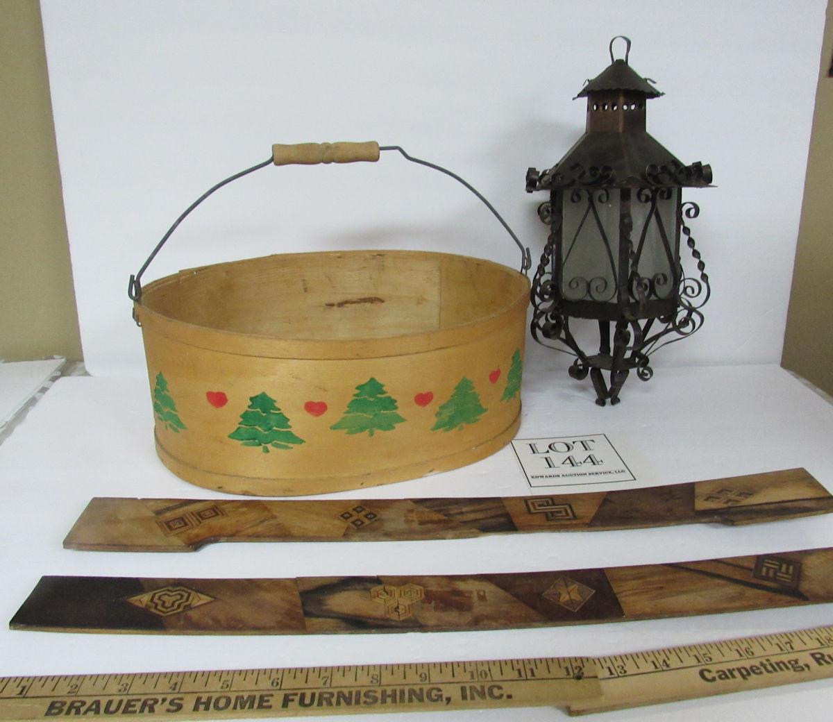 Wood Handled Basket, Outdoor Metal Candle Holder, 2 Decorative Vintage Wood Pieces