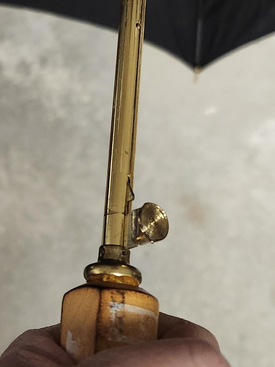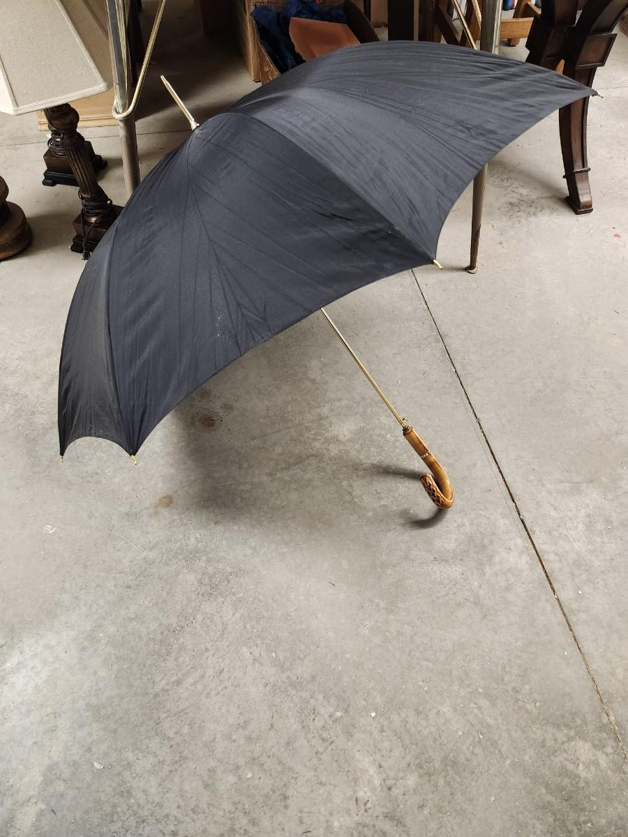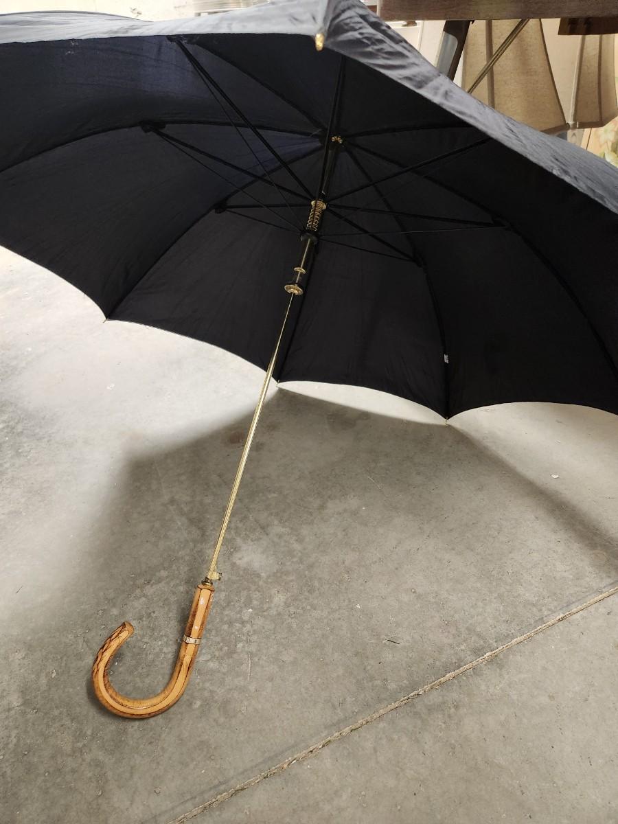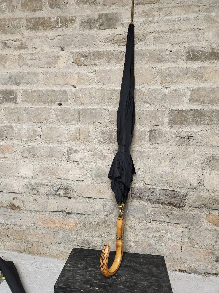 Black nylon vintage umbrella. Hand carved wood handle with unique push button release.