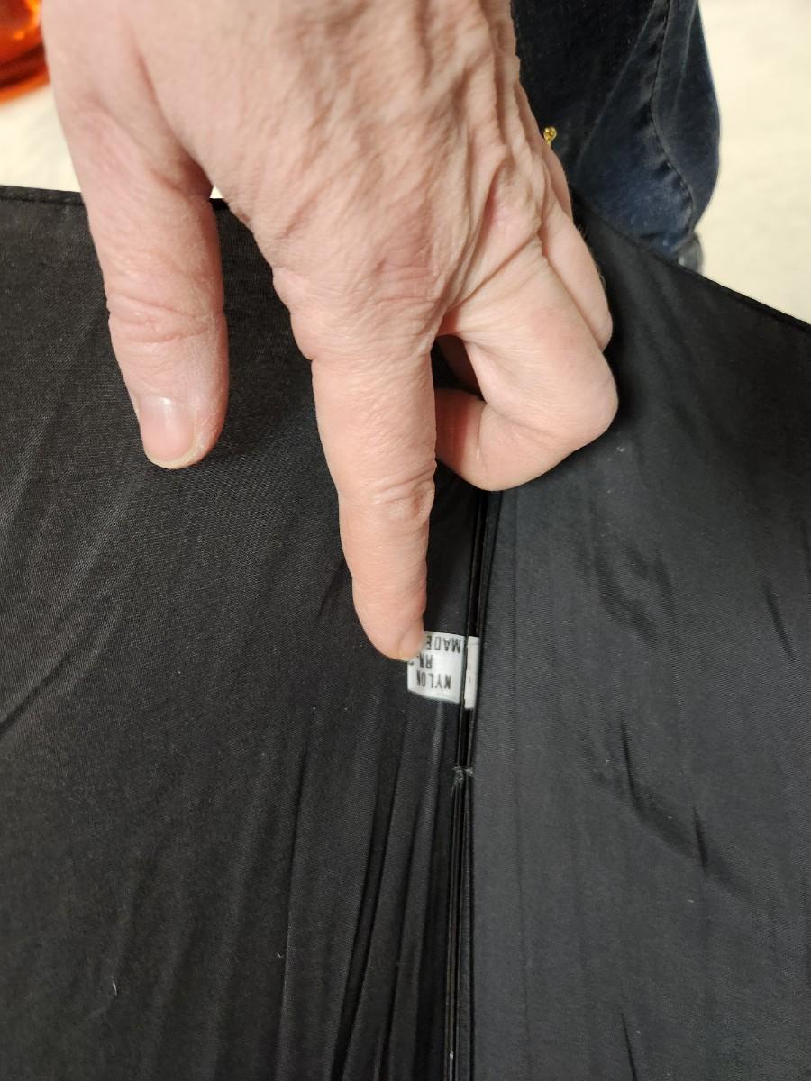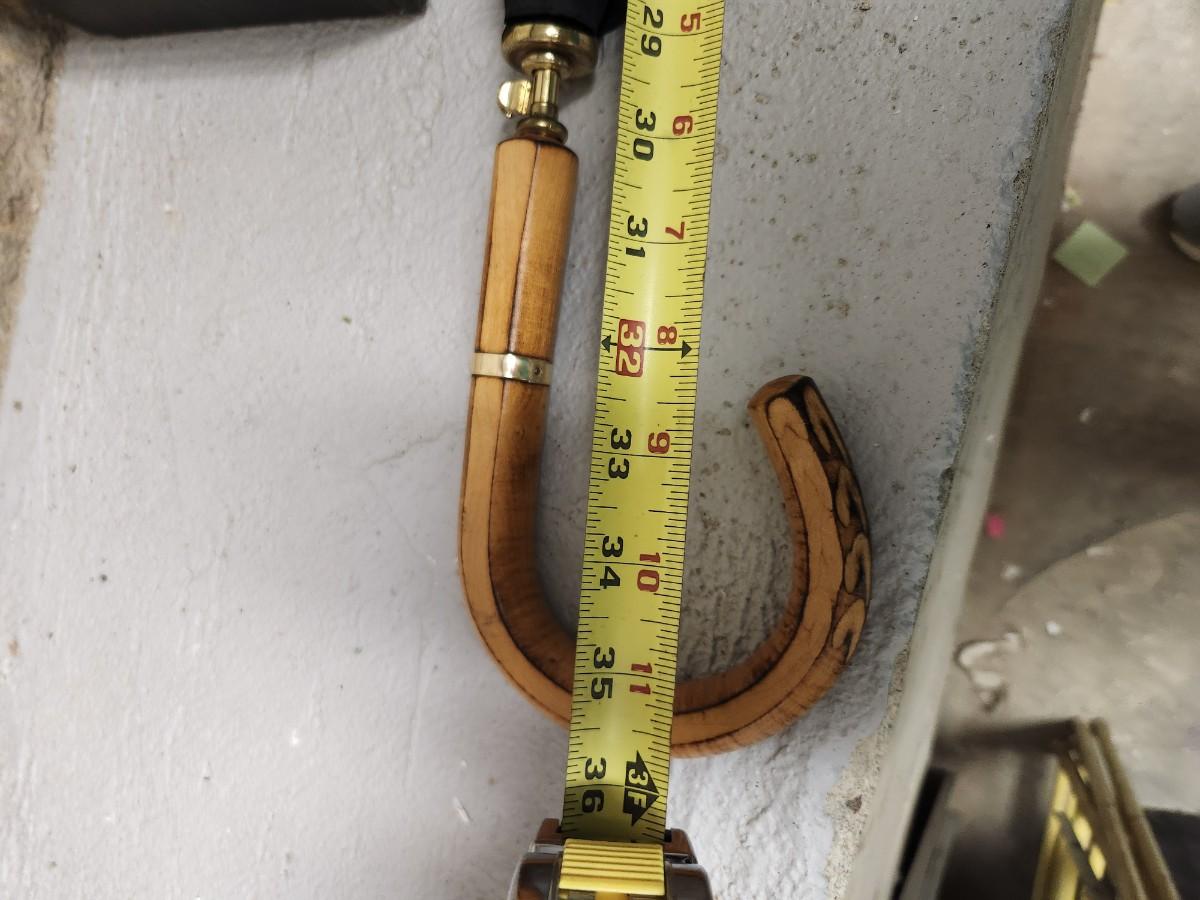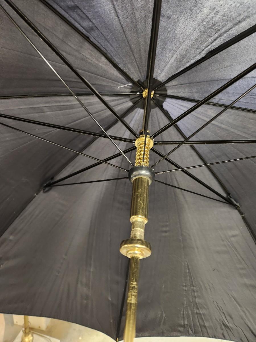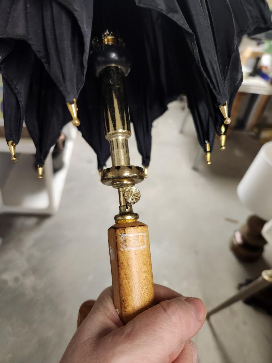 Black nylon vintage umbrella. Hand carved wood handle with unique push button release.