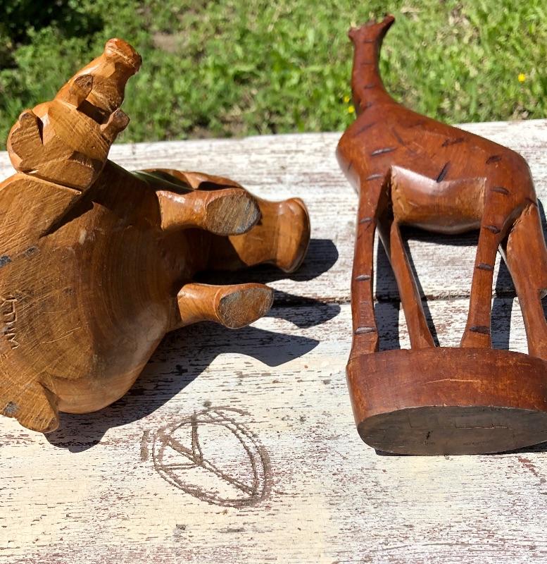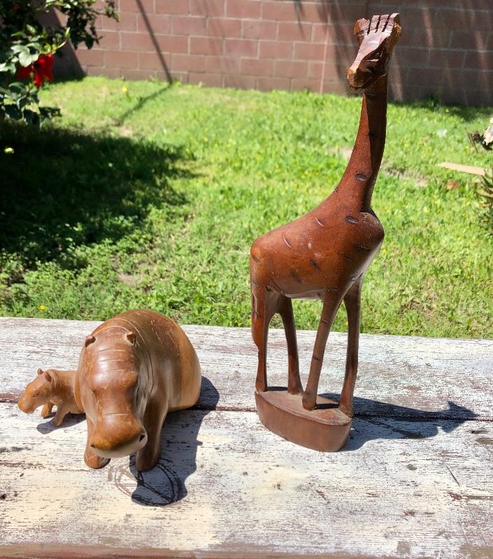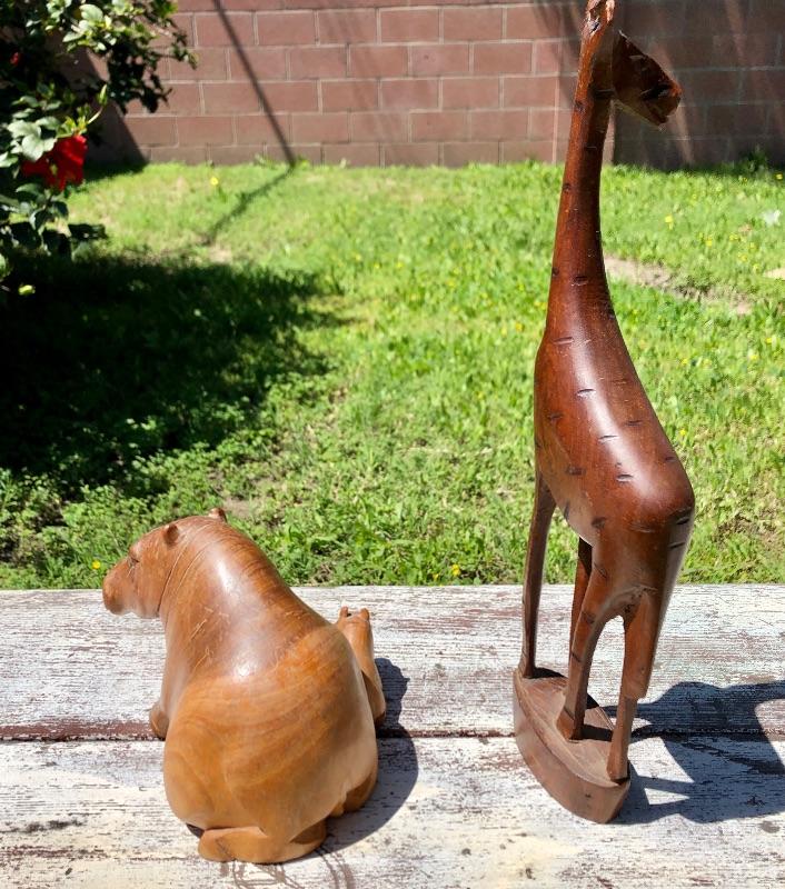 Pair of Wood Animal Figurines. Hippo with baby and a giraffe. Giraffe has a small chip in the ear.