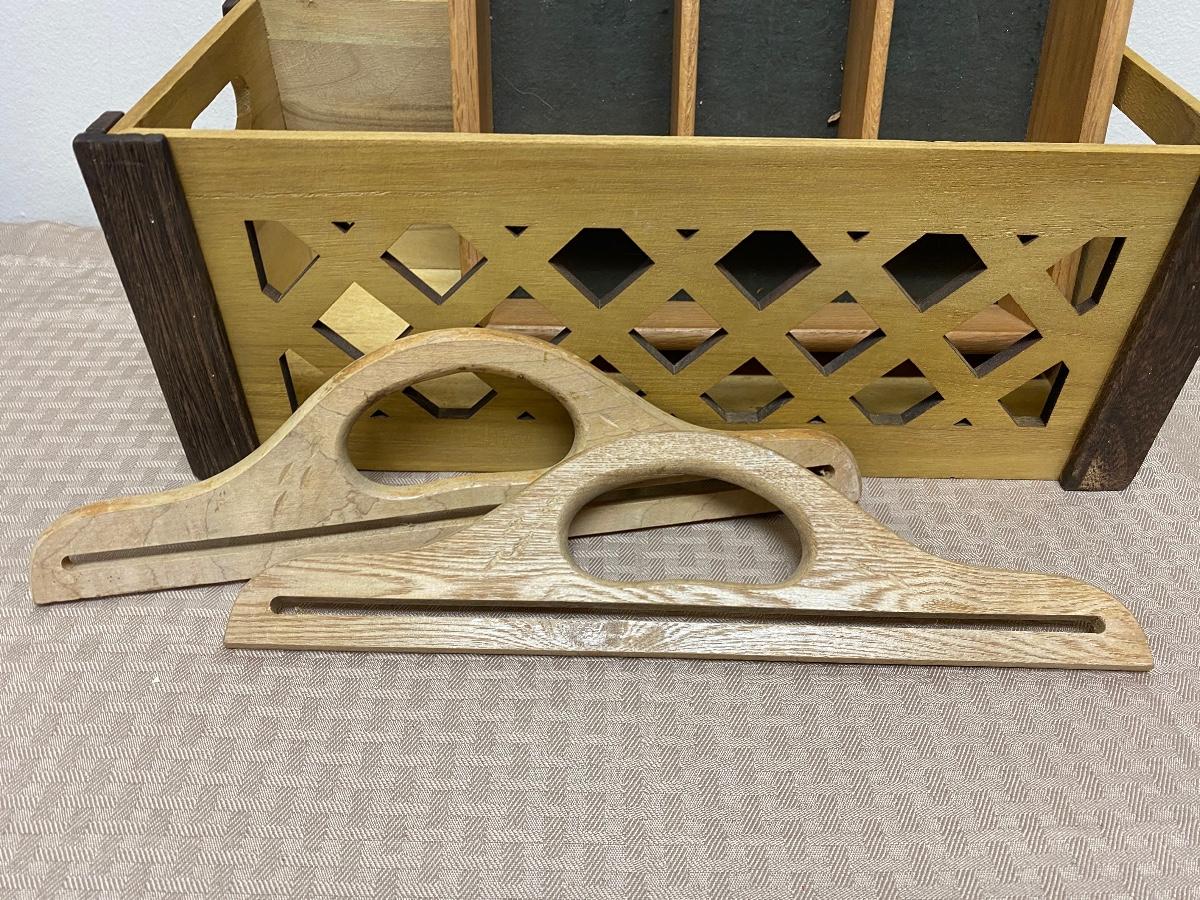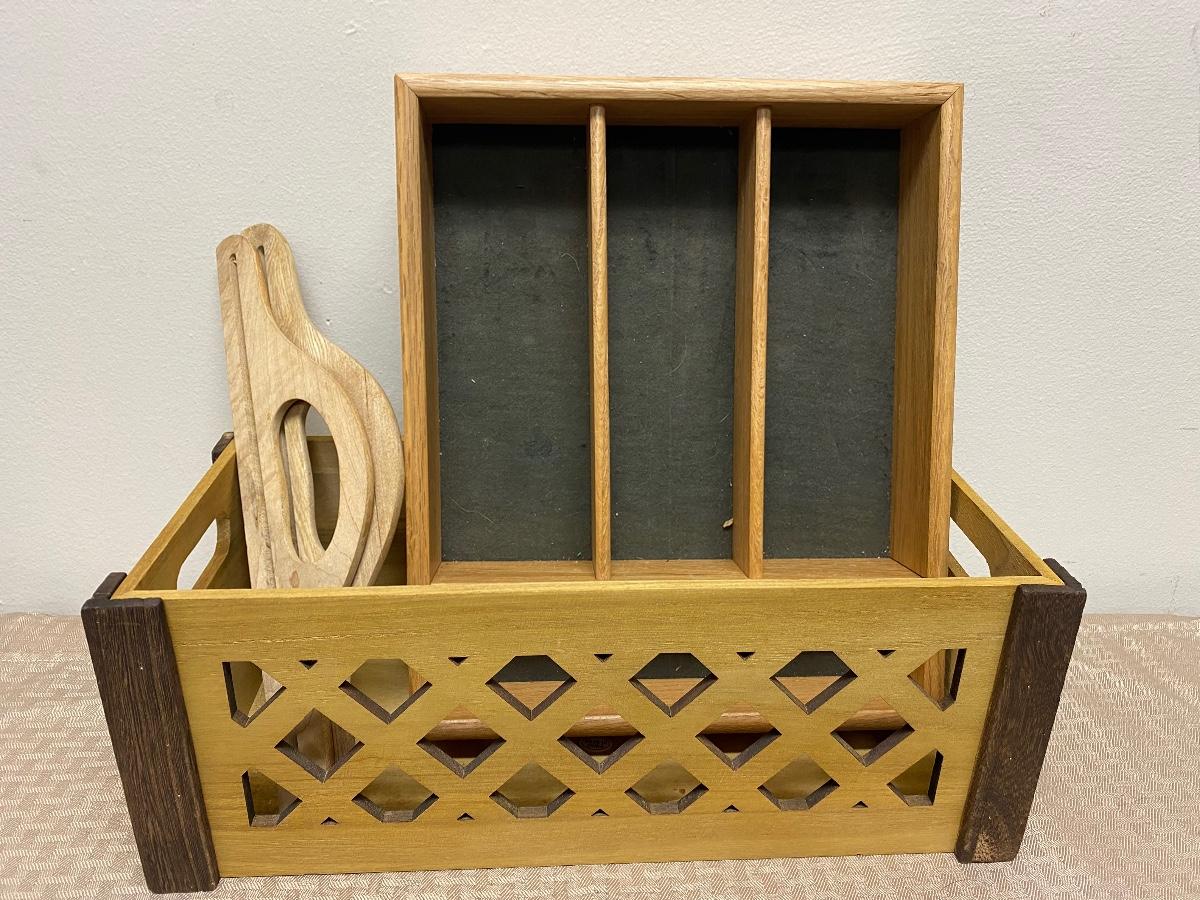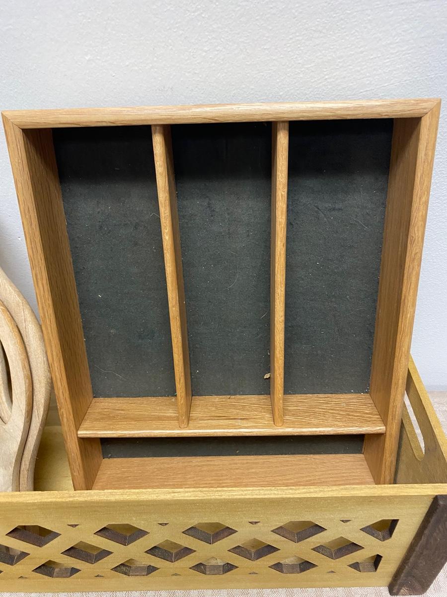 Three item lot of wooden home decor items. Rectangular cut out design box, a divided organizer, and a pair of wood bag handles. Handles could be crafted or repurposed into wall hanging edges. Box is big, about 16" length.
