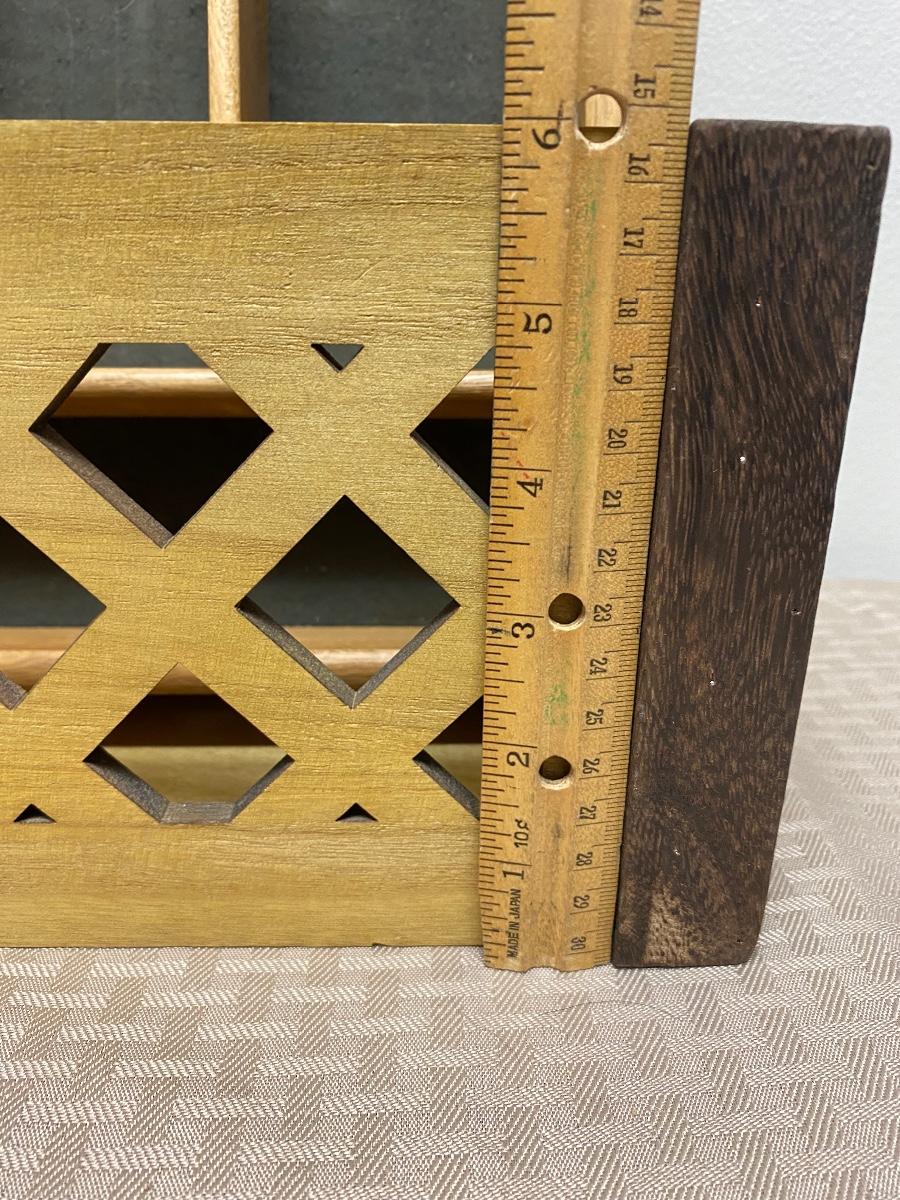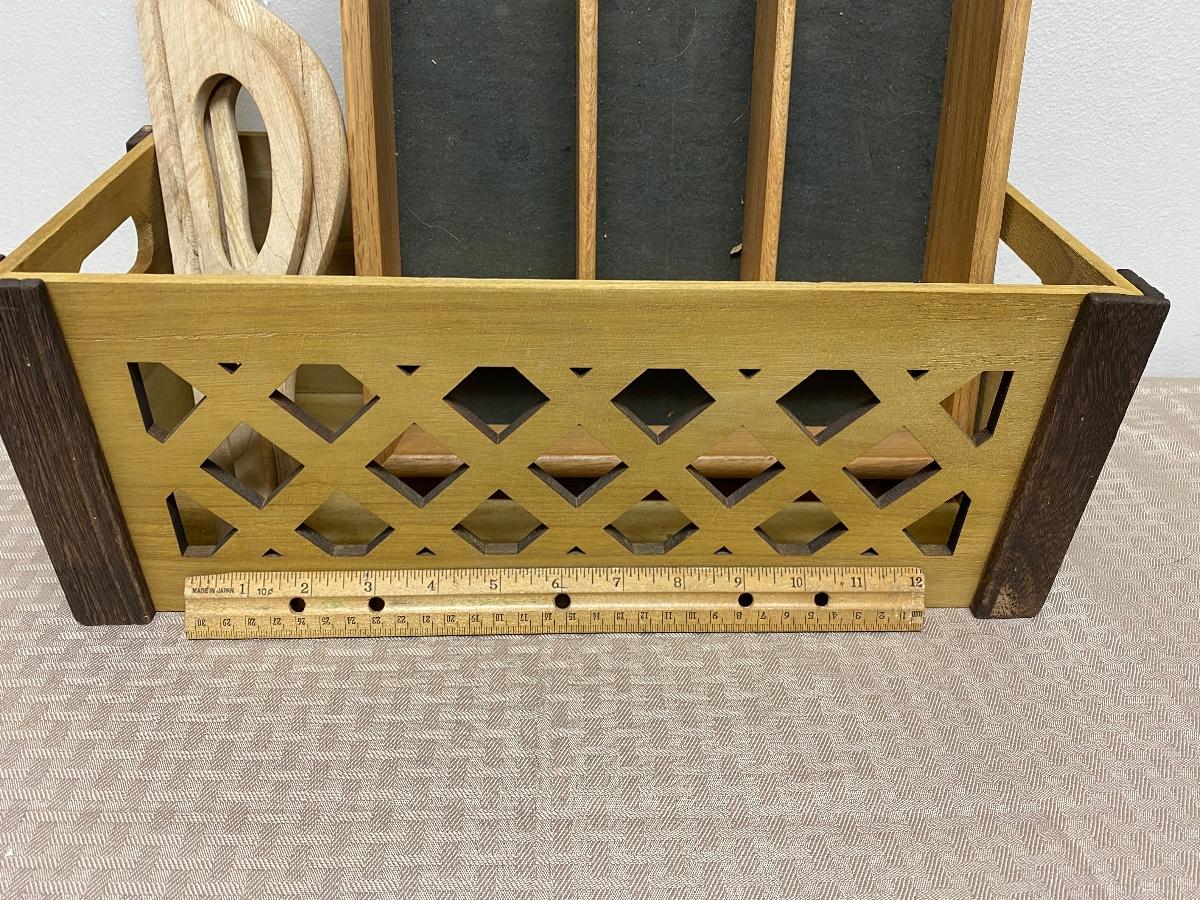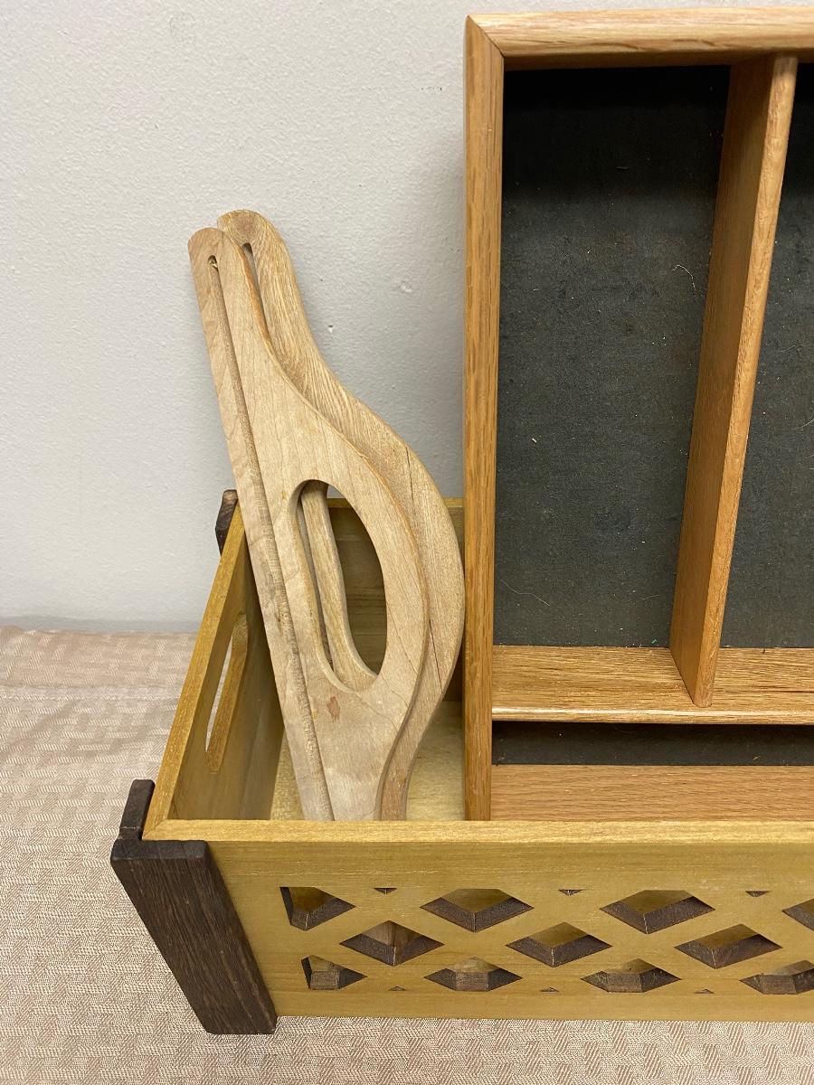 Three item lot of wooden home decor items. Rectangular cut out design box, a divided organizer, and a pair of wood bag handles. Handles could be crafted or repurposed into wall hanging edges. Box is big, about 16" length.