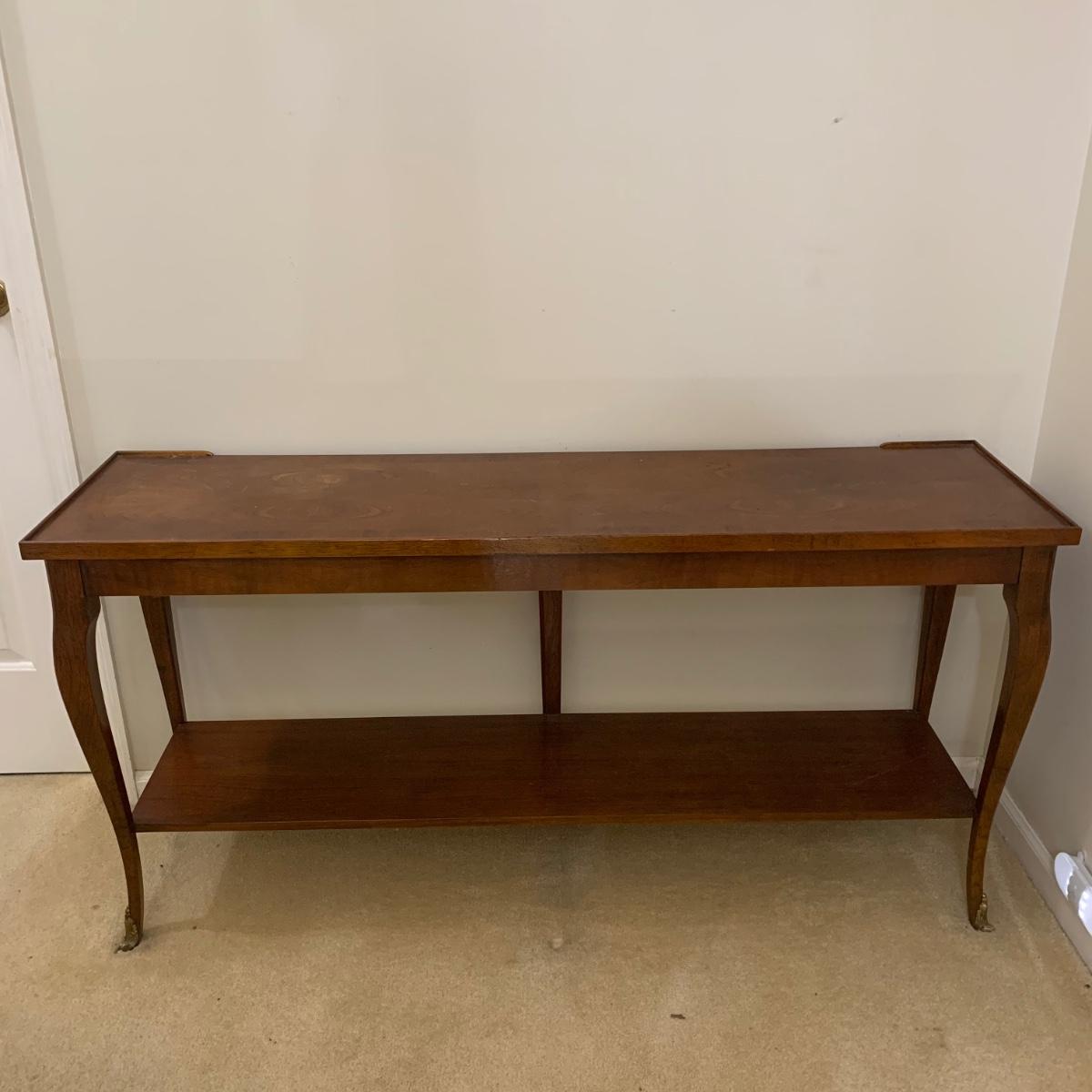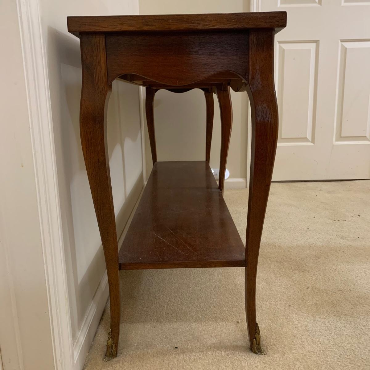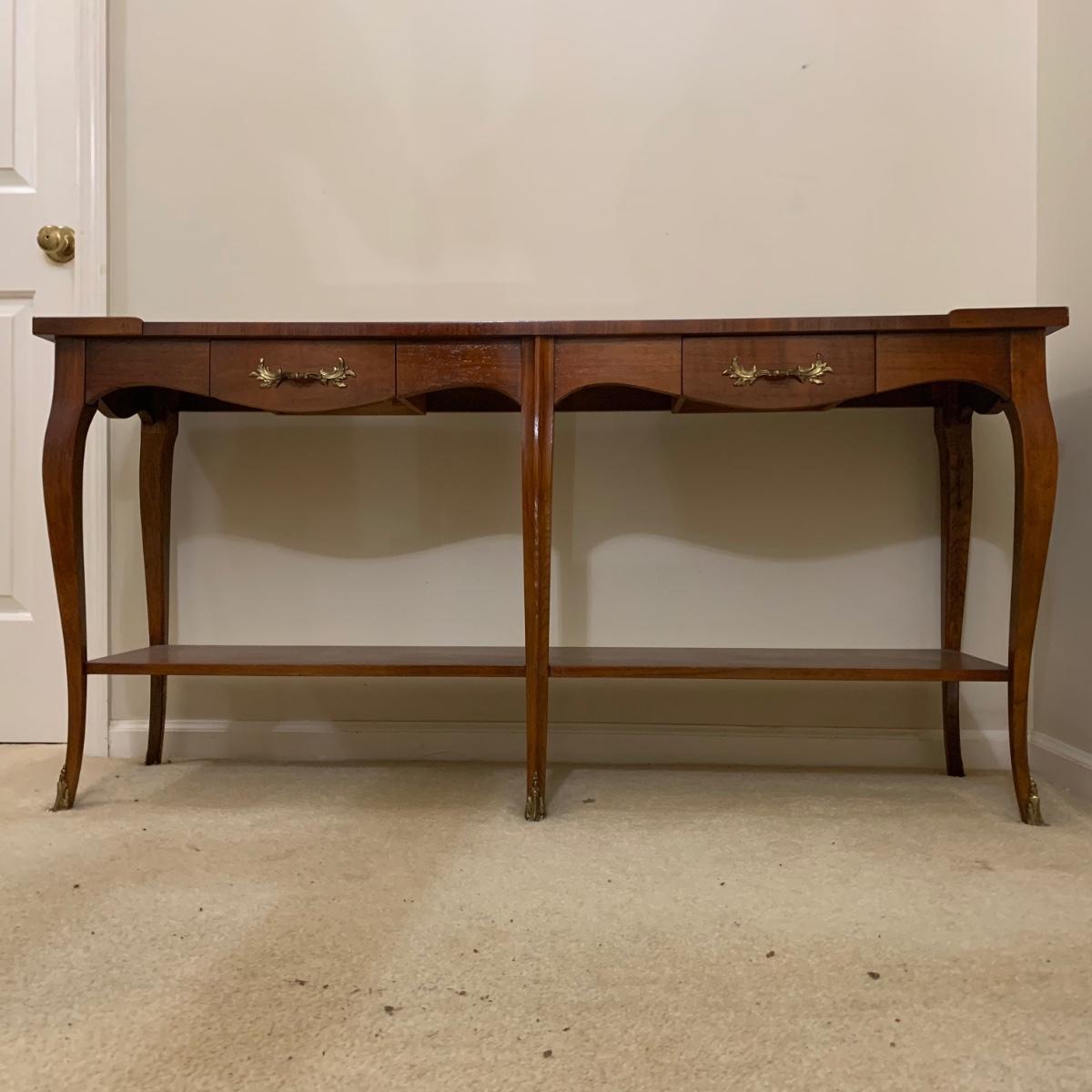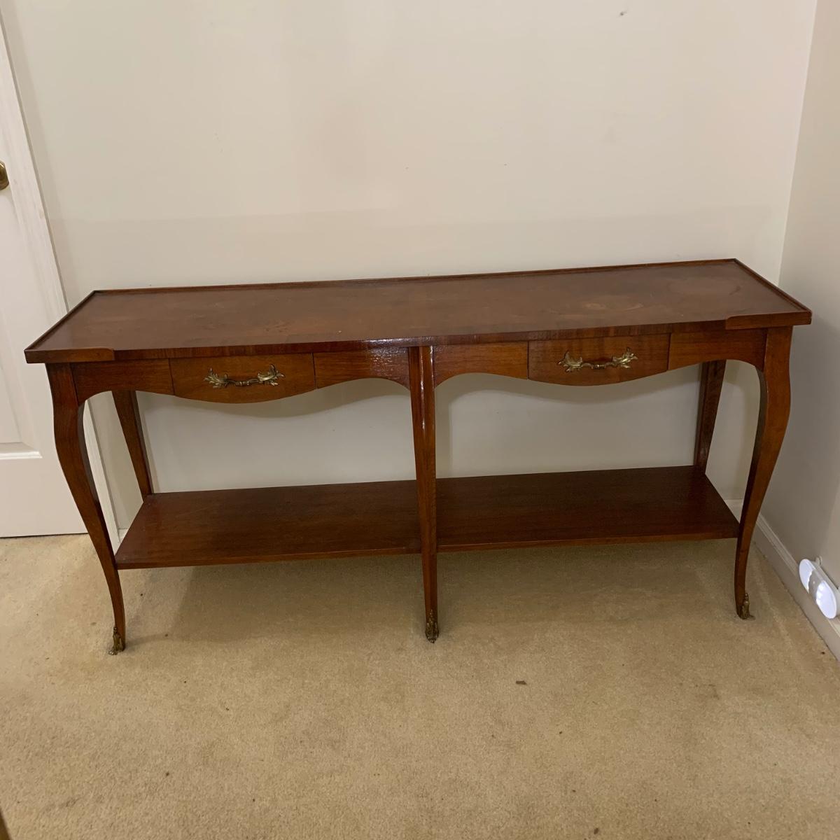 This console table features beautifully inlaid wood borders with two drawers crafted with dovetail joinery. Console table has nicely curved legs that lead to a lower level shelf and eventually, brass-like feet. It measures 54”L x 14.5”W x 27”H. Table has a few blemishes, including a loose piece of wood on the front left corner. This could easily be reconnected with glue. Otherwise, in good condition. See photos for more details.