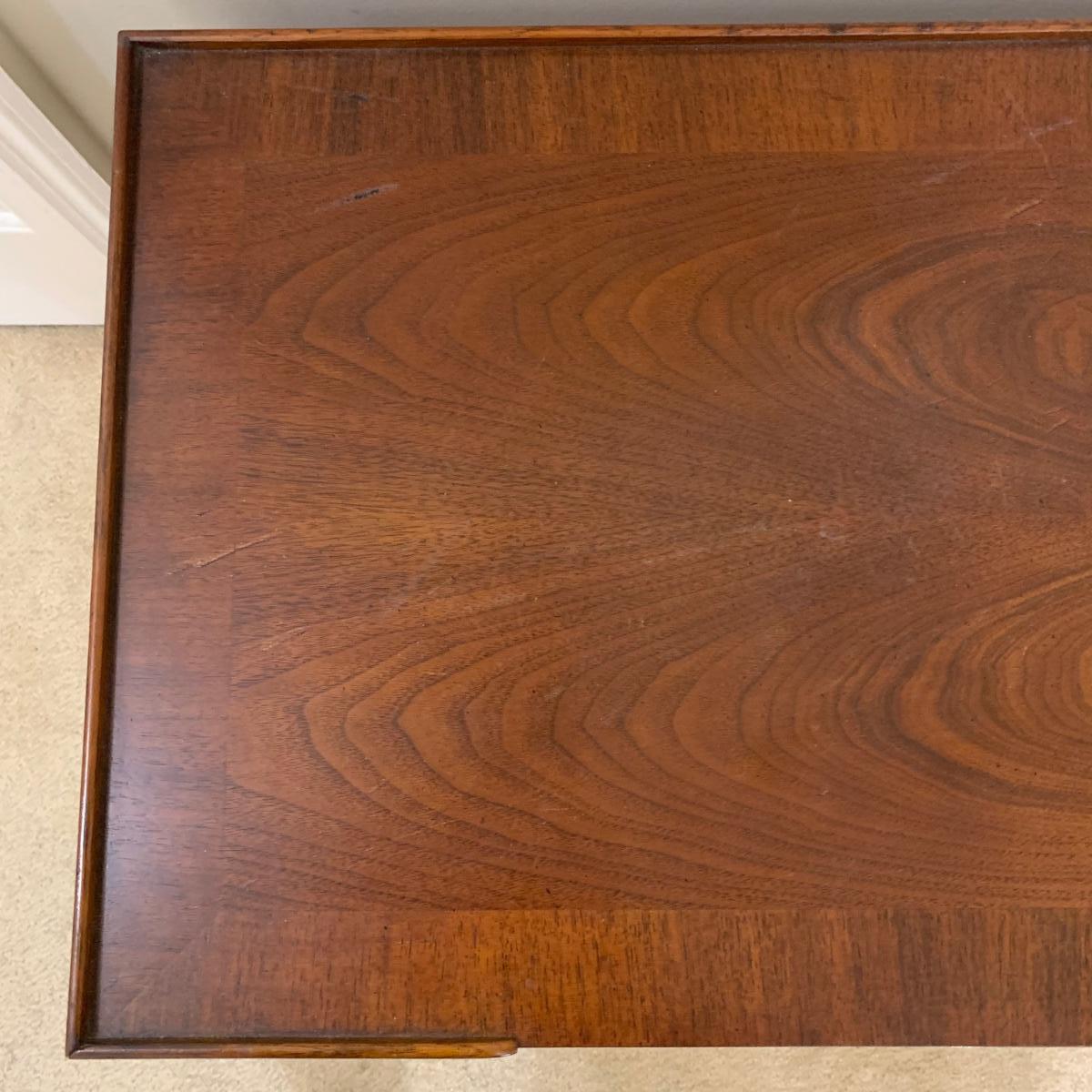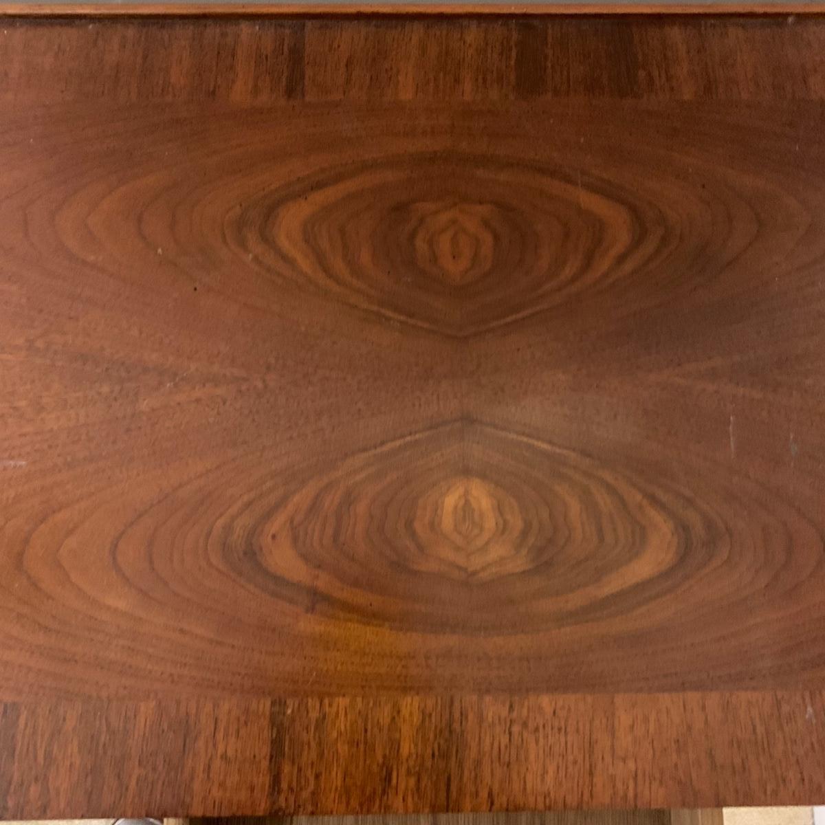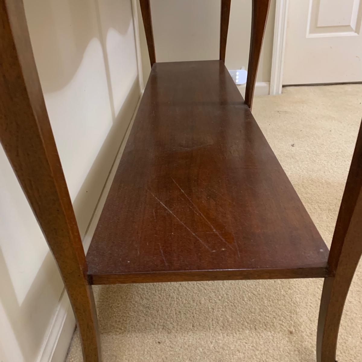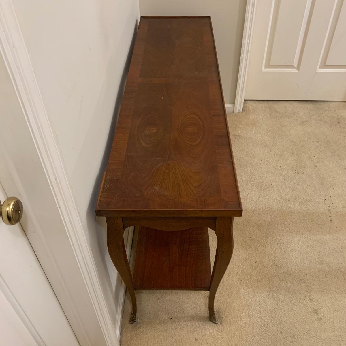 This console table features beautifully inlaid wood borders with two drawers crafted with dovetail joinery. Console table has nicely curved legs that lead to a lower level shelf and eventually, brass-like feet. It measures 54”L x 14.5”W x 27”H. Table has a few blemishes, including a loose piece of wood on the front left corner. This could easily be reconnected with glue. Otherwise, in good condition. See photos for more details.