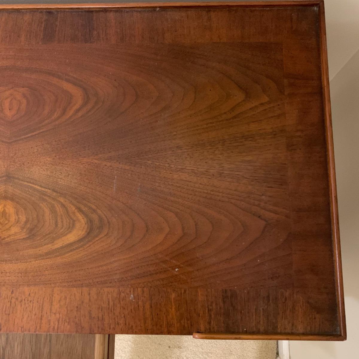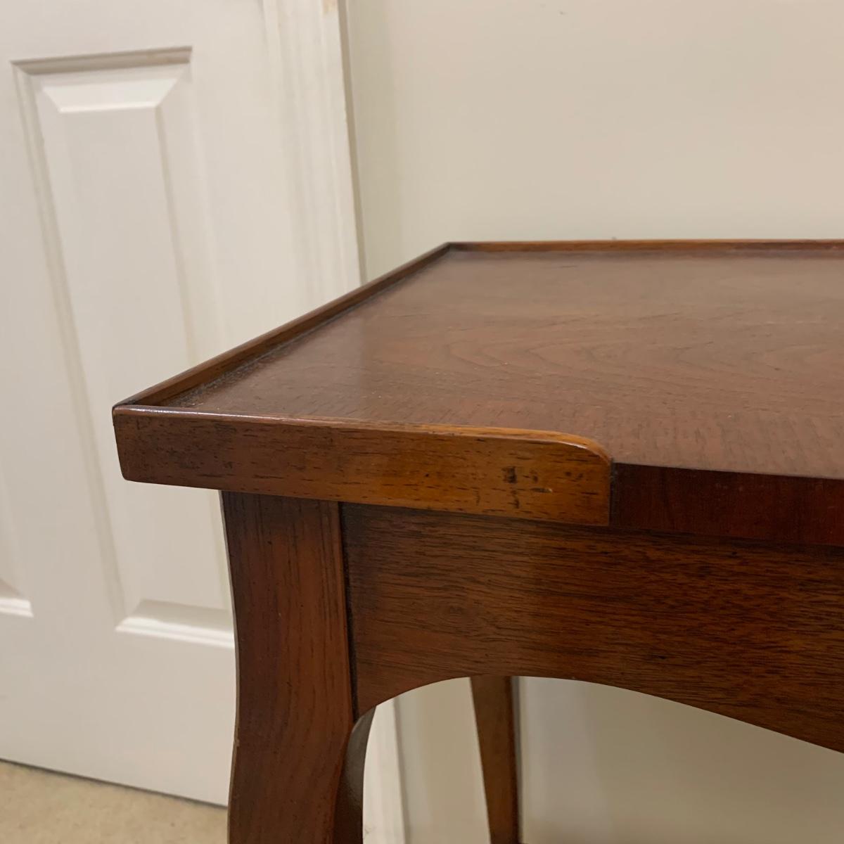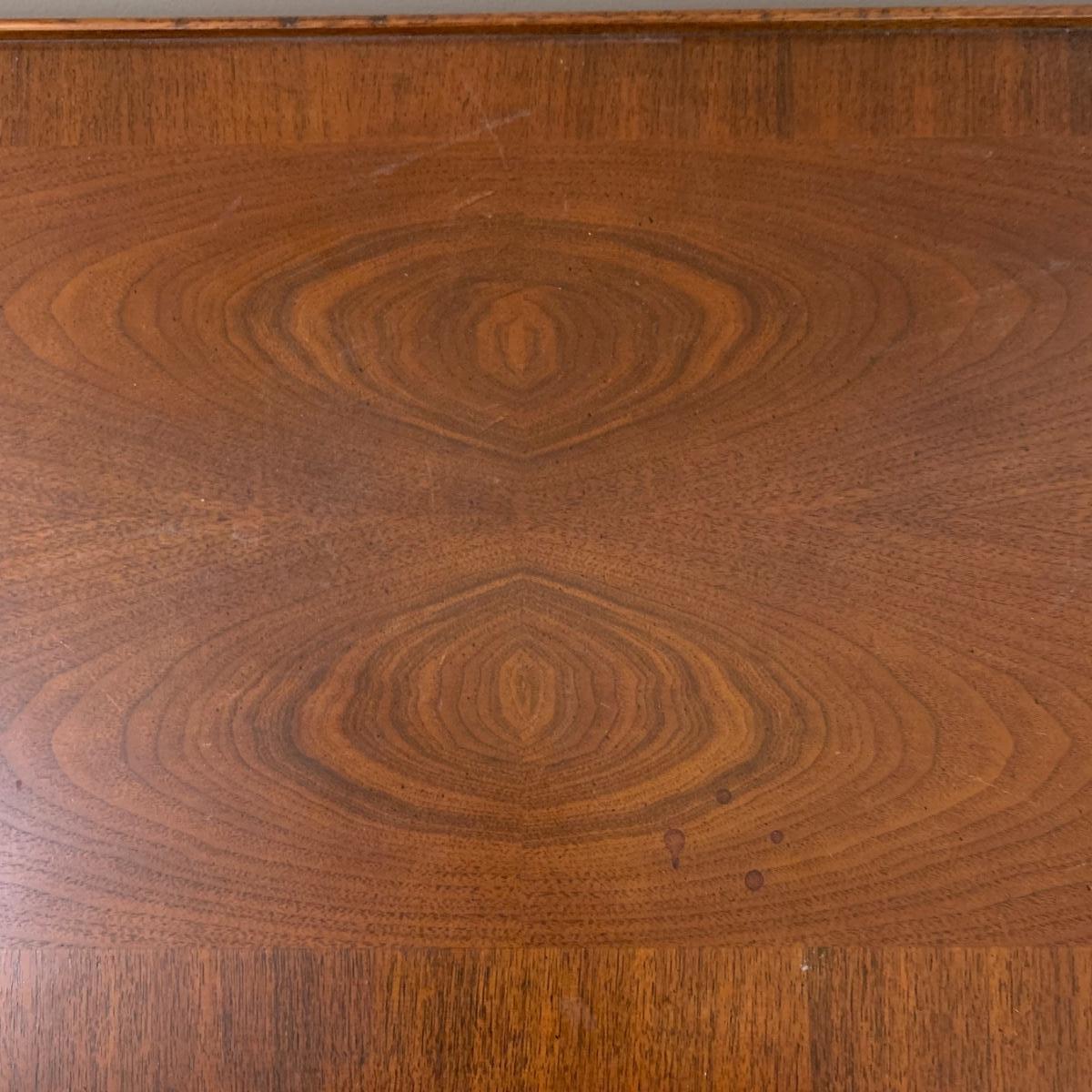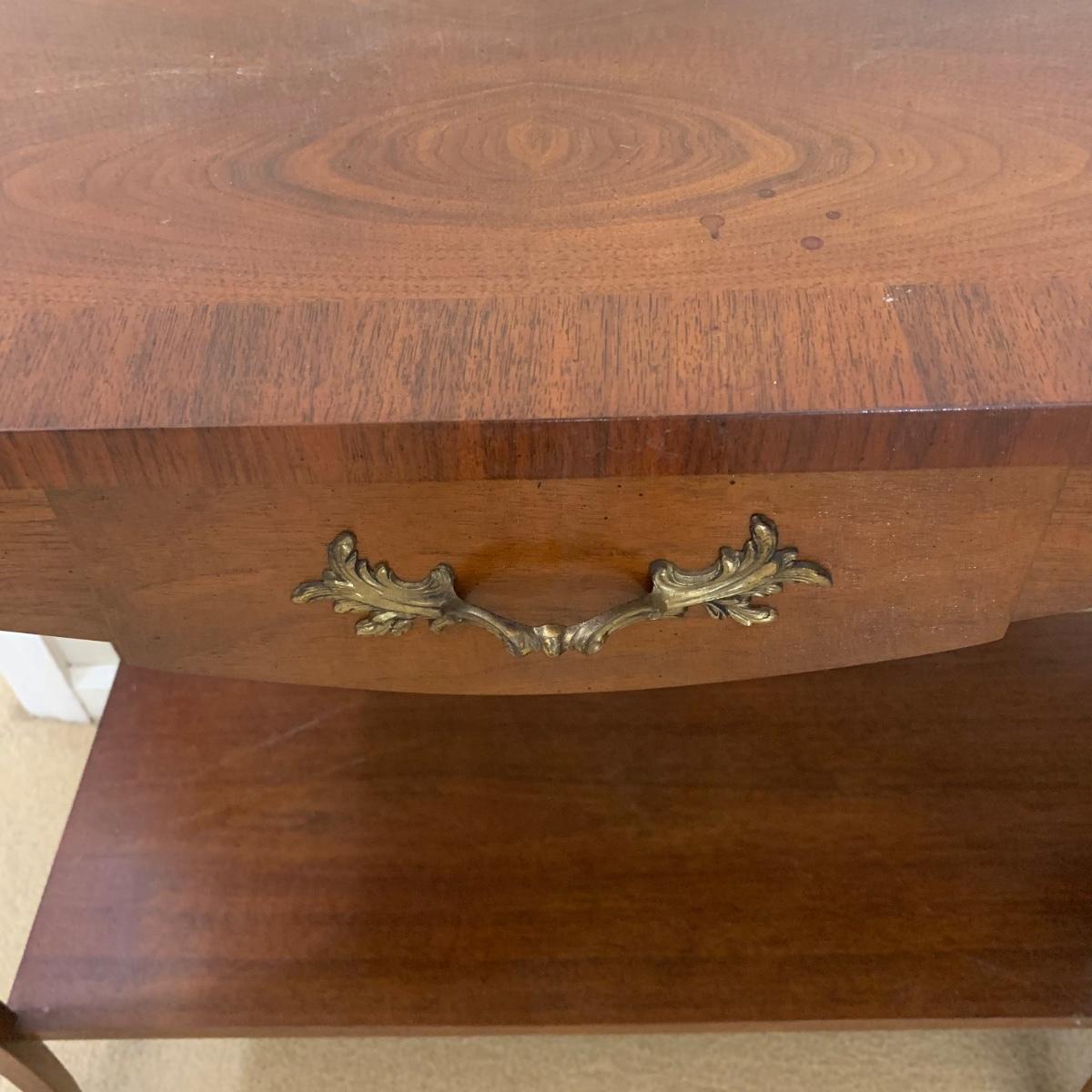 This console table features beautifully inlaid wood borders with two drawers crafted with dovetail joinery. Console table has nicely curved legs that lead to a lower level shelf and eventually, brass-like feet. It measures 54”L x 14.5”W x 27”H. Table has a few blemishes, including a loose piece of wood on the front left corner. This could easily be reconnected with glue. Otherwise, in good condition. See photos for more details.