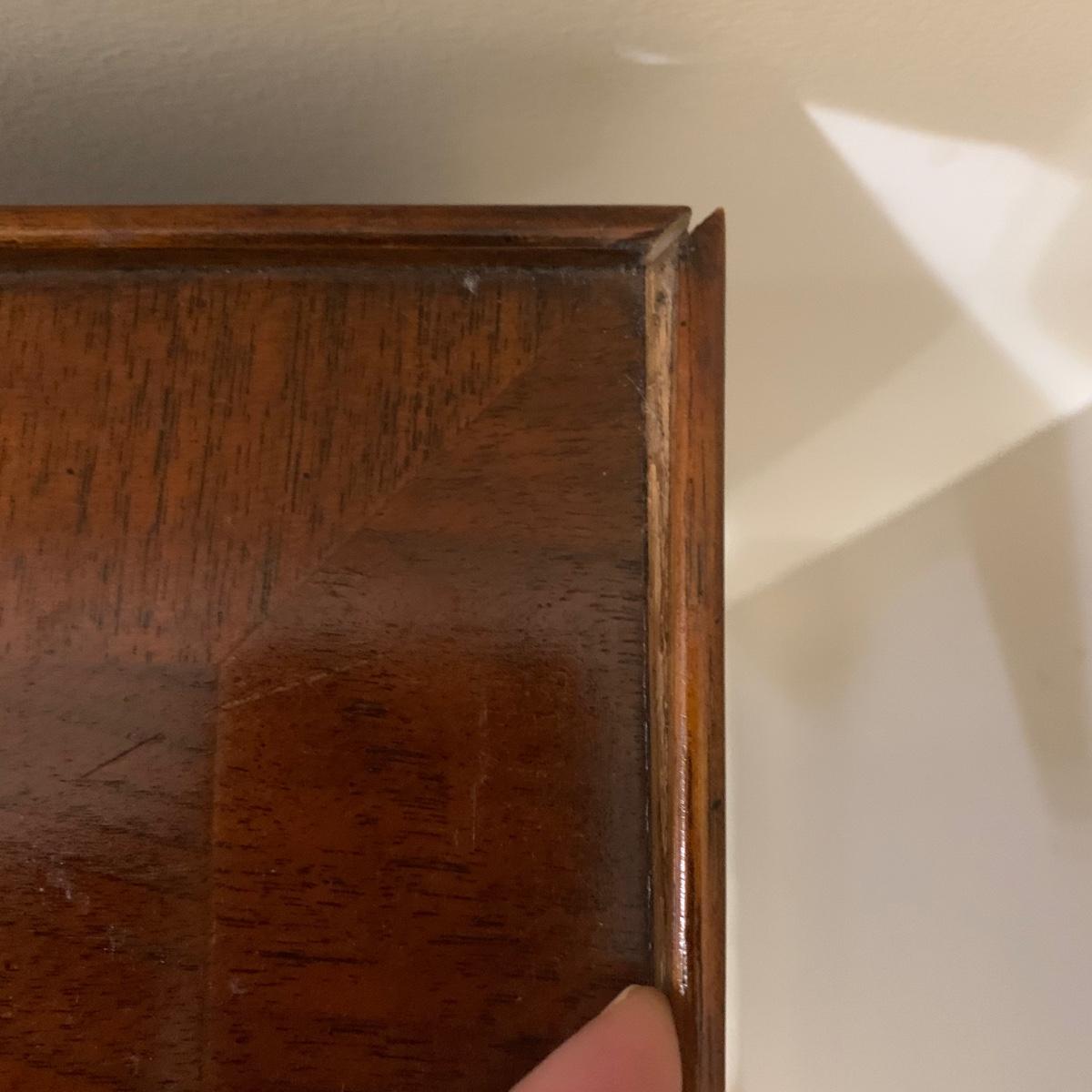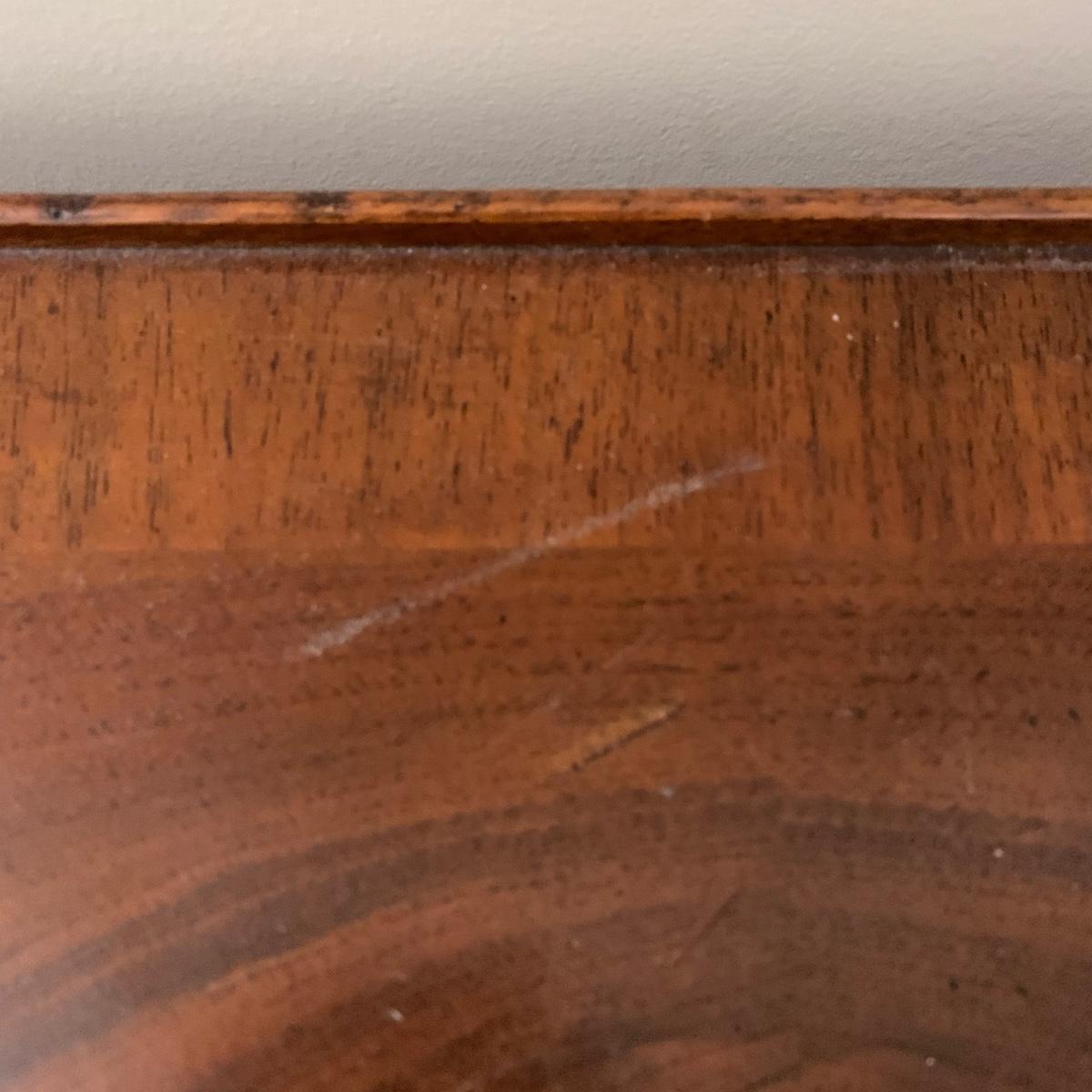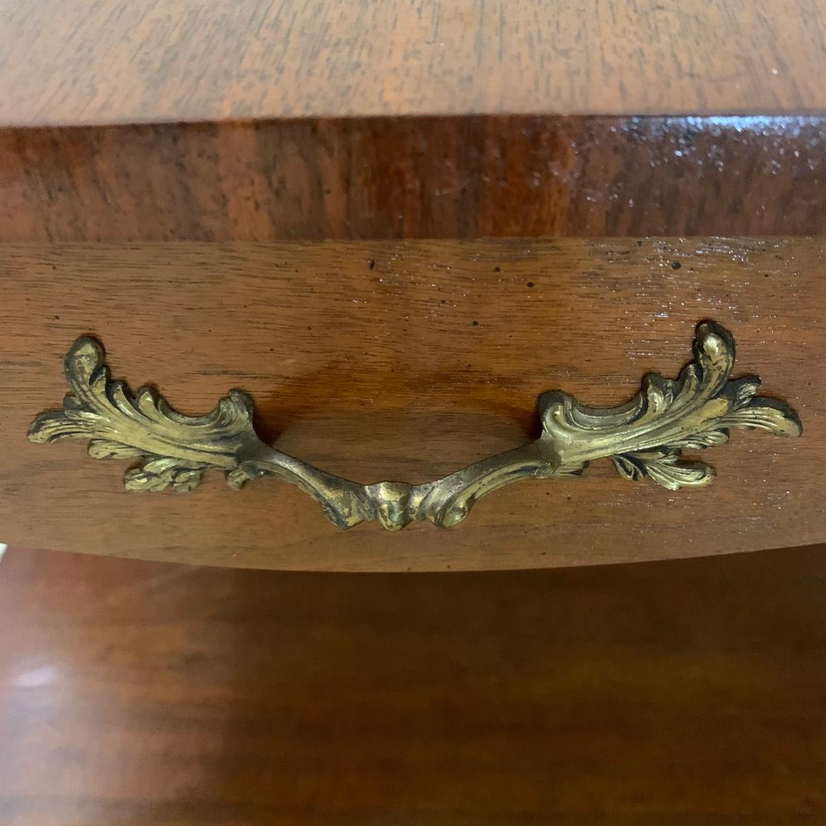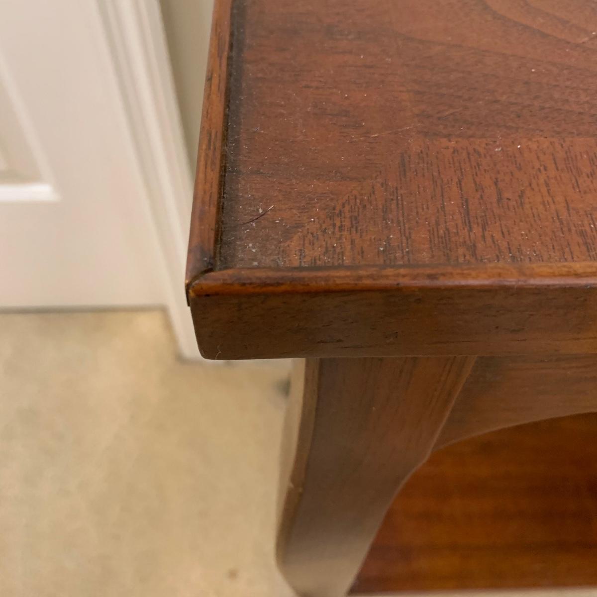 This console table features beautifully inlaid wood borders with two drawers crafted with dovetail joinery. Console table has nicely curved legs that lead to a lower level shelf and eventually, brass-like feet. It measures 54”L x 14.5”W x 27”H. Table has a few blemishes, including a loose piece of wood on the front left corner. This could easily be reconnected with glue. Otherwise, in good condition. See photos for more details.