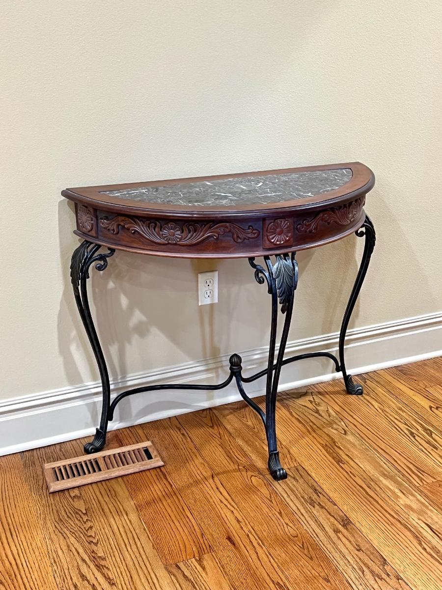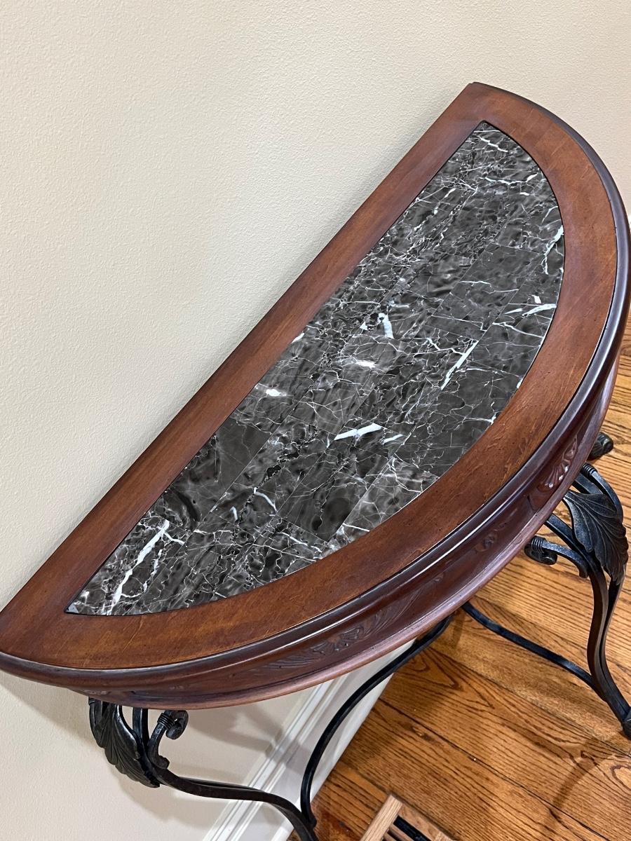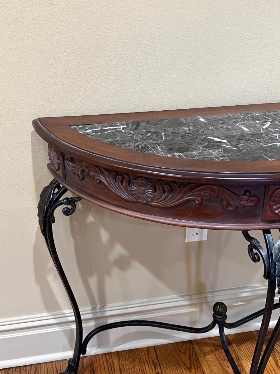 Table has a white wash finish. Has faux marble top. No brand name found. 32.5” H x 39” W x 17” D