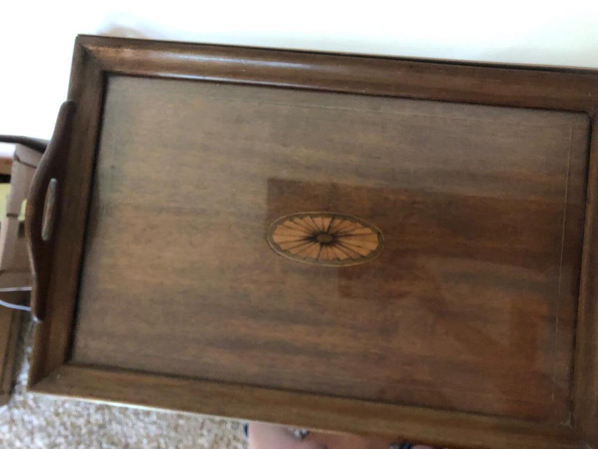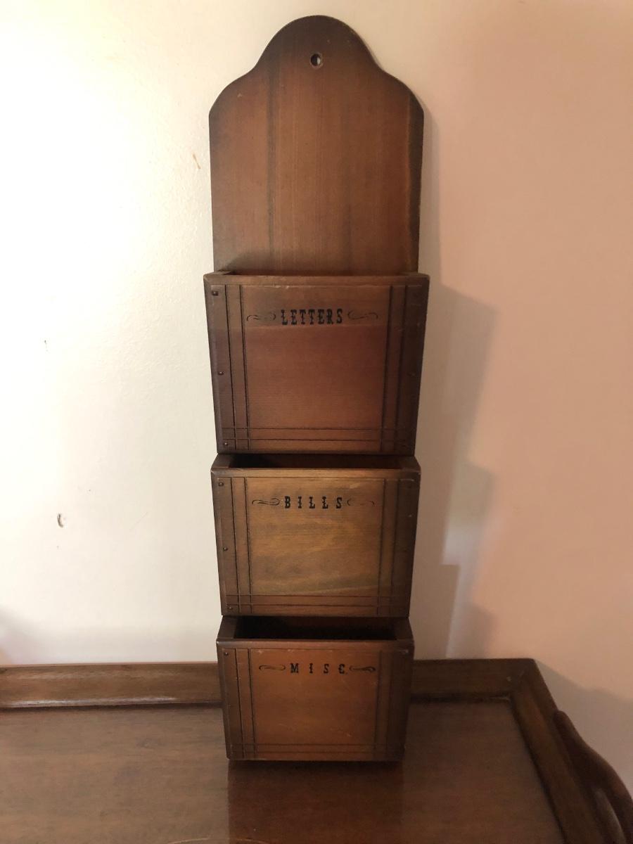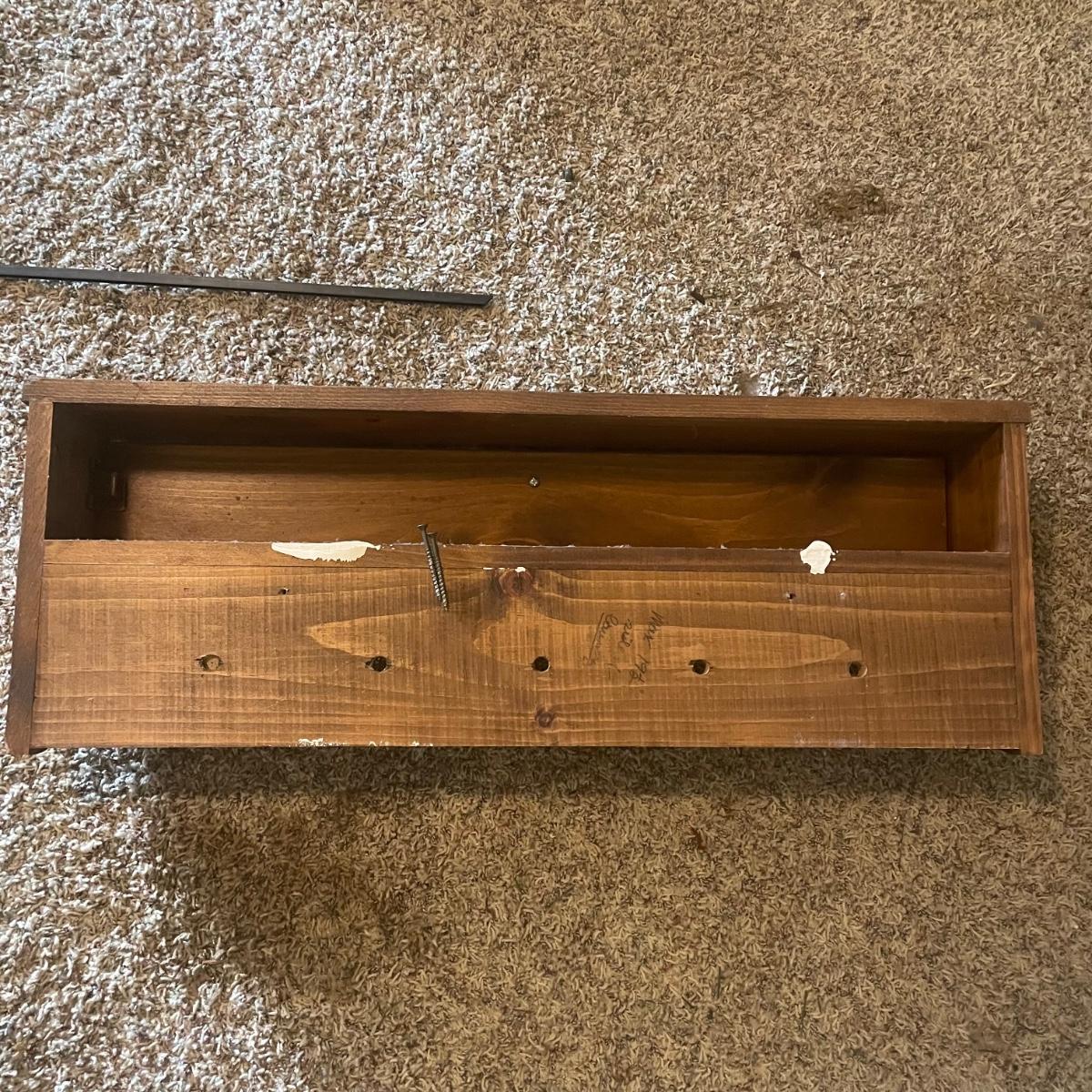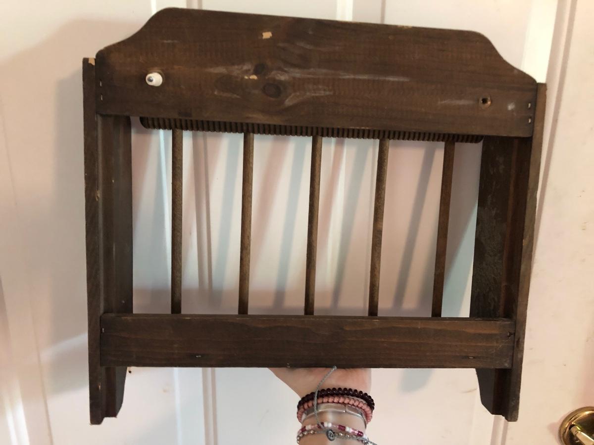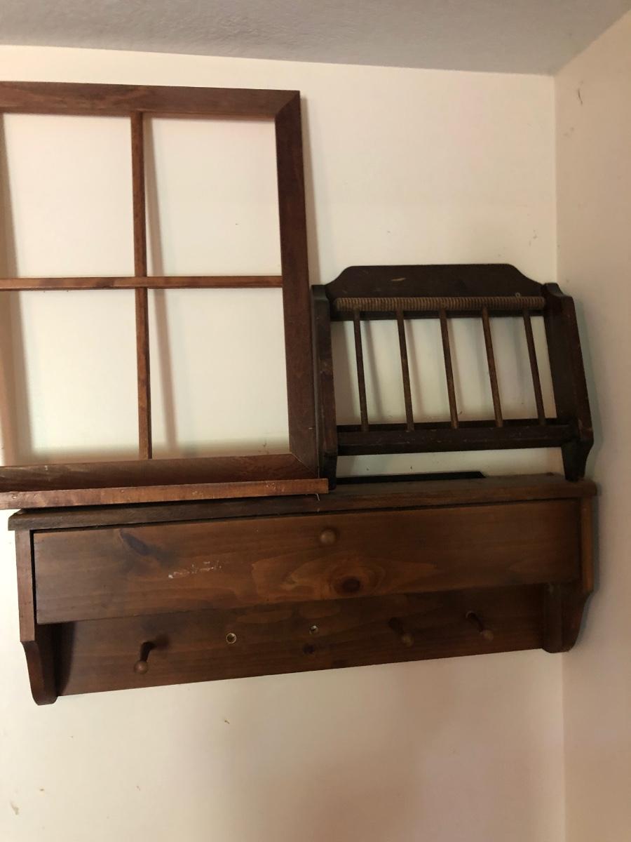 All 6 of these item are real wood. Some parts are missing like two pegs on the shelf, but replaceable. The drawer on the shelf opens. A beautiful wooden tray with a glass face. There is a magazine holder that could be mounted. A window pane display that we believe was once used as a picture frame. Lot also includes a bed side table, as well as a vintage paper/mail organizer.