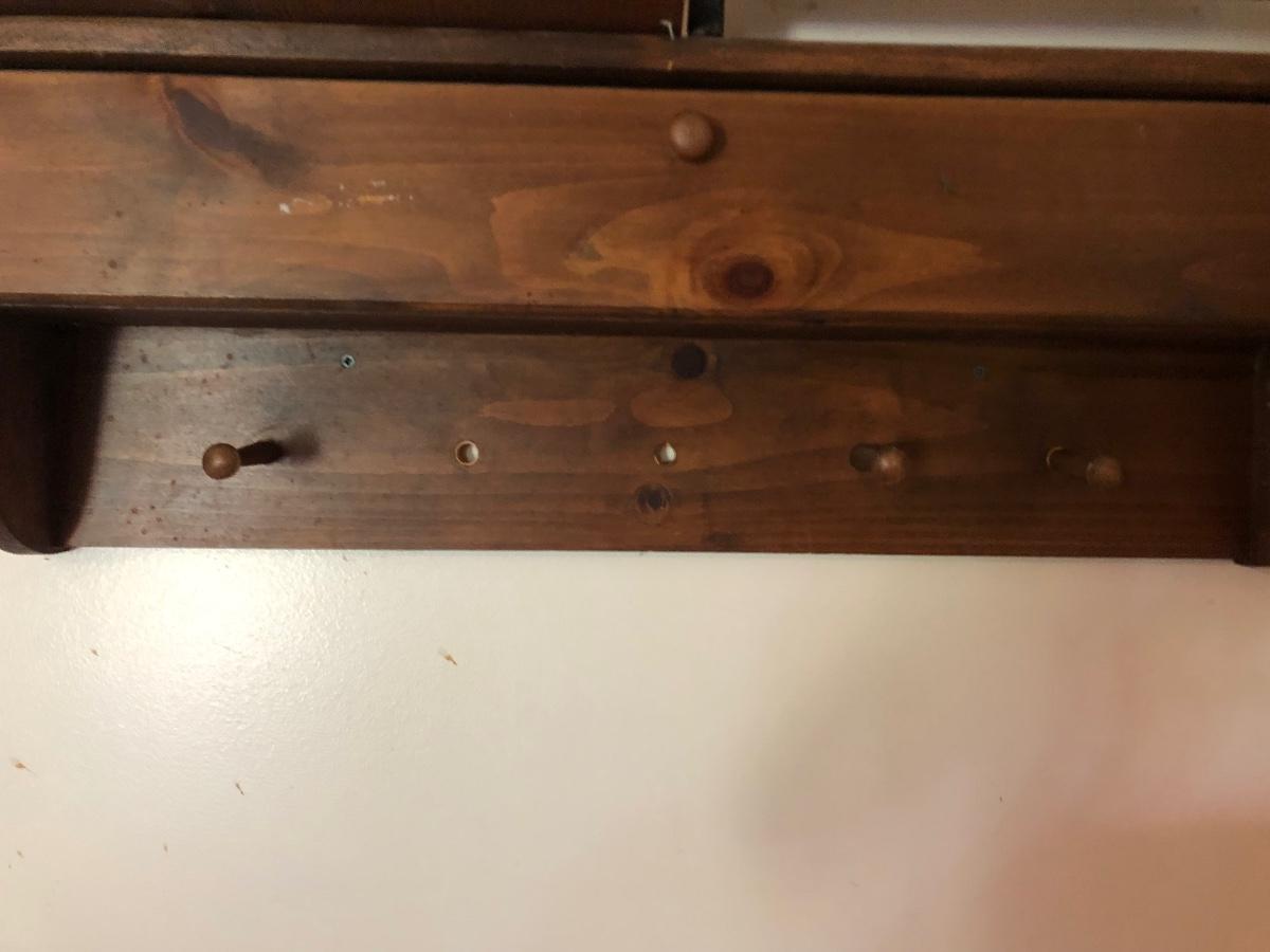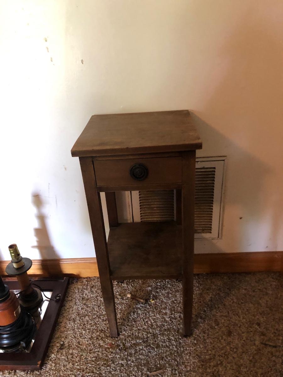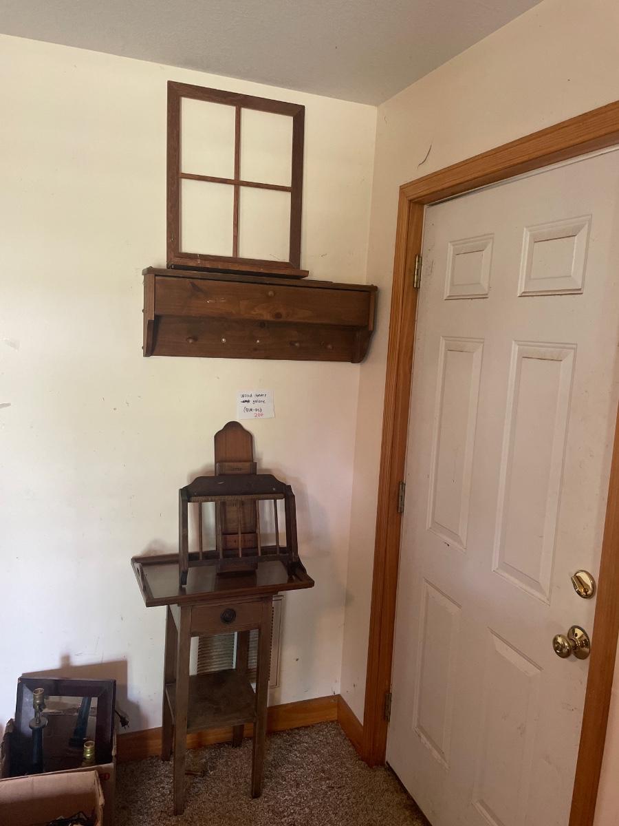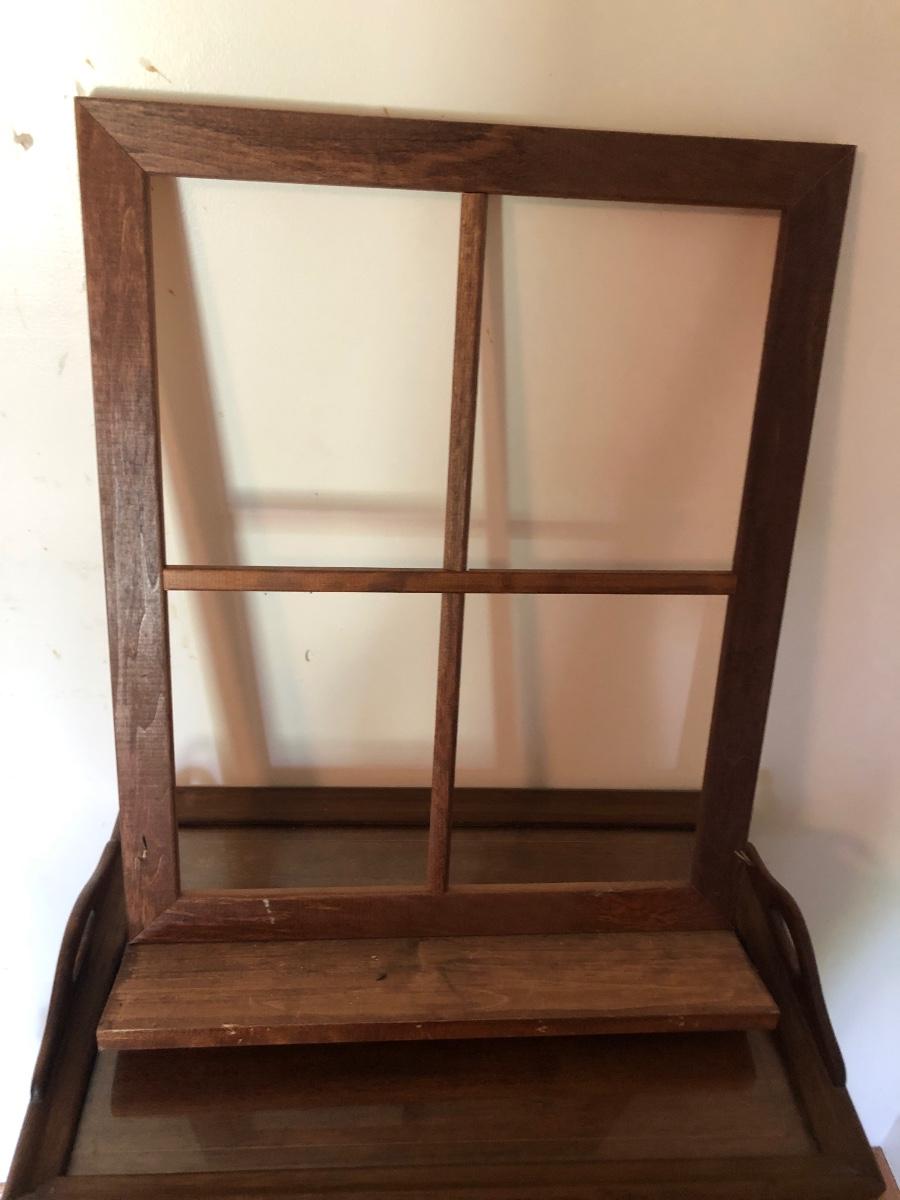 All 6 of these item are real wood. Some parts are missing like two pegs on the shelf, but replaceable. The drawer on the shelf opens. A beautiful wooden tray with a glass face. There is a magazine holder that could be mounted. A window pane display that we believe was once used as a picture frame. Lot also includes a bed side table, as well as a vintage paper/mail organizer.