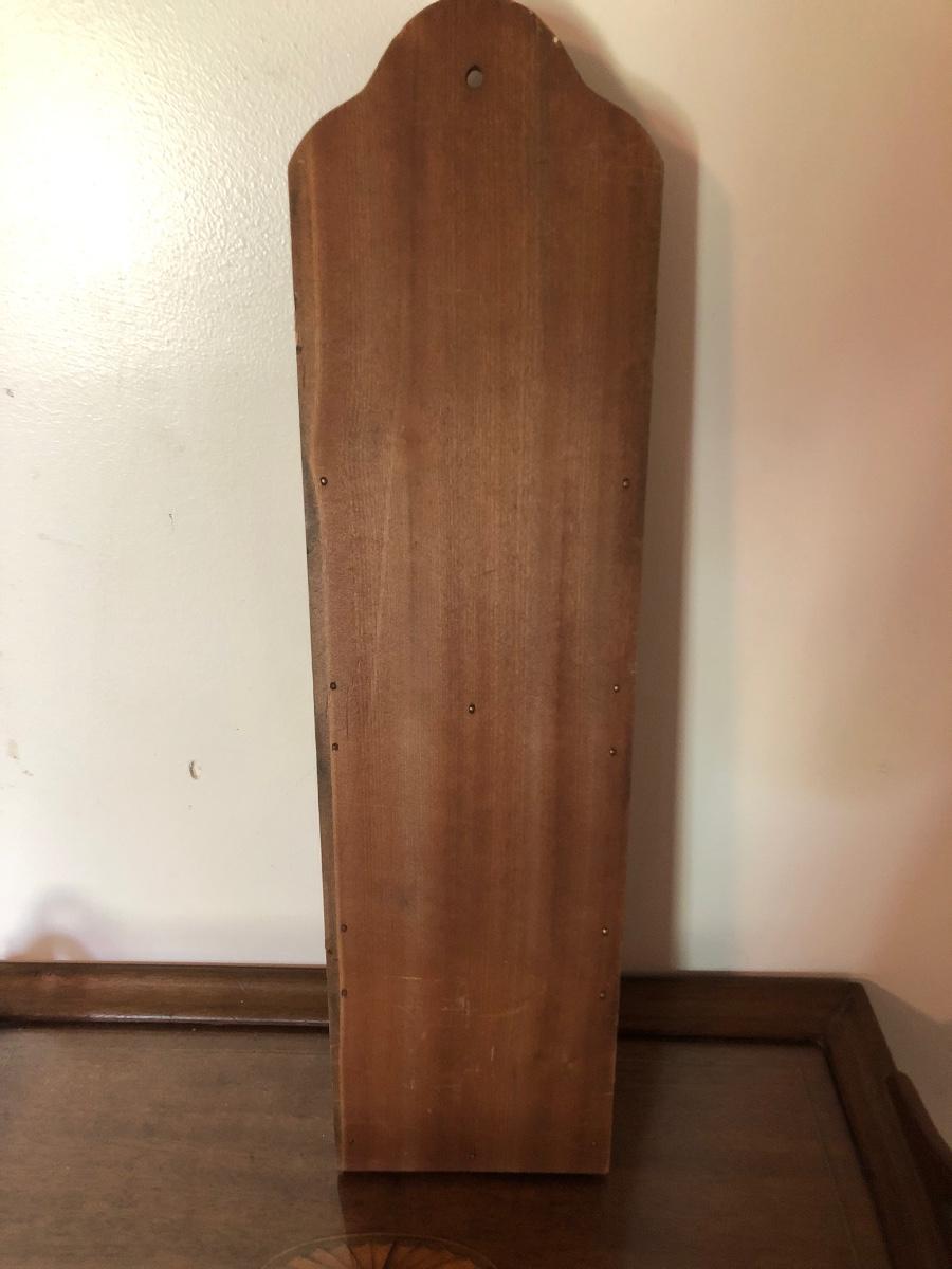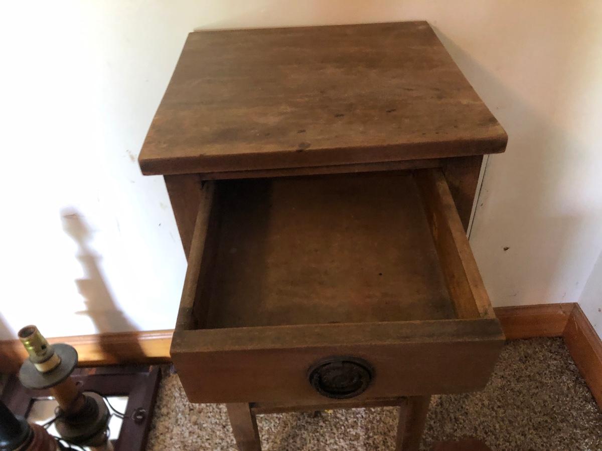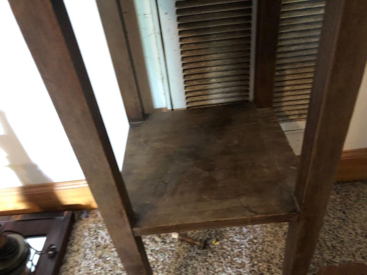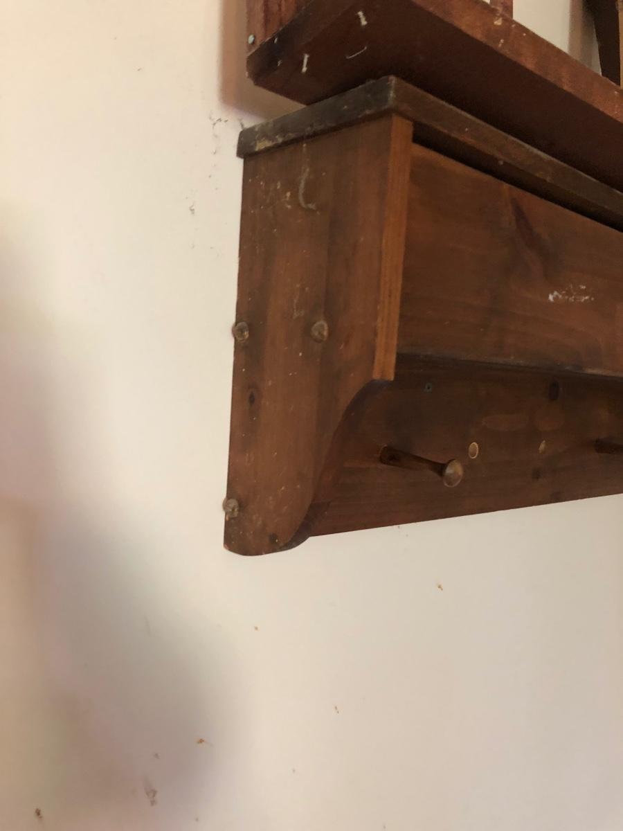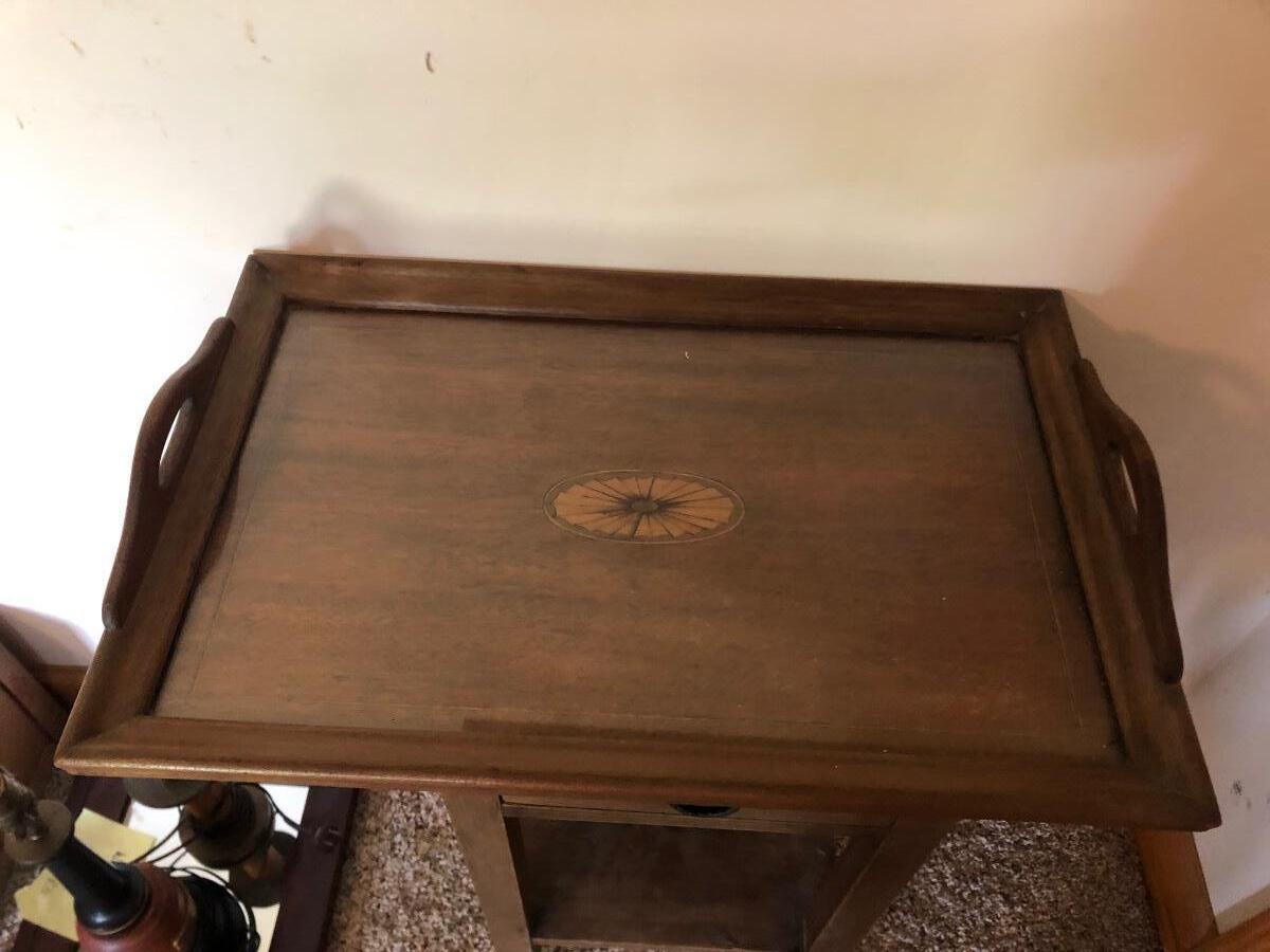 All 6 of these item are real wood. Some parts are missing like two pegs on the shelf, but replaceable. The drawer on the shelf opens. A beautiful wooden tray with a glass face. There is a magazine holder that could be mounted. A window pane display that we believe was once used as a picture frame. Lot also includes a bed side table, as well as a vintage paper/mail organizer.