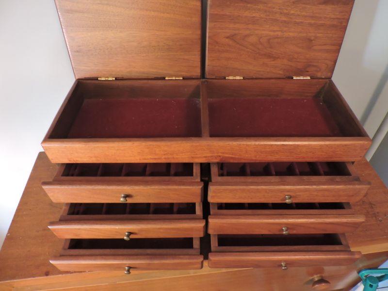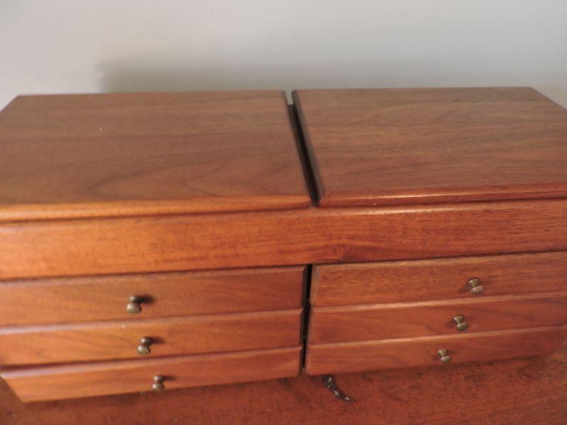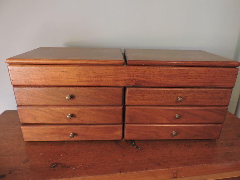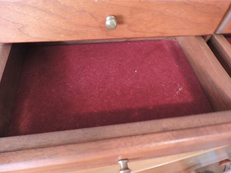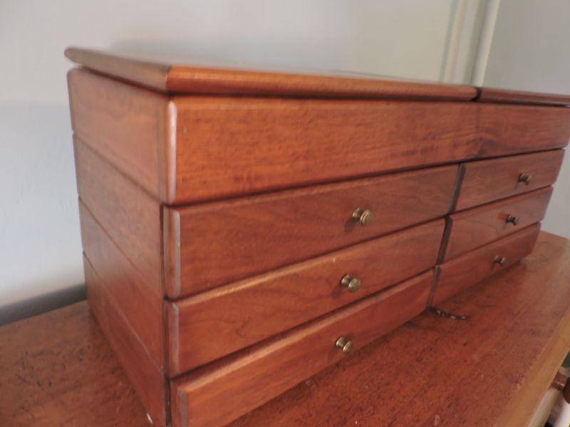 Wooden jewelry box with six drawers for keeping all your "pretties". **Please read Terms and Conditions before placing a bid. Pick up is Sunday, November 24 from 9am to 3pm or Tuesday, November 26 from 4pm-7pm in Mantua, NJ. All sales are final. All sales are as is, where is. Please review all photos. Any props included in photos are not included in listing. All measurements are approximate.