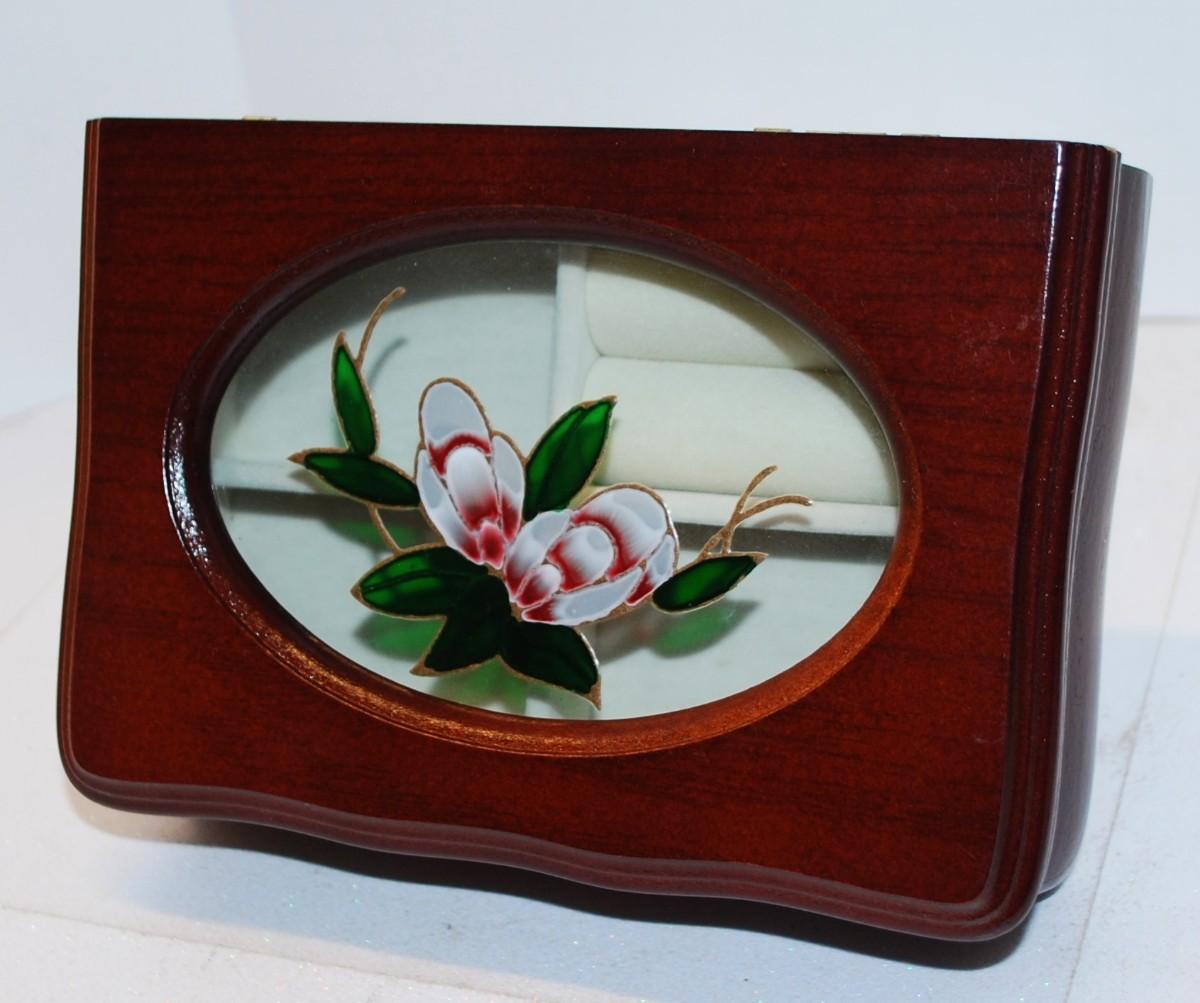 Wood Jewelry Box with Enameled Styled Flower Design + White Interior 6" x 4" x 2"