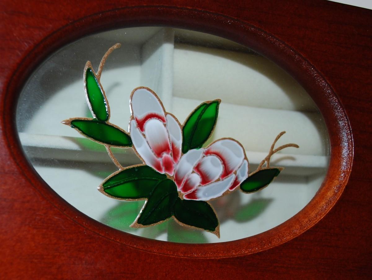 Wood Jewelry Box with Enameled Styled Flower Design + White Interior 6" x 4" x 2"