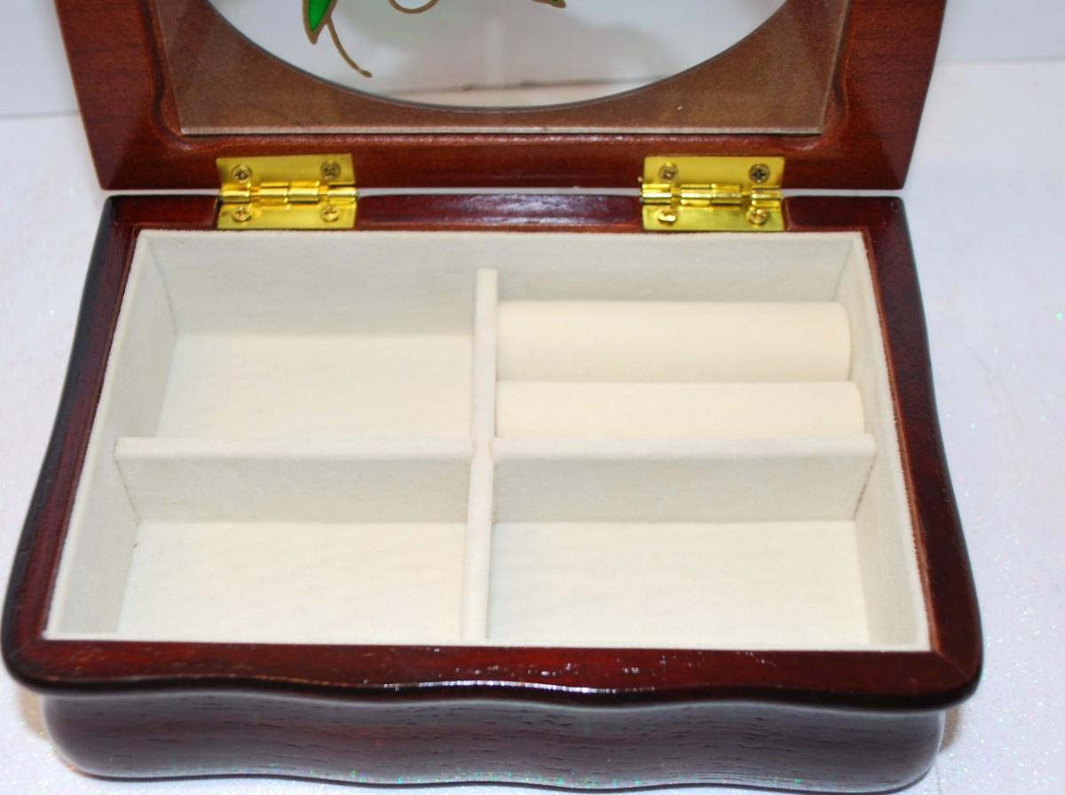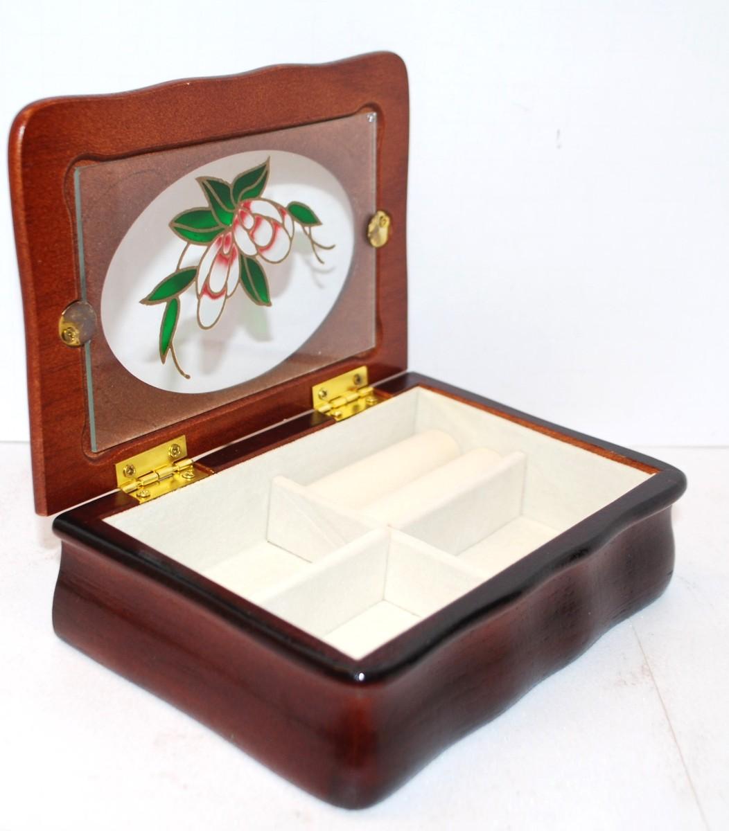 Wood Jewelry Box with Enameled Styled Flower Design + White Interior 6" x 4" x 2"