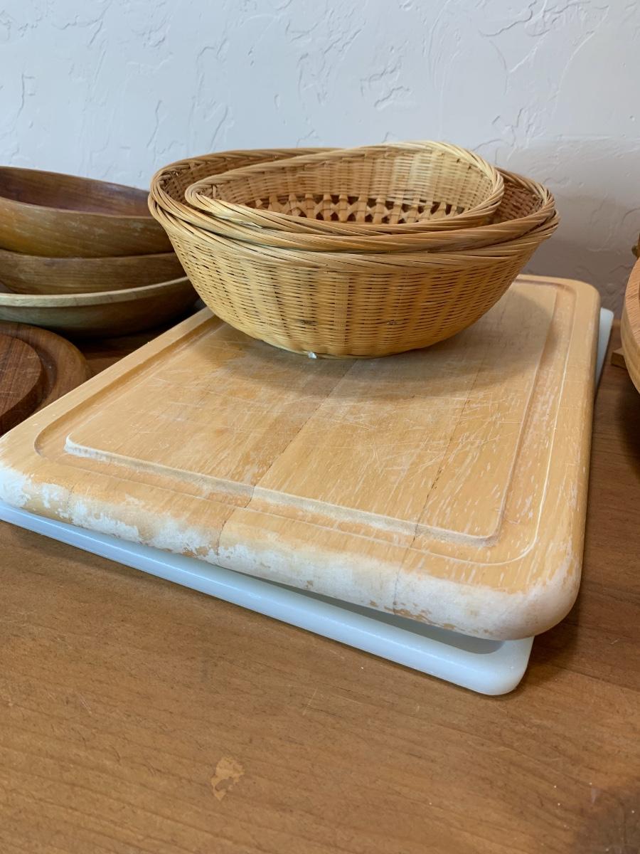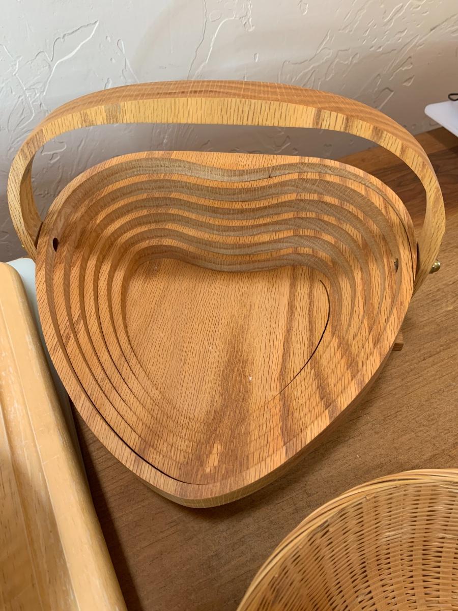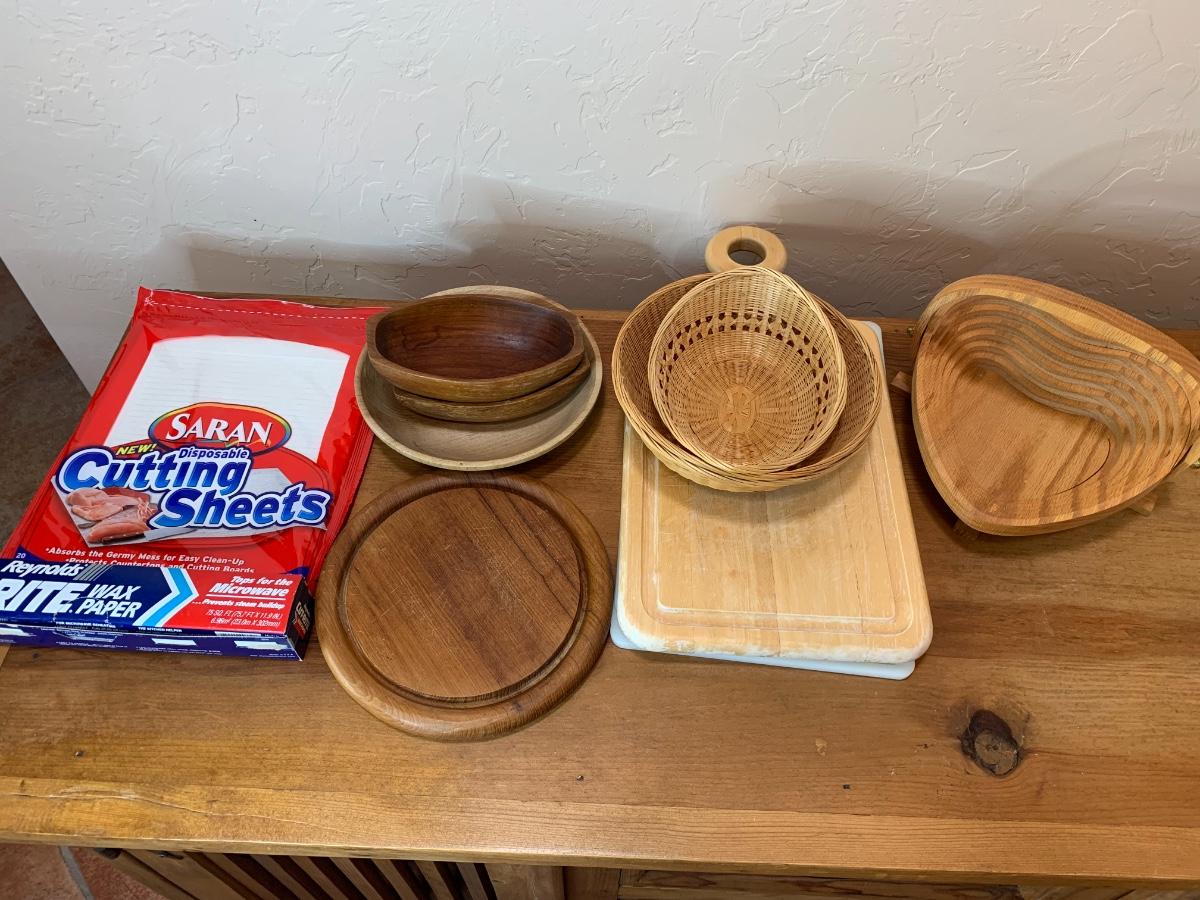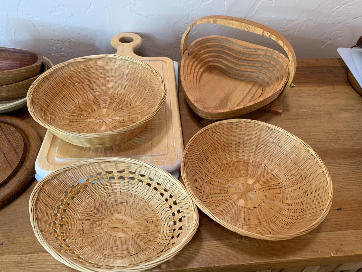 One collapsable heart bowl, 2 gel cutting boards, 2 wooden cutting boards, 3 baskets and 2 boat shaped wooden bowls