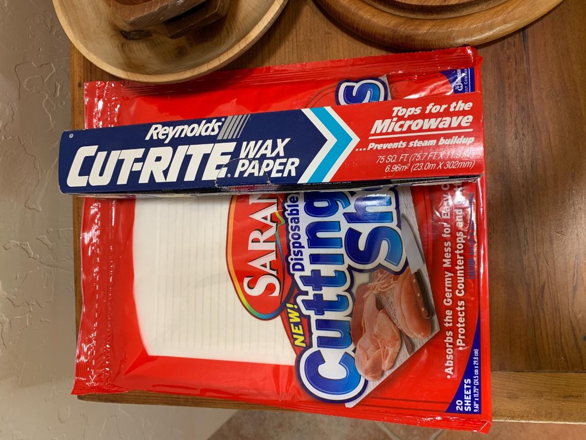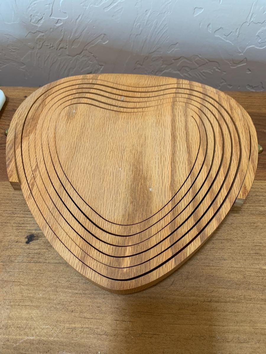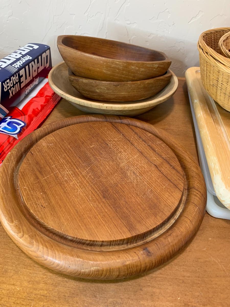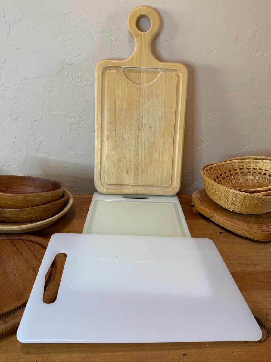 One collapsable heart bowl, 2 gel cutting boards, 2 wooden cutting boards, 3 baskets and 2 boat shaped wooden bowls