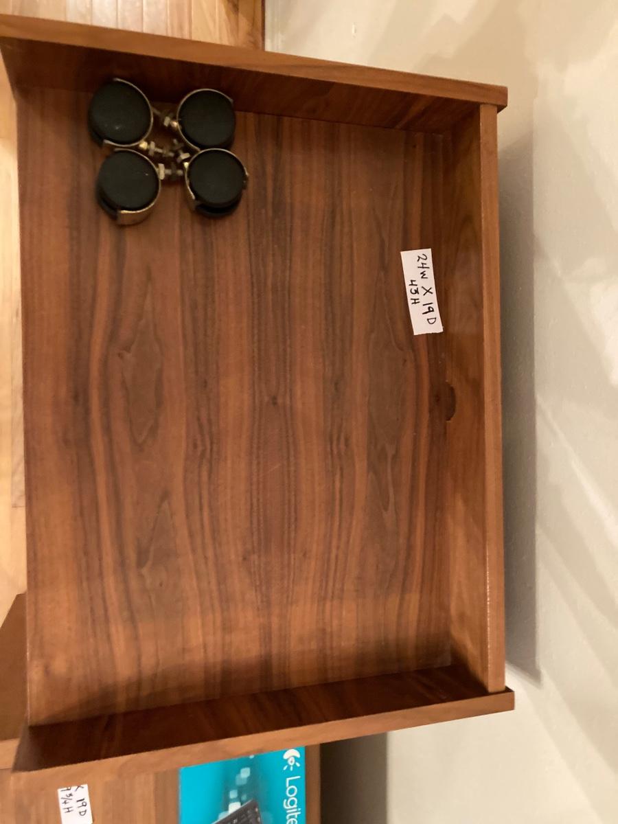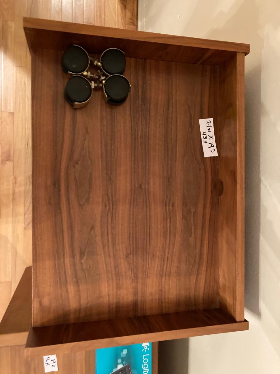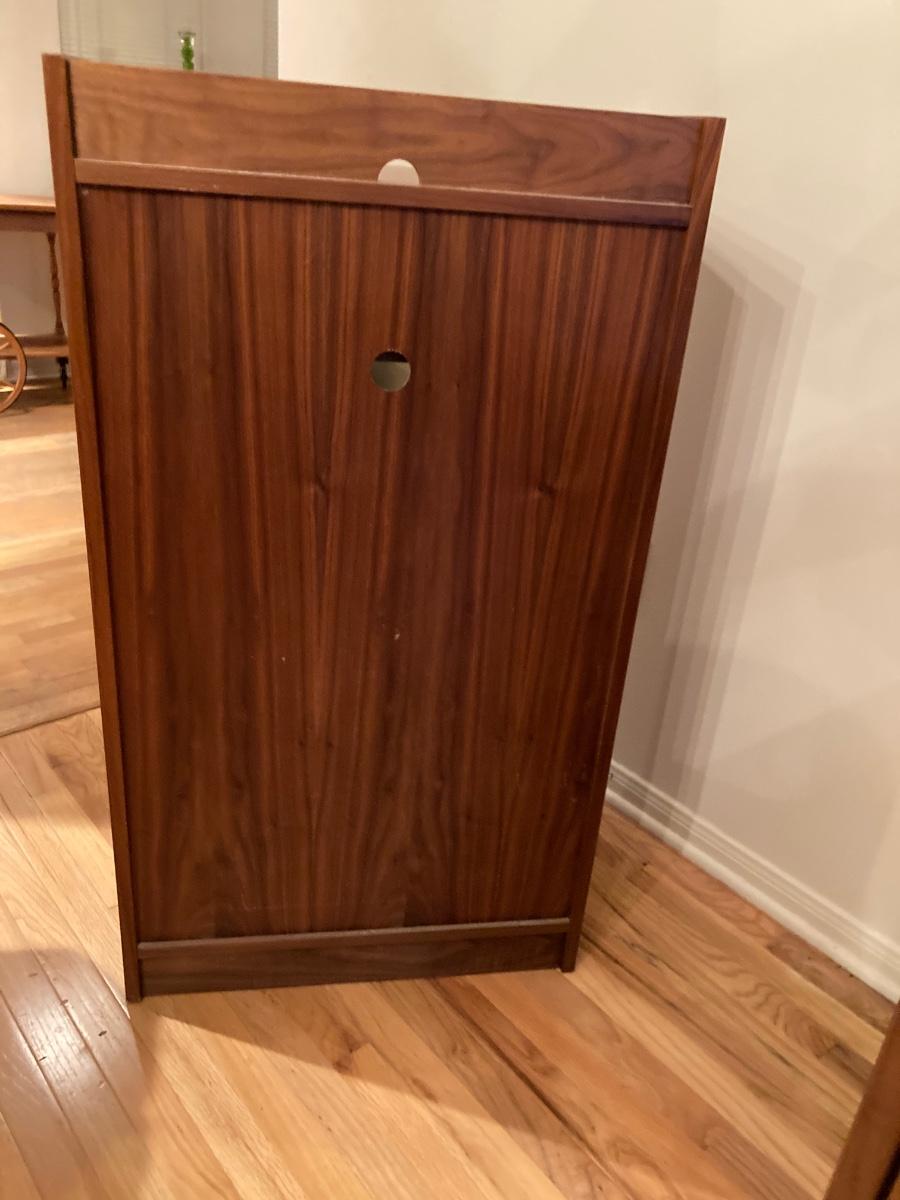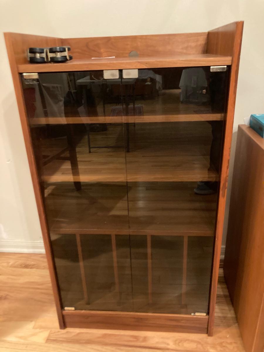 Vintage wood laminate stereo cabinet with glass doors, casters included. VG condition. 24 w X 19 d X 43 h