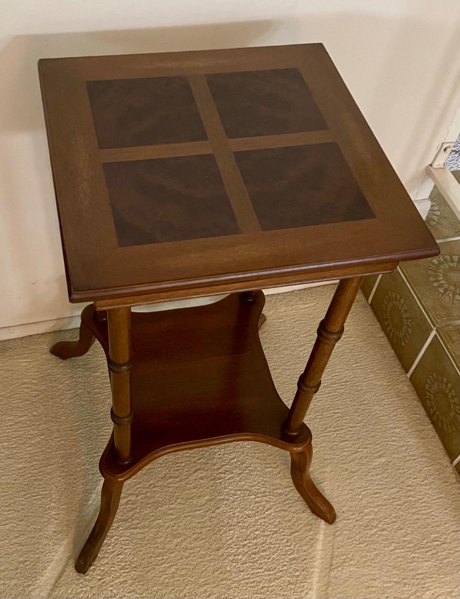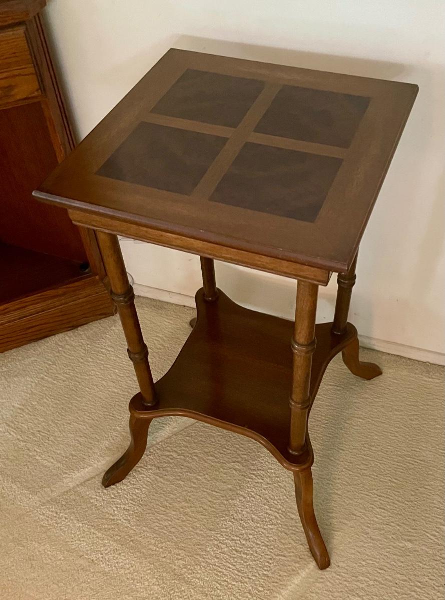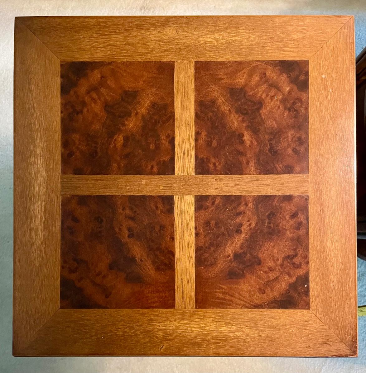 Particle board with wood vernier. Inlaid burl wood on top surface. Top measures 15” x 15”, 28” tall.