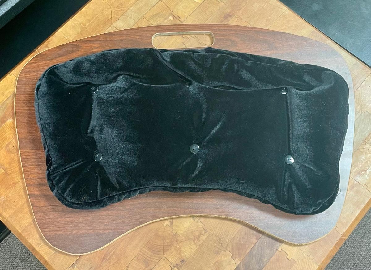 Lap desk with pillow cushion on bottom. Desk is contoured to make it easier to use in bed.