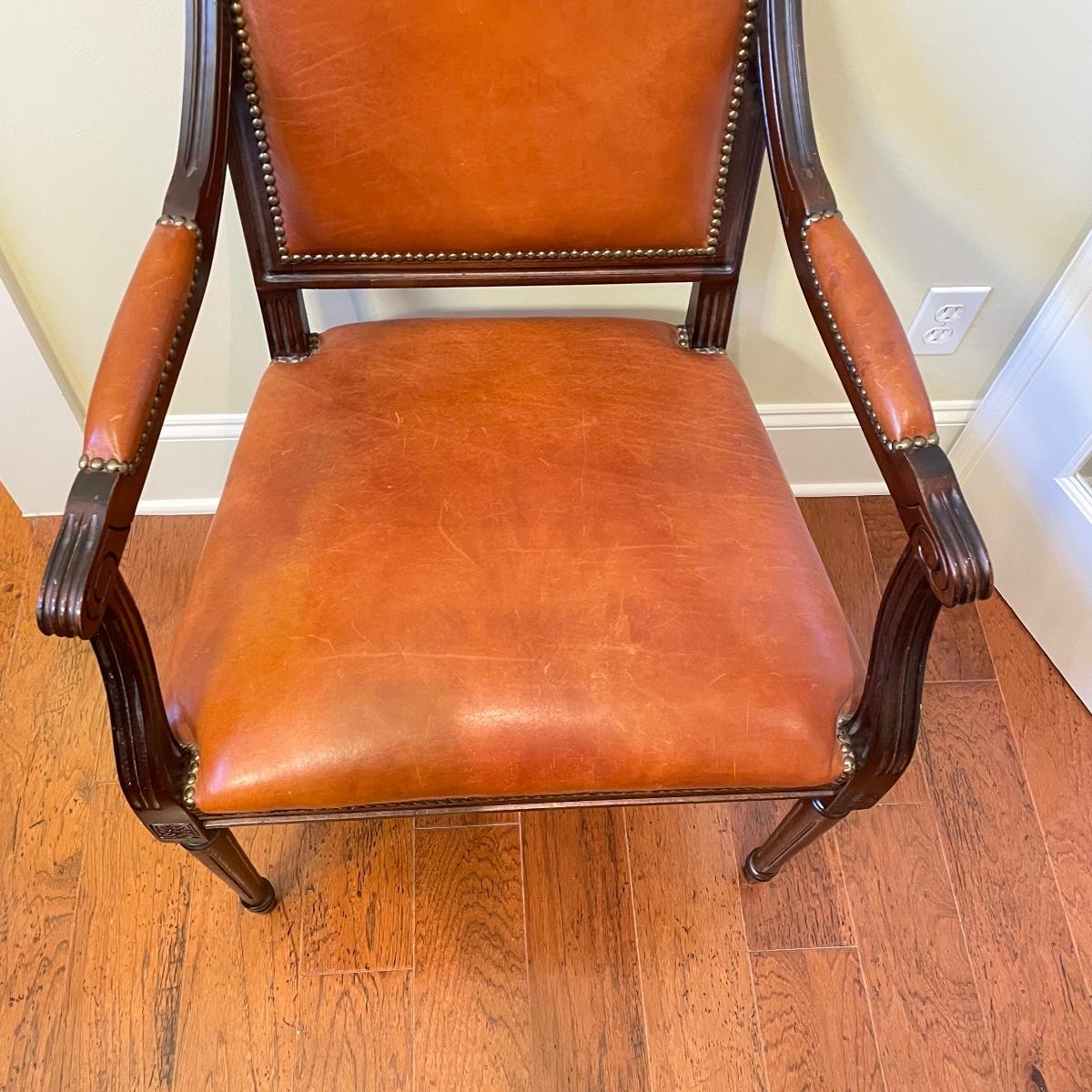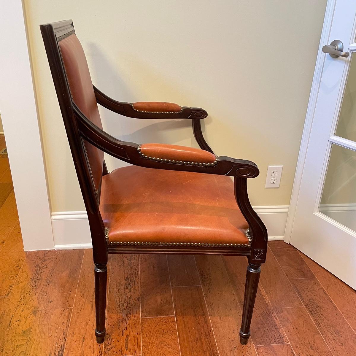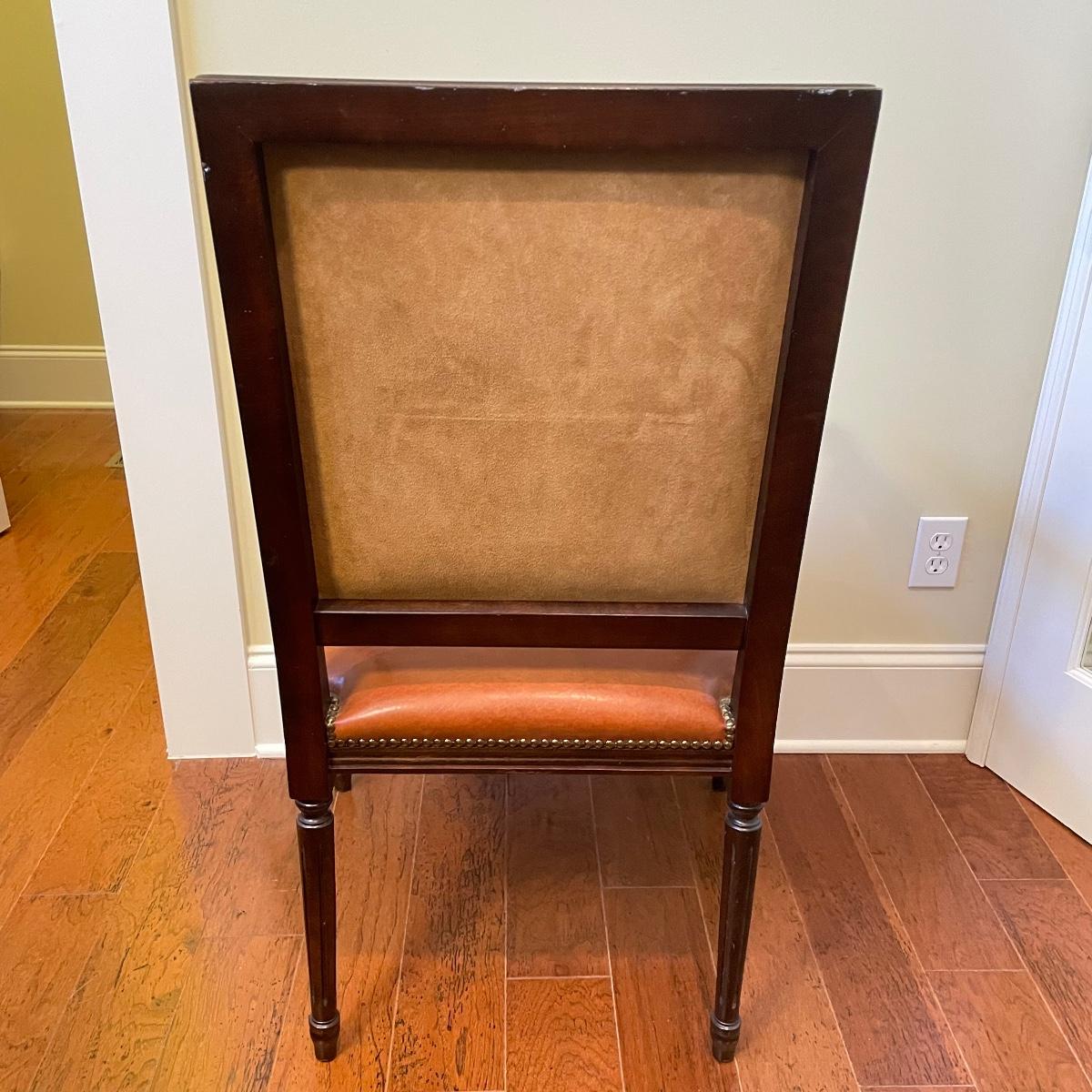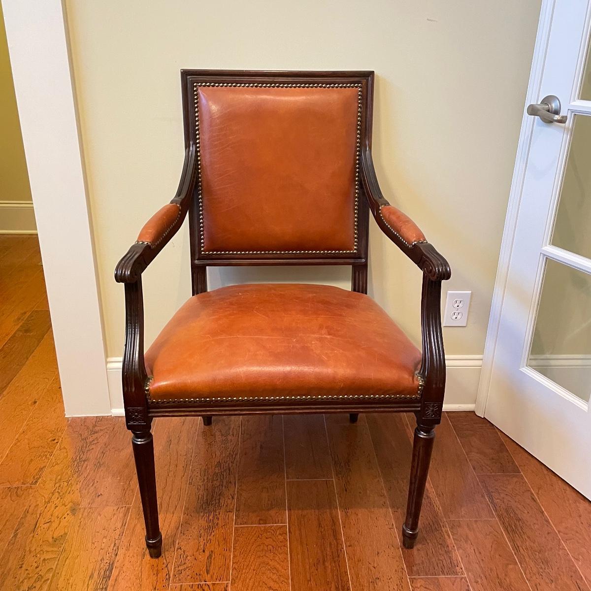 Nicely carved wooden arm chair with leather and suede. The upper back of the seat is suede with orange toned leather seat, back and arms. Chair measures 25” x 23” x 39” with a seat height at 20”. Local pick up only.